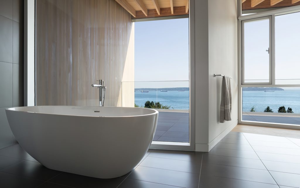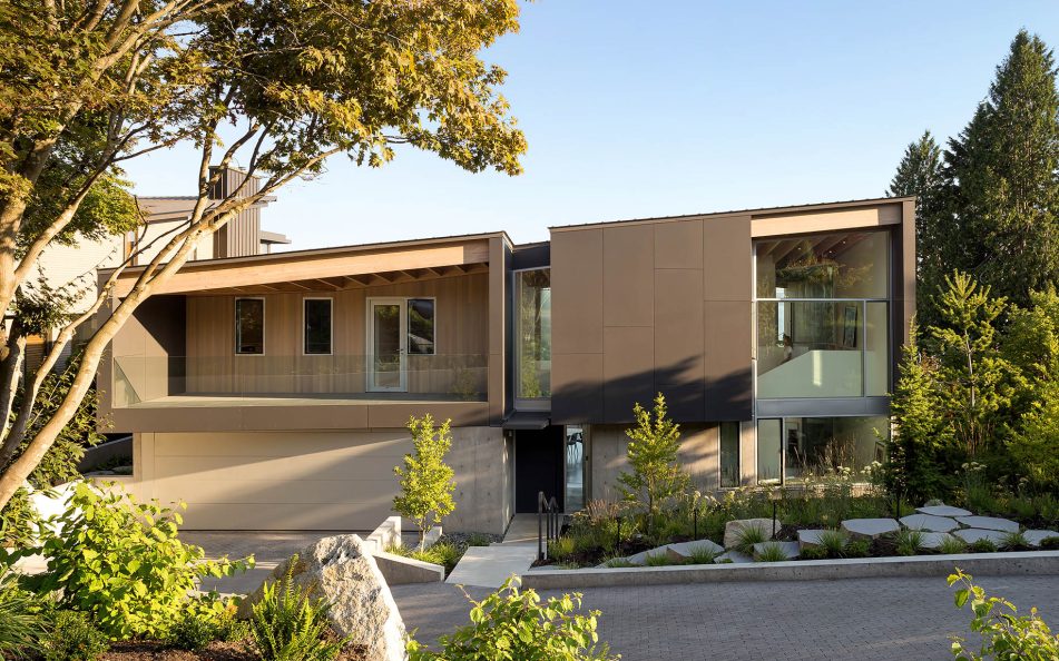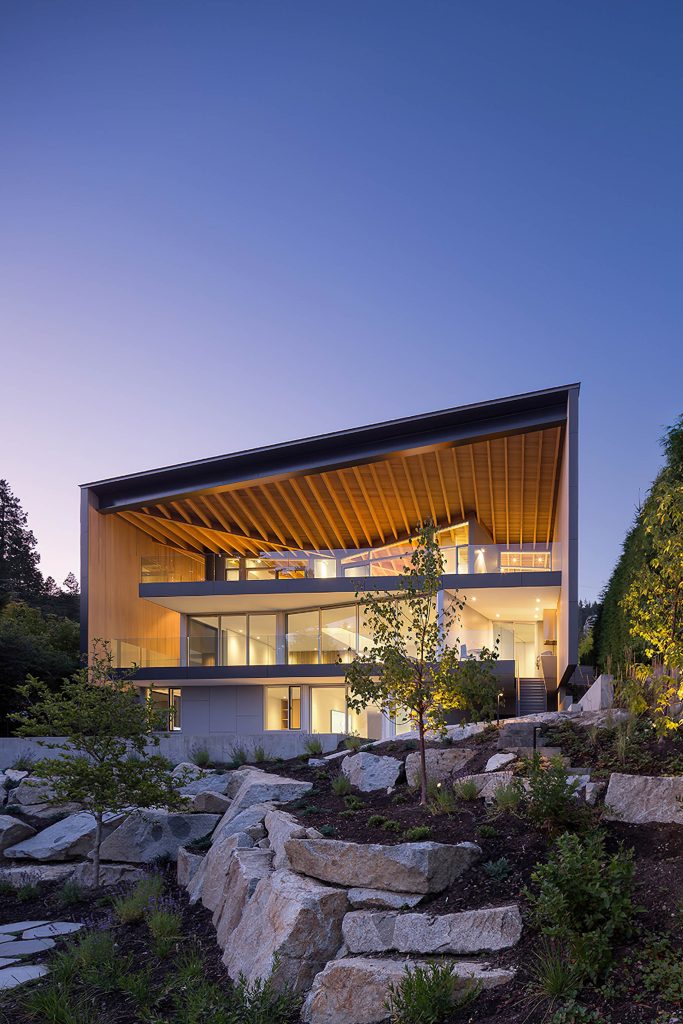 Extraordinary in every respect, Thompson House is a modern luxury West Vancouver residence designed to capture stunning Ocean views of Burrard Inlet and the harbour in one direction and the North Shore mountains in the other, while controlling sightlines to and from the neighbours on either side. Like the wings of a bird stretched out to protect its young, the two side walls and roof on the south elevation of the structure extend far past the exterior walls, providing privacy and large covered decks.