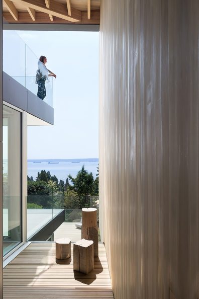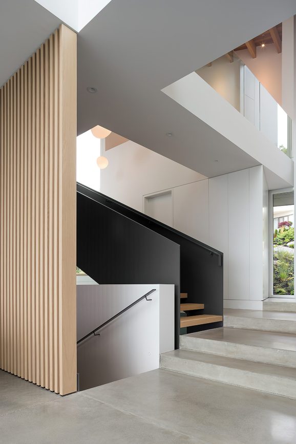 Upon entry into the home, space rises up and momentarily draws attention away from the straight shot ocean view ahead, and upwards towards the wall-to-wall skylight and exposed heavy timber rafters โ a stark contrast to the rest of the light-coloured materials in the palette. Two bridges span this section and offer opportunities for spontaneous interaction and play, as family members cross and engage with those below.