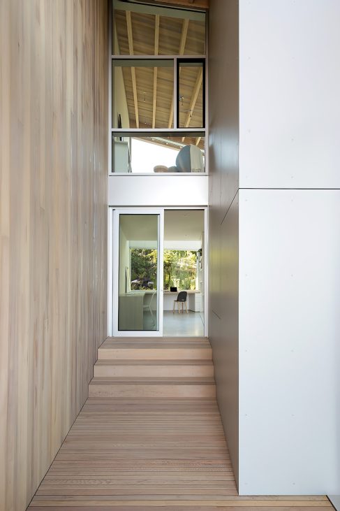 While the house is porous, open and social, it is also nuanced with layers and nooks that provide areas of retreat and solitude. A private office tucked behind the staircase, in the corner of the main floor, can suddenly change character and be part of the adjacent living space by way of an unexpected sliding wall panel. With framed views of the ocean and mountains, an enlarged stair landing on the upper floor, lined with bookshelves, becomes a natural spot for a one person library.