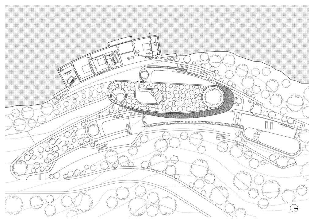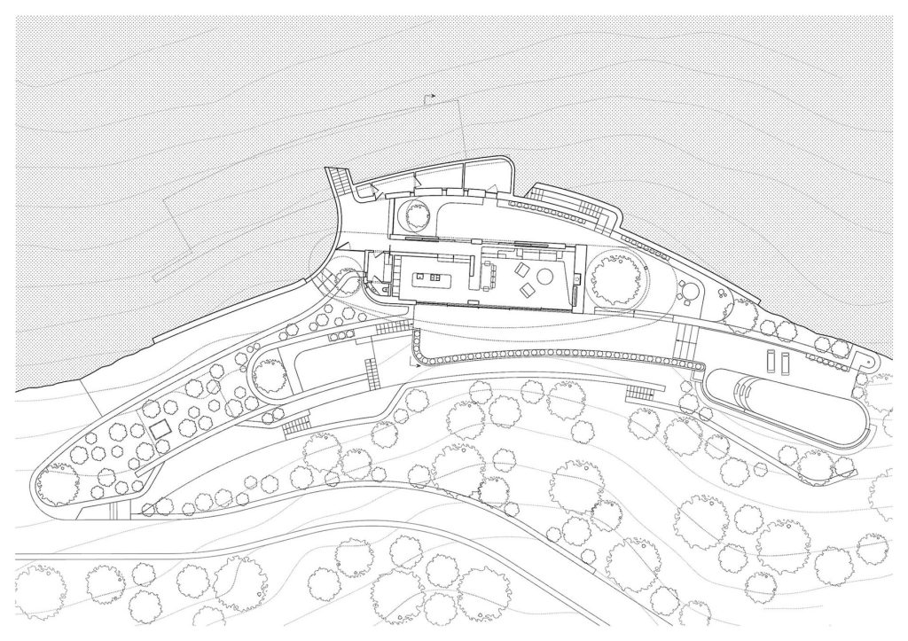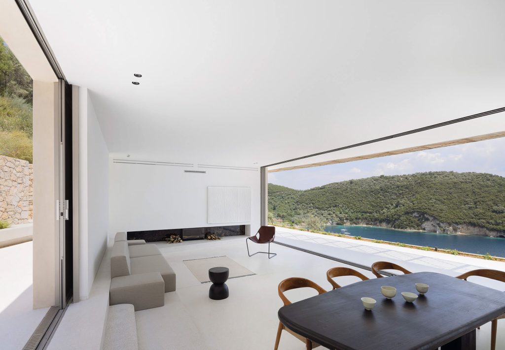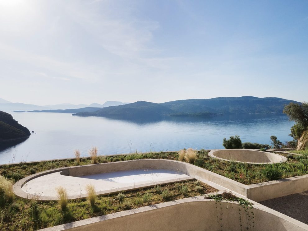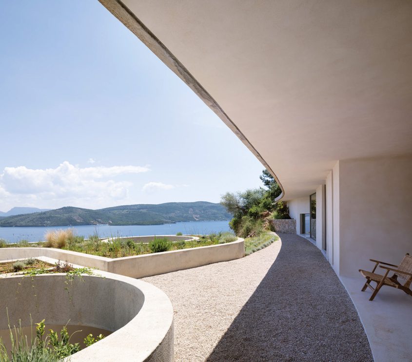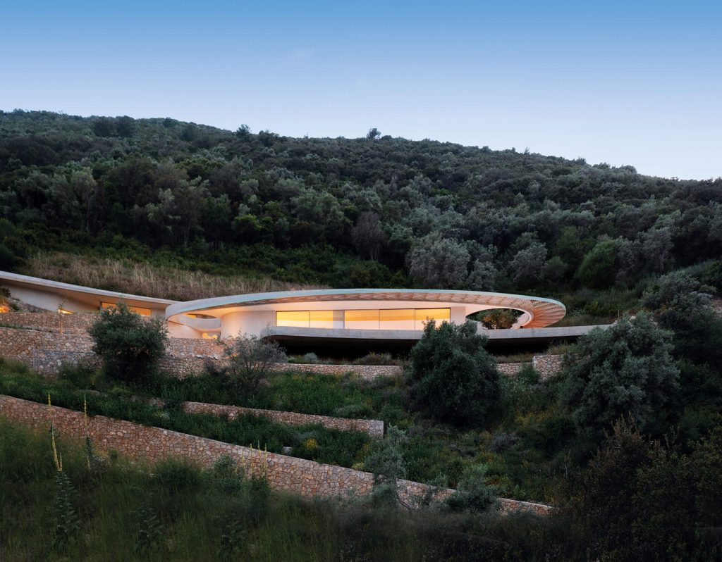 Thyta House, designed by LASSA Architects, integrates seamlessly with its mountainous surroundings, with a sleek, elliptical form shaping the living areas and complementing the sloping terrain. The design reduces the visual impact from the sea, utilizing overlapping volumes and underground elements, while a planted roof and shaded courtyard provide natural cooling and protection from the sun, minimizing the need for artificial climate control.