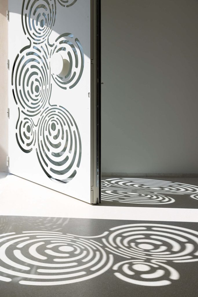 The house is designed to create a seamless transition between indoor and outdoor living. The expansive living room, framed by large sliding glass doors, opens up to a courtyard, terraces, and a pool, inviting residents to enjoy the outdoors. The home’s curved lines and carefully placed oculi in the roof highlight the natural beauty of the surrounding landscape, while the upper floor connects three bedrooms to a private roof terrace. The natural flow of spaces creates a continuous experience, with each room framing a different aspect of the landscape, whether it’s the rugged mountains, olive groves, or sparkling sea.