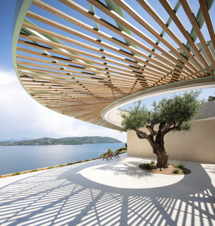 Thyta House, designed by LASSA Architects, is a striking architectural retreat situated on the breathtaking island of Lefkada, Greece. Perched on a hillside blanketed with olive trees and wild vegetation, this home offers unparalleled views of the Ionian Sea. The structure blends seamlessly into its surroundings, with its elliptical silhouette shaping the communal areas and the bedroom spaces integrated into the natural topography. The home’s design is both functional and sustainable, featuring planted roofs that reduce the need for heating and cooling, and a column-free pergola that frames panoramic views while offering natural shading.