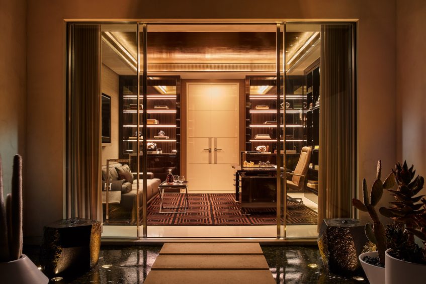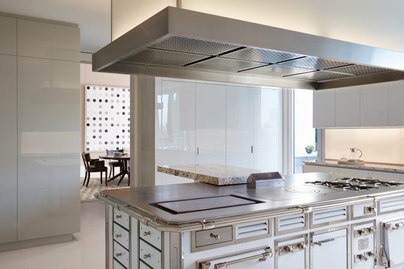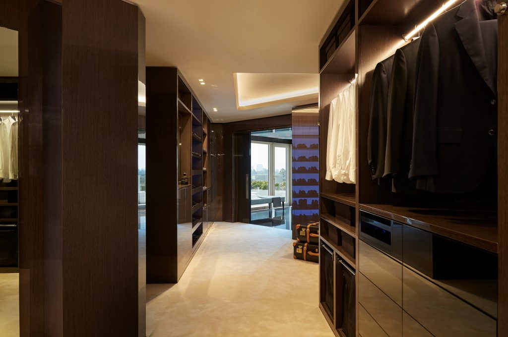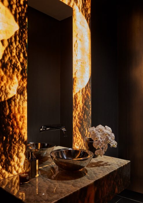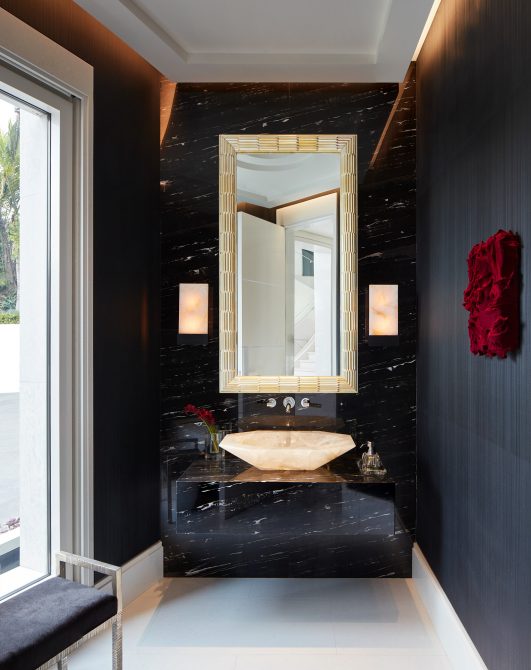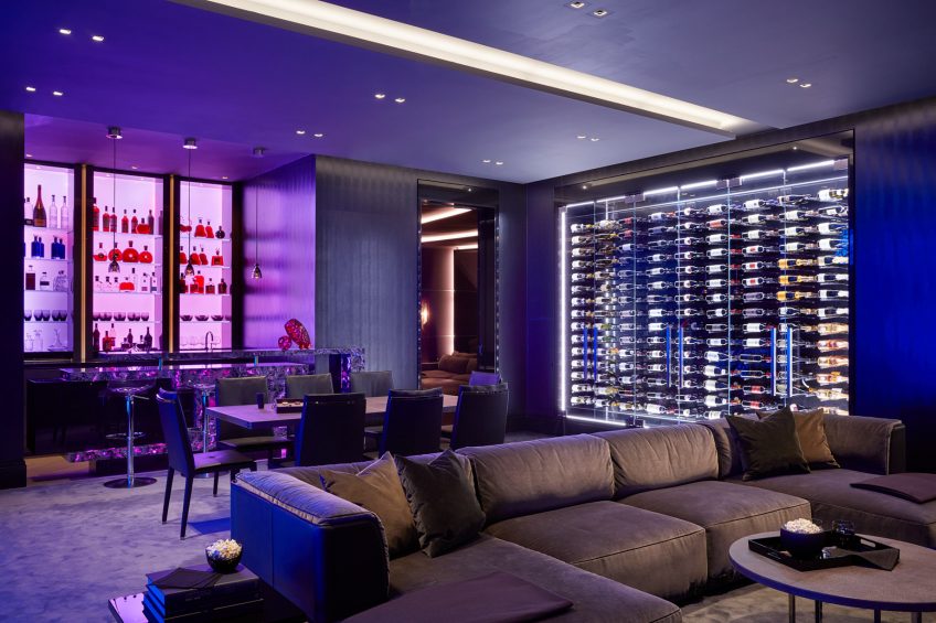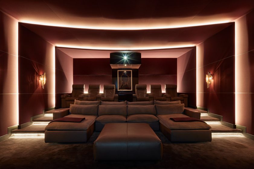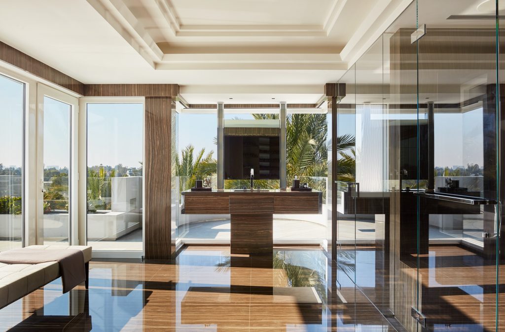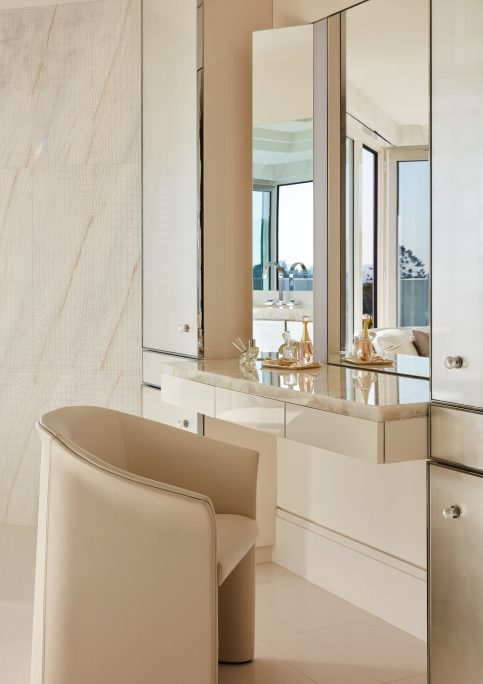 Inside, each of the six bedrooms and nine bathrooms is defined by a refined mix of sleek finishes and bespoke detailing. The entire upper floor is dedicated to a private primary suite with dual bathrooms, oversized closets, a fireplace lounge, and a balcony that floats above the views. Art, architecture, and functionality are central to the design, with interiors curated by Magni Kalman Design and accented by sculptural furnishings, including Hadid’s Mercuric coffee tables and a bathroom fitted with a solid quartz tub and Lalique fixtures. On the lower level, amenities cater to both quiet luxury and everyday living: a cinema, bar, wine cellar, spa with massage room, and gym provide spaces to relax or entertain. Durable materials and custom finishes were thoughtfully chosen to accommodate family life without compromising the home’s bold aesthetic.