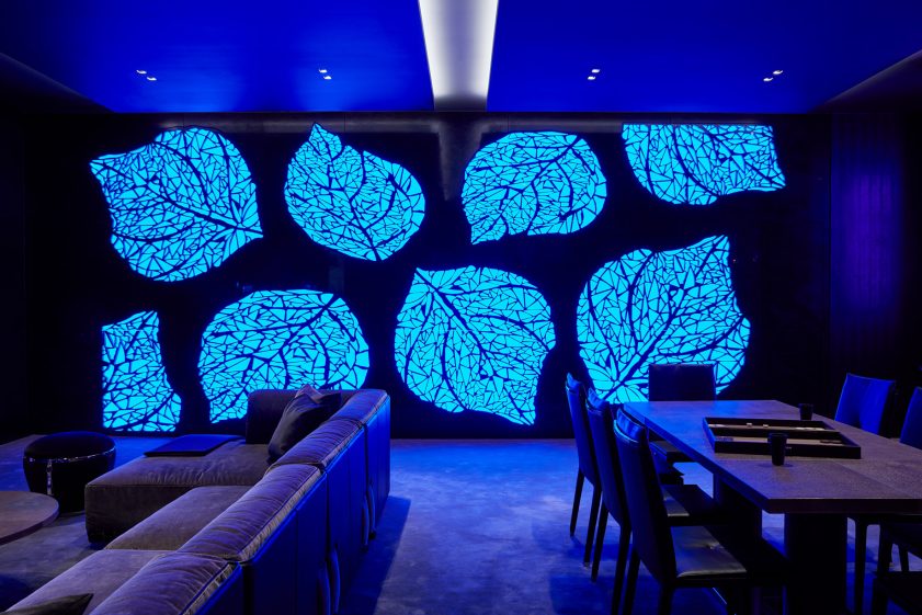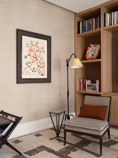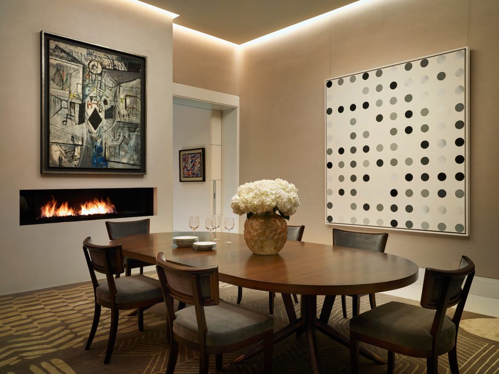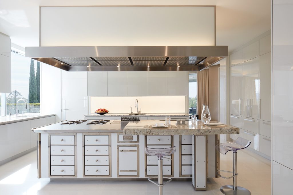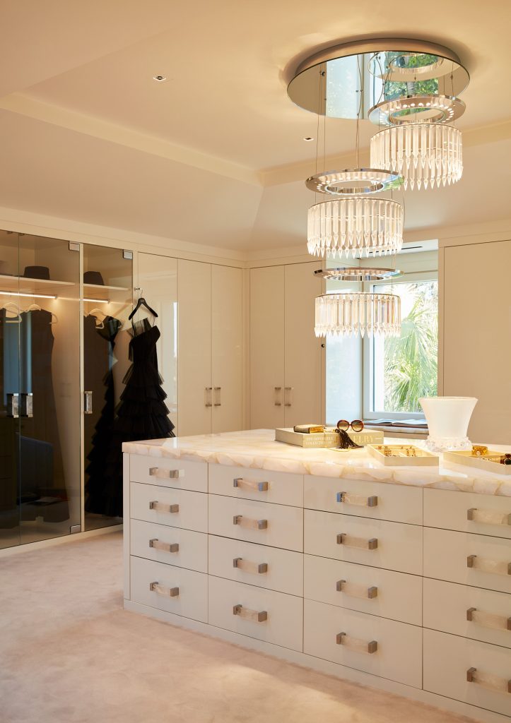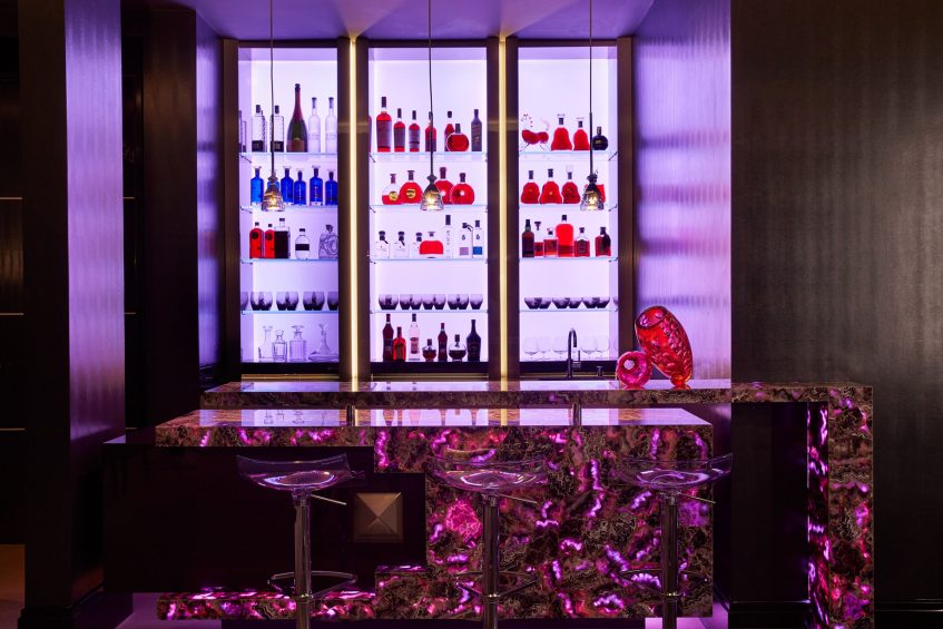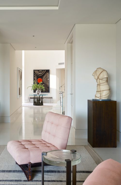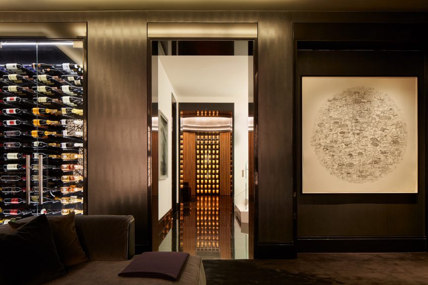 Inside, each of the six bedrooms and nine bathrooms is defined by a refined mix of sleek finishes and bespoke detailing. The entire upper floor is dedicated to a private primary suite with dual bathrooms, oversized closets, a fireplace lounge, and a balcony that floats above the views. Art, architecture, and functionality are central to the design, with interiors curated by Magni Kalman Design and accented by sculptural furnishings, including Hadid’s Mercuric coffee tables and a bathroom fitted with a solid quartz tub and Lalique fixtures. On the lower level, amenities cater to both quiet luxury and everyday living: a cinema, bar, wine cellar, spa with massage room, and gym provide spaces to relax or entertain. Durable materials and custom finishes were thoughtfully chosen to accommodate family life without compromising the home’s bold aesthetic.