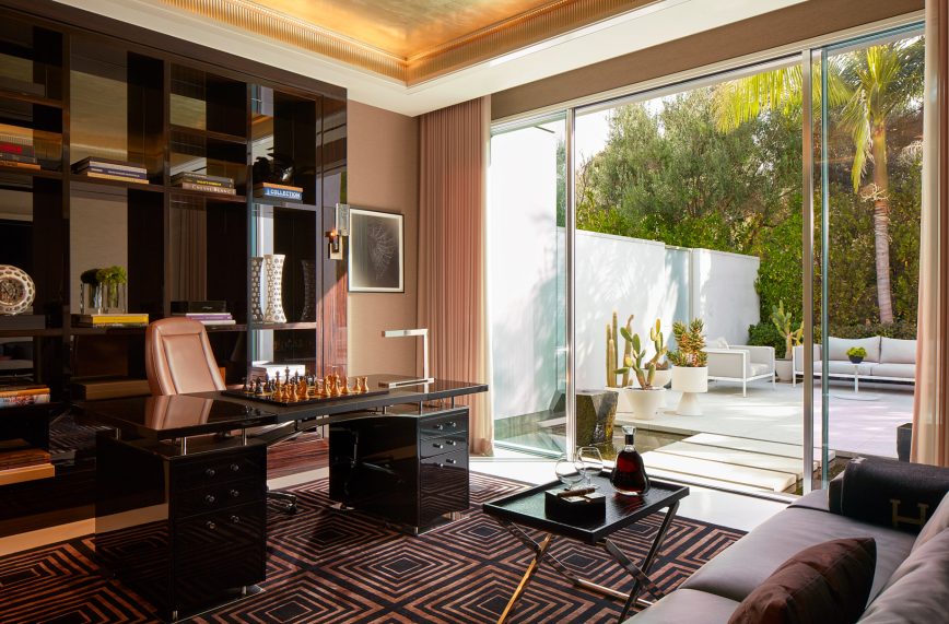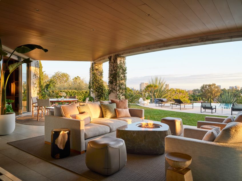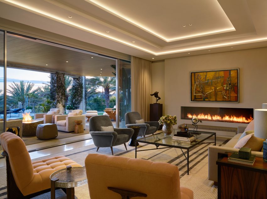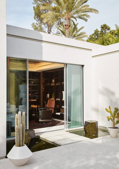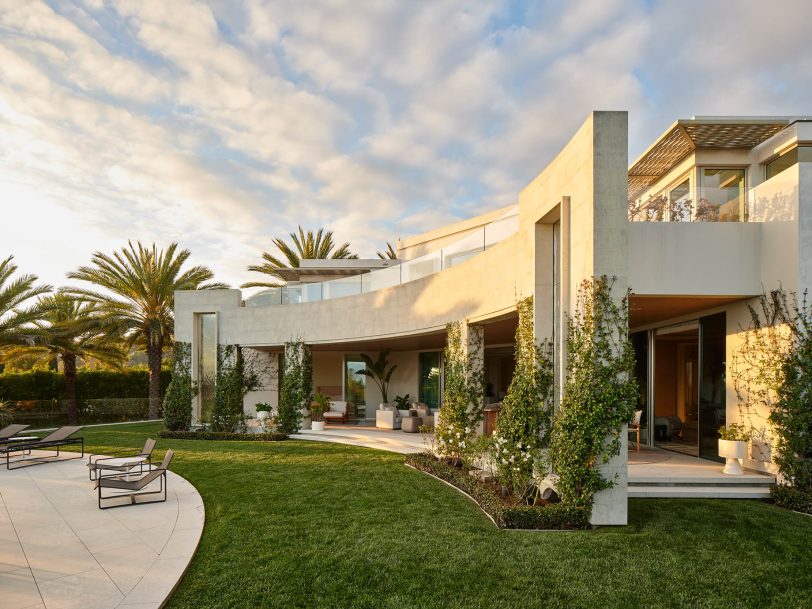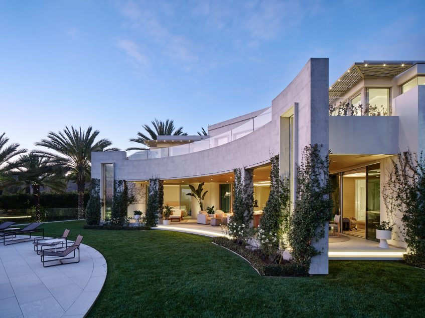 Landry, known as the “king of the megamansion,” approached the rebuild with clean geometry and softened massing to correct the home’s original odd angles and low ceilings. Long curved walls were introduced to guide the flow, while expansive glass elements flood the interiors with California light. The landscape, designed by Robert E. Truskowski, mirrors the home’s sculptural ethos, surrounding the rear terrace and infinity-edge pool with curated pathways and greenery. A long-gated driveway ensures privacy, opening to a dramatic entryway that frames both art and architecture. With its rare blend of iconic design, international collaboration, and luxurious functionality, this home sets a new benchmark for high-end luxury real estate in Beverly Hills.