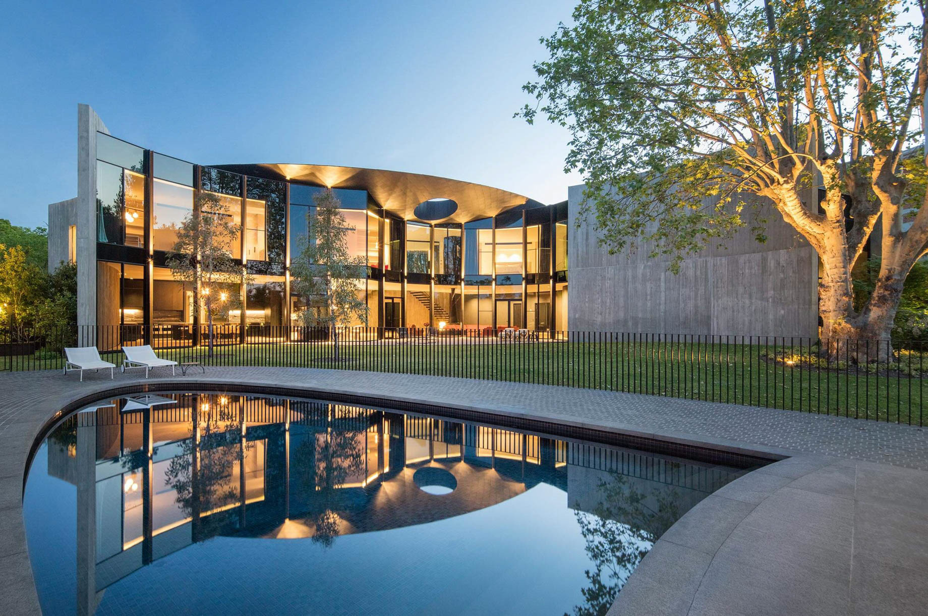 The Towers Road House redefines the boundaries of residential design, standing as a bold expression of modern contemporary Australian architecture in Toorak. Designed by Wood Marsh, this modernist property harmoniously merges sculptural form with functional elegance. Its iconic faรงade features sweeping arcs of raw concrete imprinted with the grain of Oregon timber, creating a textured surface of striking natural beauty. These monumental walls curve around the sloping site, eliminating conventional boundary fencing and extending landscaped gardens to the street, fostering a seamless interplay between public and private realms.