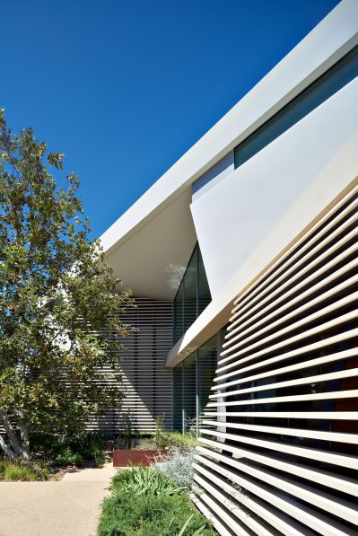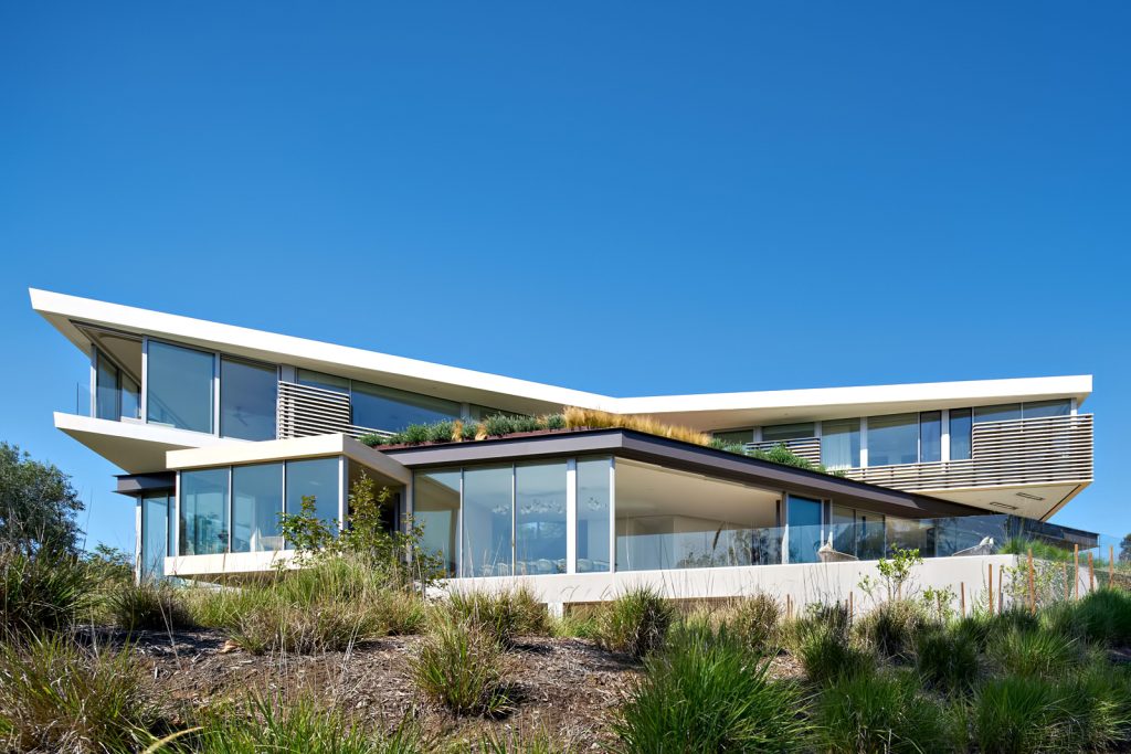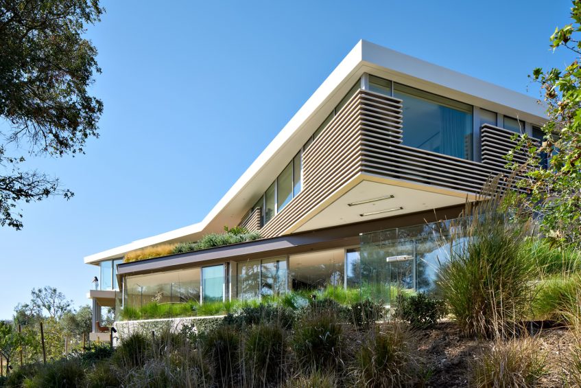 The Tree Top Residence luxury estate celebrates the site’s complex landscape, merging seamlessly within the landscape and emerging from atop the canopy of trees that surround it. Built along a natural ridgeline, the long and narrow plan of the three-story house compound mimics and inverts the angles of the site’s topography, creating dynamic vertical and horizontal relationships.