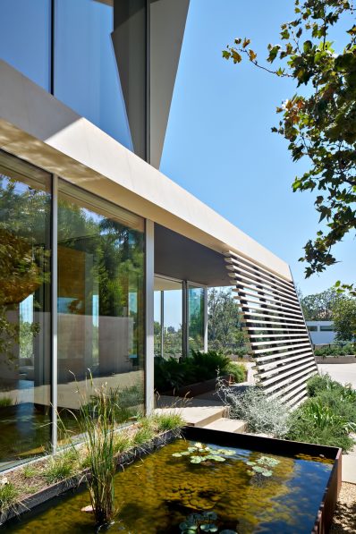 Hidden from the street, the residence is insulated from its neighbours, but open to its site. Canted limestone louvers, and dense planting on the north facade shield the interior from the closest adjacent neighbour. Conversely, the rest of the building opens to the site with floor-to-ceiling glazing, relying on both the house’s generous distance from the property line, and the densely wooded valley below to create a natural screen. The orchestration of this view, overlooking a dense canopy of trees, embodies the intent to offer respite from the city below.