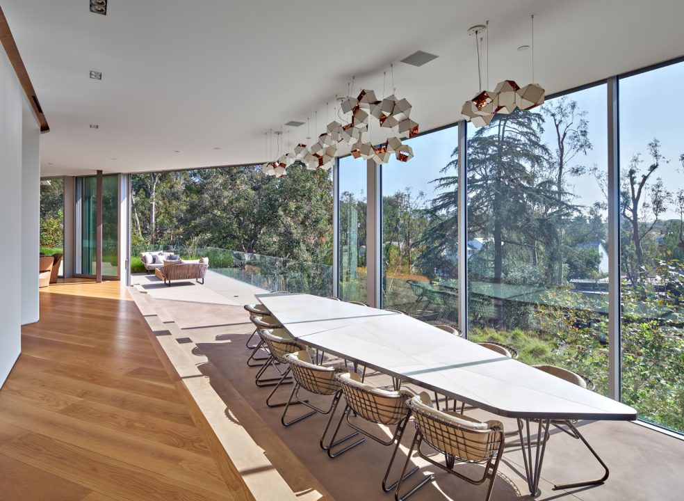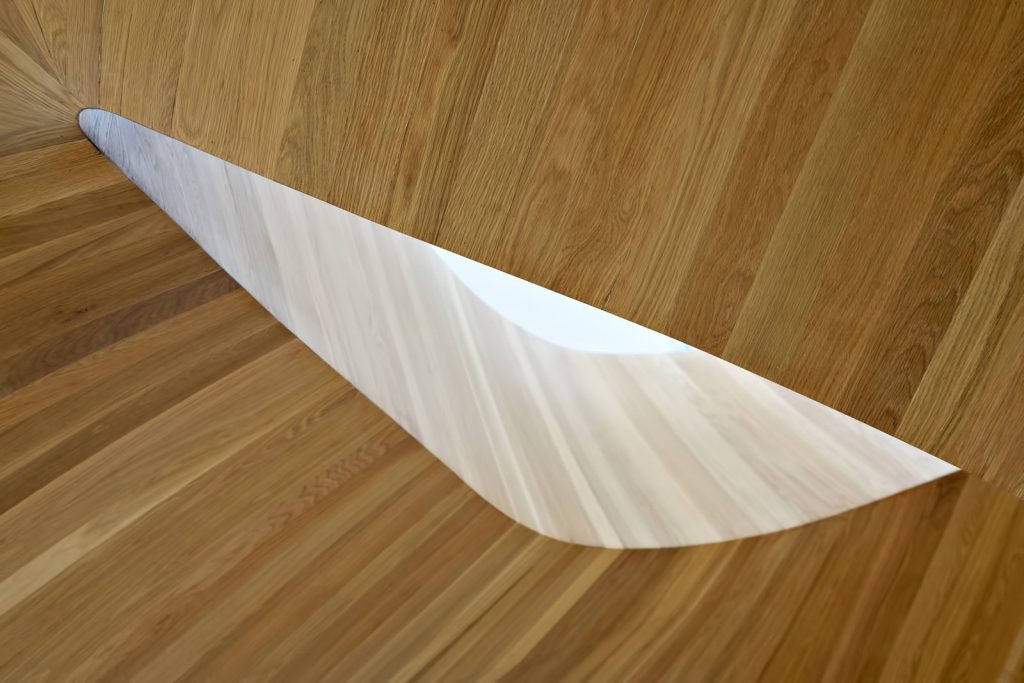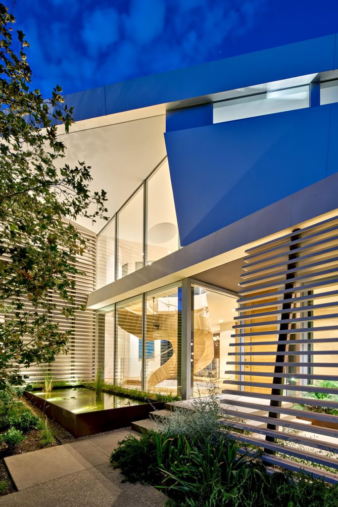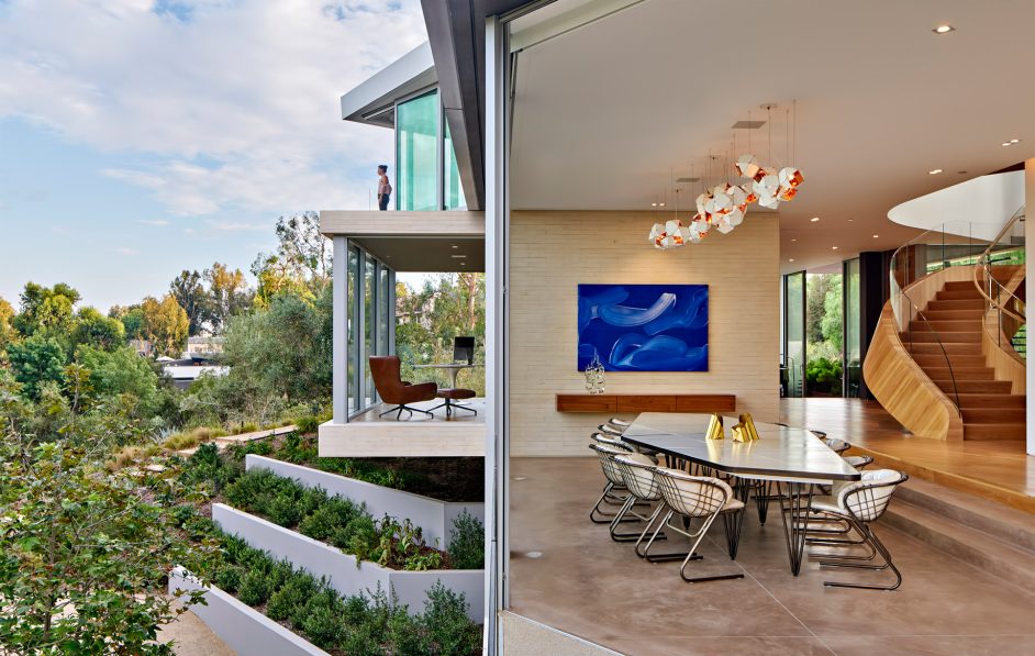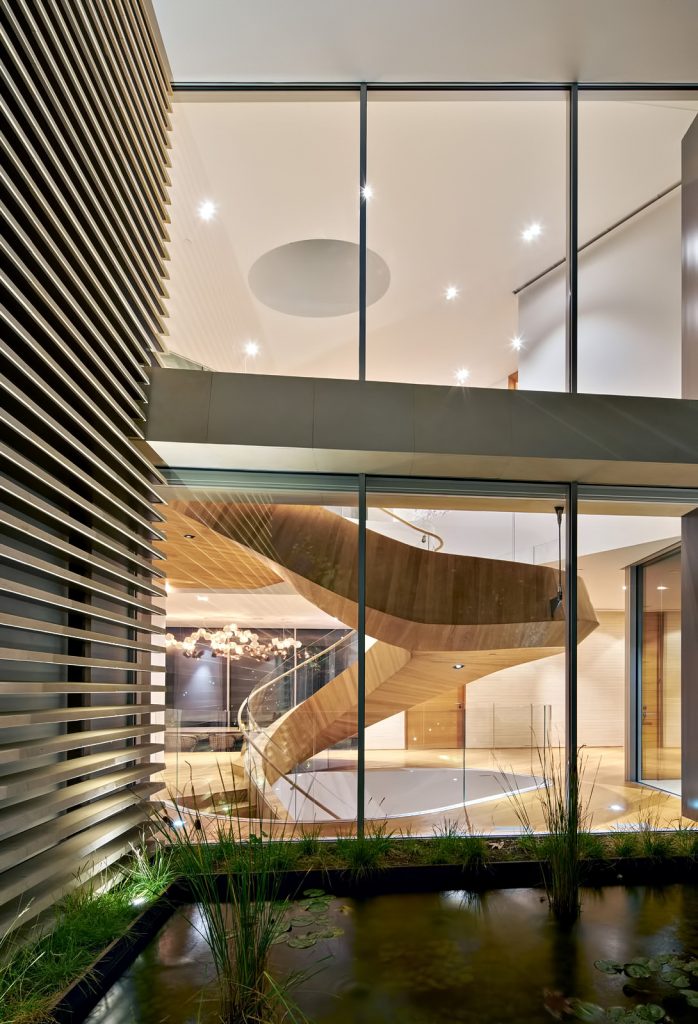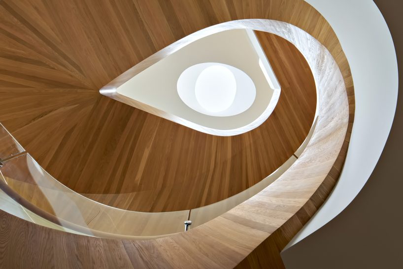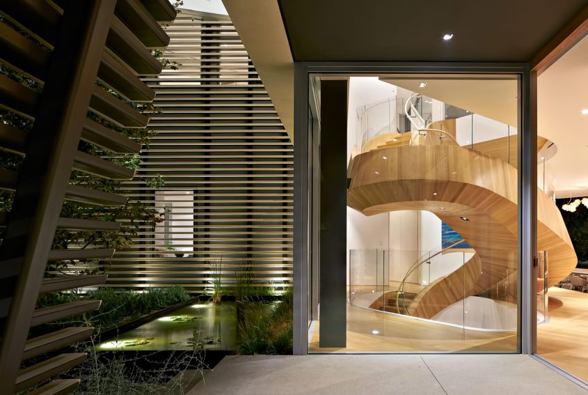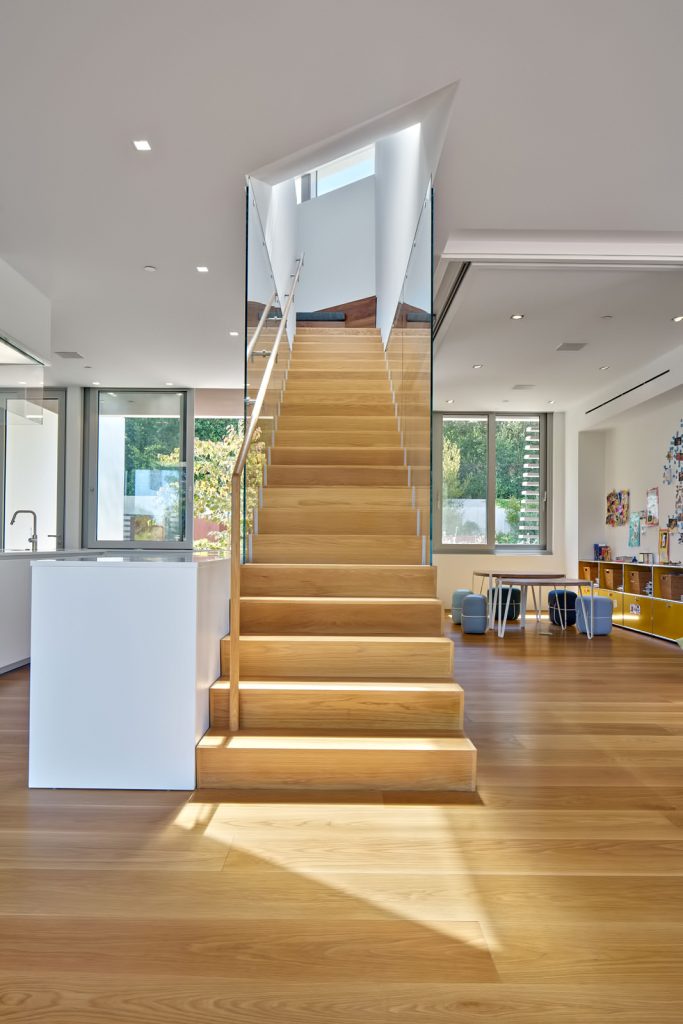 Vertically, an eccentrically helical stair functions as a primary organizing element and a sculptural gesture upon entry into the house. On the ground floor, it acts as a threshold into the open plan; on the floor above, it separates the master suite and children’s quarter, while providing a light well to the basement. Horizontally, walls are used sparingly in favour of fluidly connected spaces. Movement and views between dining areas, kitchen, play and gathering spaces are uninterrupted, and floor-to-ceiling sliding glass doors blend the interior with the outside.