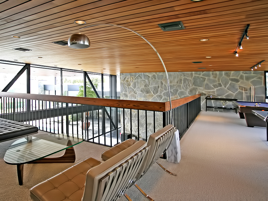 Step into an abode where chic design meets iconic inspiration. This space seamlessly combines rustic stone walls with sleek, contemporary glass partitions, allowing natural light to illuminate both the cozy bedroom and the sophisticated corridor. Dominating the scene, a striking monochromatic artwork of legendary figure, Elvis Presley, evokes a sense of nostalgia and class, while the deep wood ceiling complements the overall warm ambiance. Elegance and modernity coexist, offering potential homeowners a glimpse of the unparalleled sophistication awaiting them. Experience the fusion of artistry and luxury living.