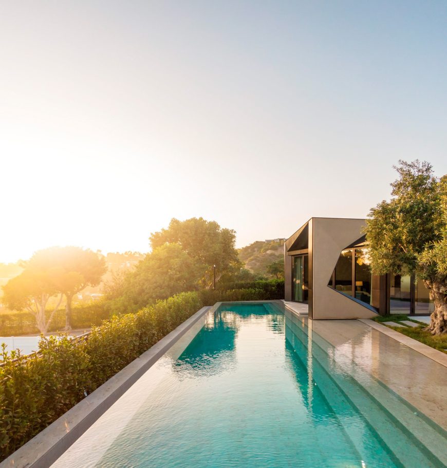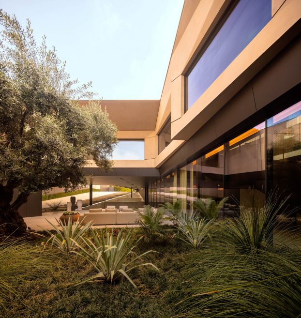 A home that is both shelter and sculpture, the Trousdale Residence is designed in the shape of a flying wedge. The home’s two upper wings stretch outward toward the horizon, housing private quarters and opening to cinematic views from downtown Los Angeles to the Pacific. At the heart of the plan lies a half-sunken, V-shaped courtyard, an architectural embrace that leads to a subterranean level conceived as a zone for cultural and intellectual exchange. Here, a 24-seat cinema, full spa, gym, and bar unfold like curated chapters in a narrative of refined living where every detail is intentional. Interior designers Nicole Hollis and Joan Behnke layer warmth and tactility over the home’s sculptural armor. The contrast is deliberate: where soft meets strong, and calm meets commanding.