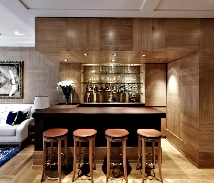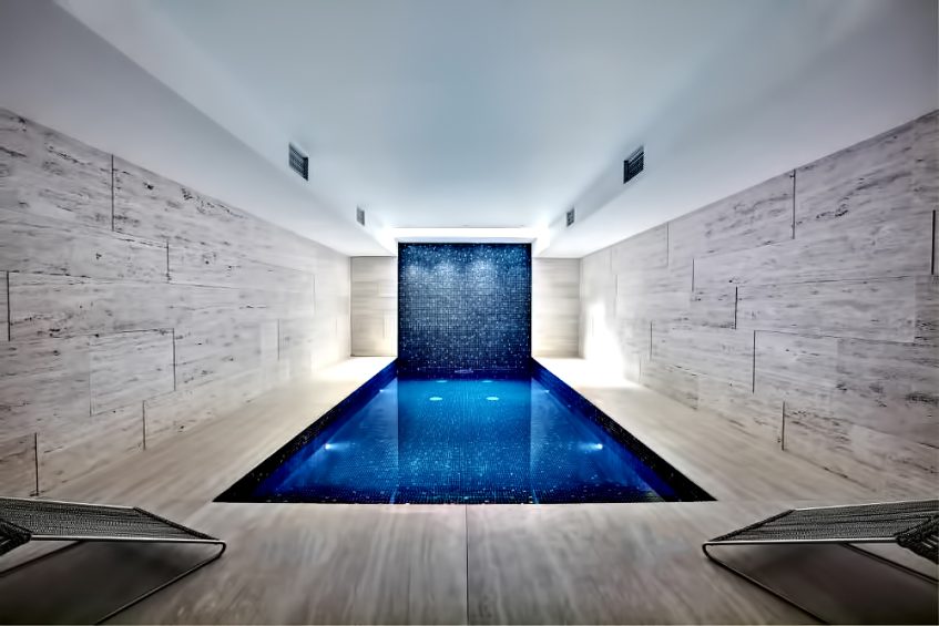 - Pool: Interior basement swimming pool clad in Bisazza Mosaico glass tile finishing with a water wall illuminated by skylight.