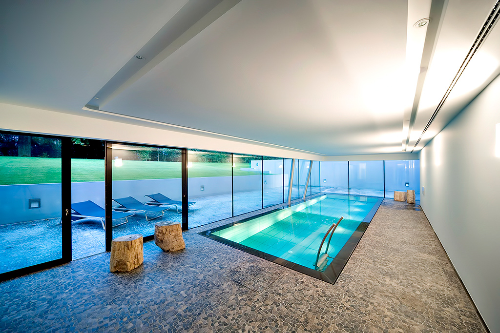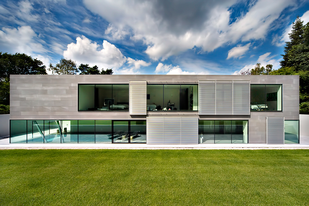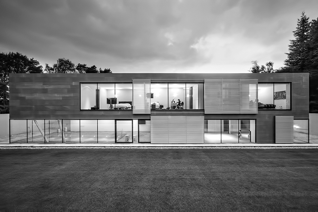 Characterized by the gray basalt stone facades with large glass surfaces and white steel louvers, the residence is a pure form intersected by a void, which crosses the house, as if it were pulled apart, allowing daylight to enter deeply within. The modern minimalist design has also been continued into the interior with an additional building layer created underground with a basement level swimming pool, sauna, home cinema, dance room, wine cellar and parking for several cars.