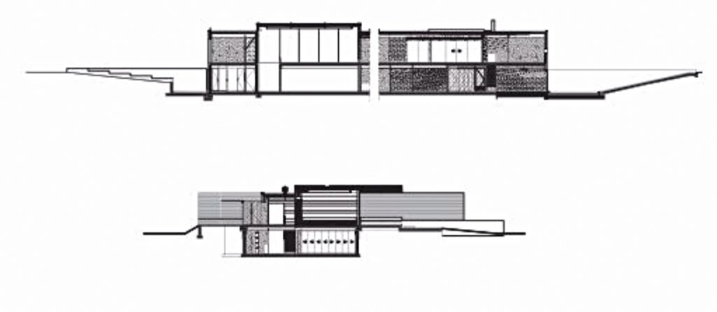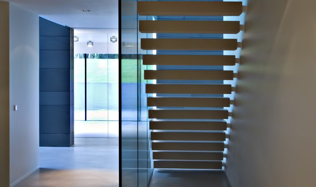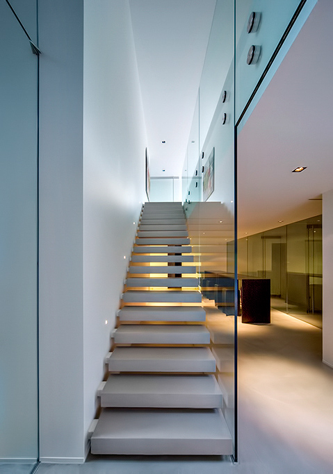 A vocabulary of overgenerous spaces encapsulates the interior with separate wings housing private and public realms. A rectangular living room separates the kitchen into one wing from the sleeping quarters in the other wing. The living room adjoins a large lounge terrace, surrounded by a white steel pergola. The unique forms and frames of the structure include the concrete steps of the stairs that seem to float, and embedded glass within the floor, without visible elements that hold it there as if it were invisible.