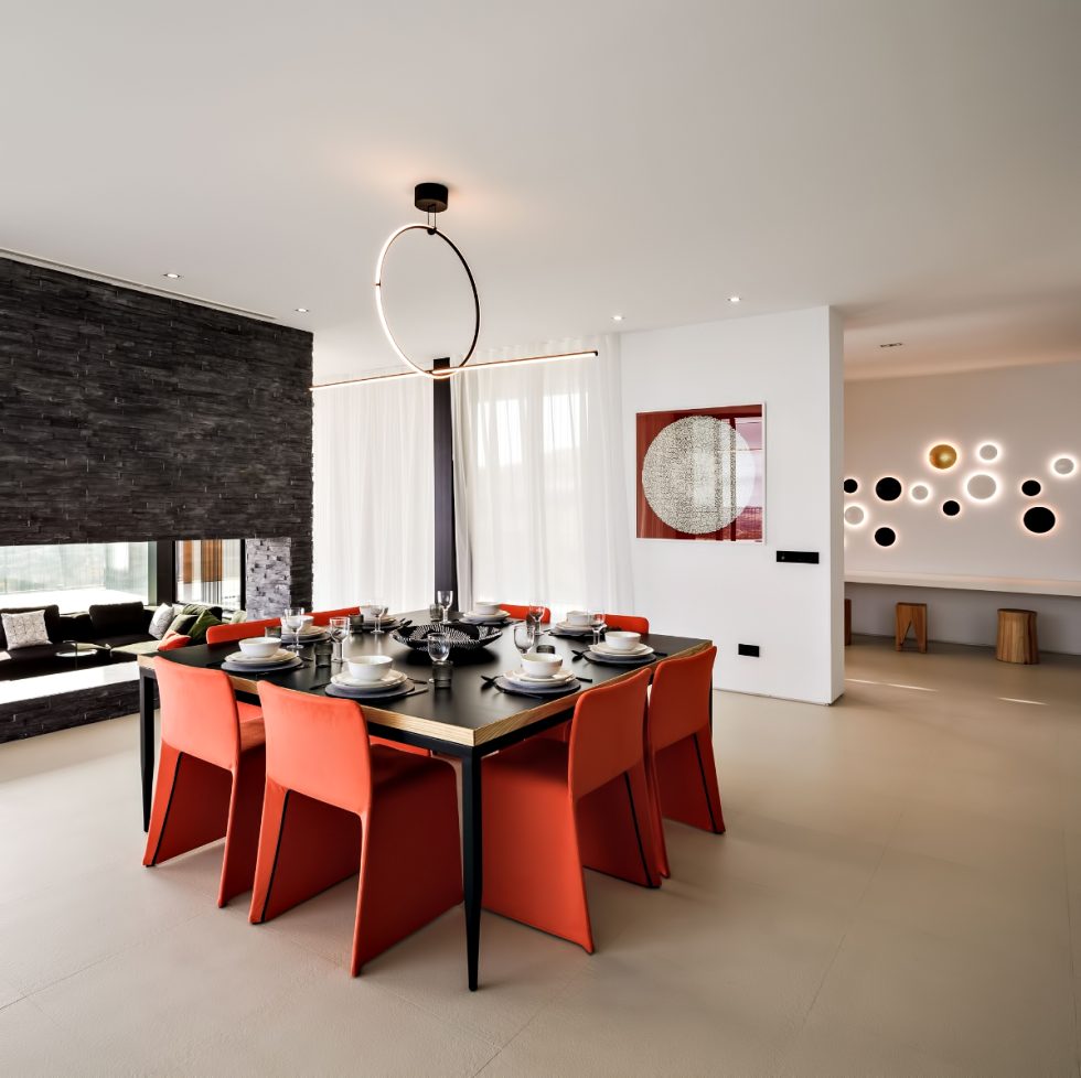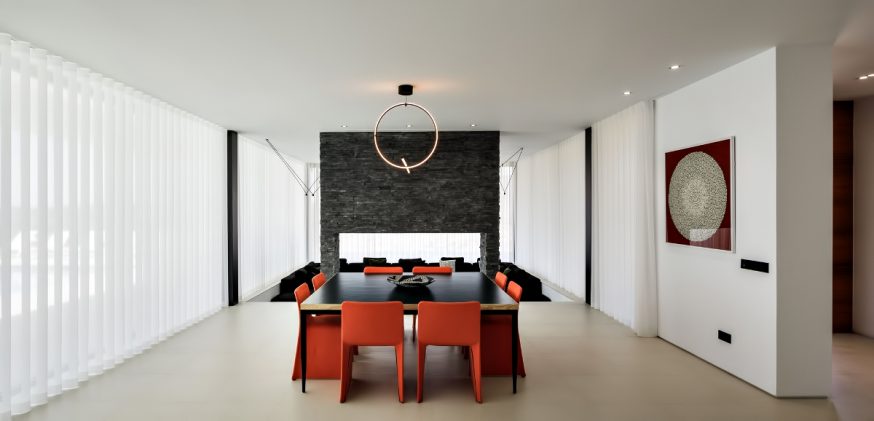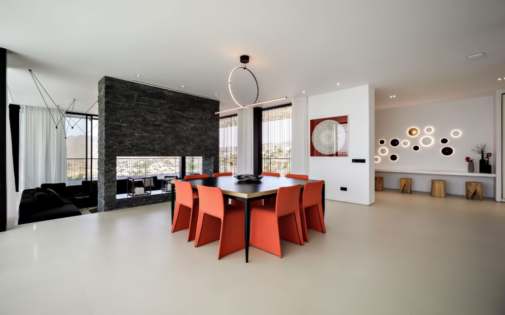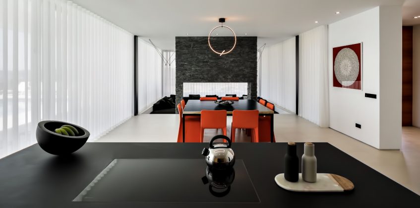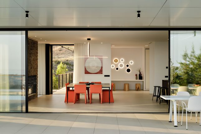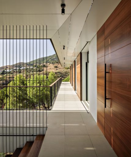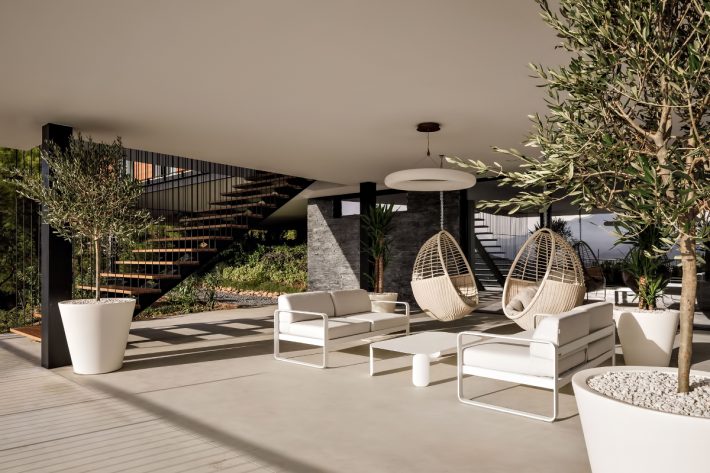 The resulting design is an L shaped platform. In one wing of the L there is an open living space, including kitchen and dining, which overlooks the swimming pool and from which you can also enjoy spectacular sea views. The other wing of the L is reserved for the more private and quiet area of the bedrooms. There are four hotel-like bedrooms that are each with en-suite bathrooms. The bedrooms all enjoy beautiful mountain views to the west and are embedded into the small pine tree wood.