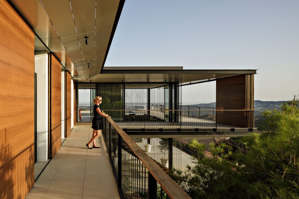 Wherever you are on the viewing platform you can step out onto the interconnected shaded terrace, inviting you to wander around the house. The lower level is cut into the hill creating a large exterior foyer, lounge and garden. The gym, cinema room and service areas are also located on this level. Access from the lower level onto the upper platform is via a generous wooden staircase which leads right into the center of the house. Visual screening between the public and private areas, on both levels, is provided by the fine vertical rods that surround the stairs. The lower level is cut into the hill creating a large exterior foyer, lounge and garden. The gym, TV room and service areas are also located on this level.