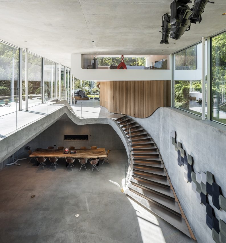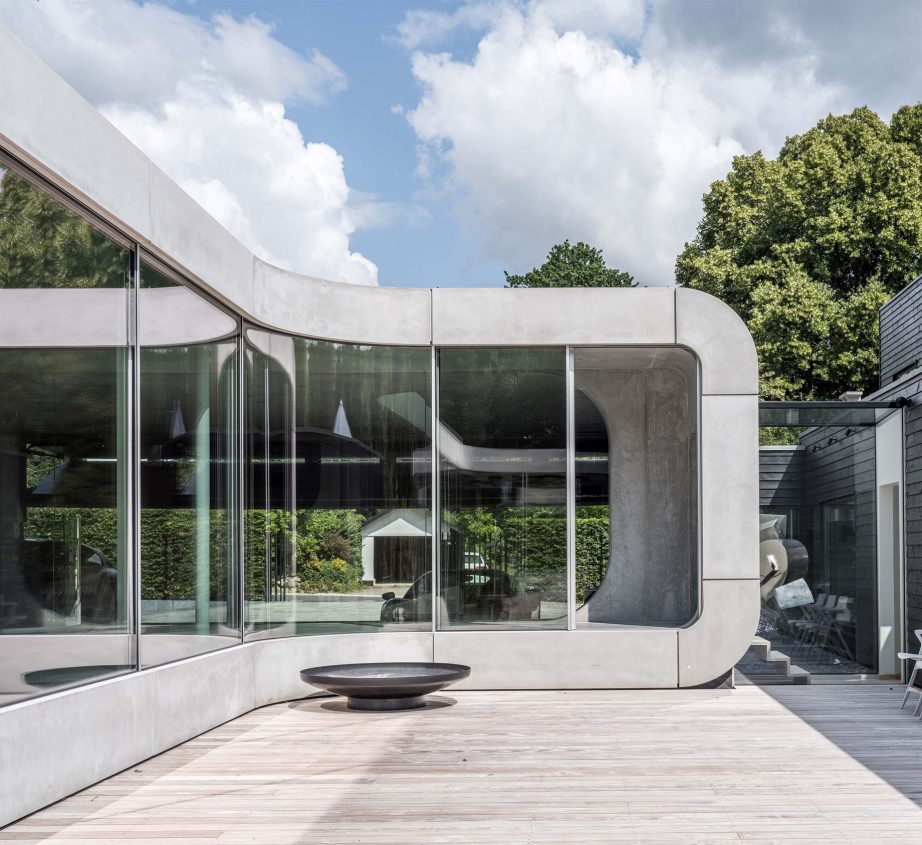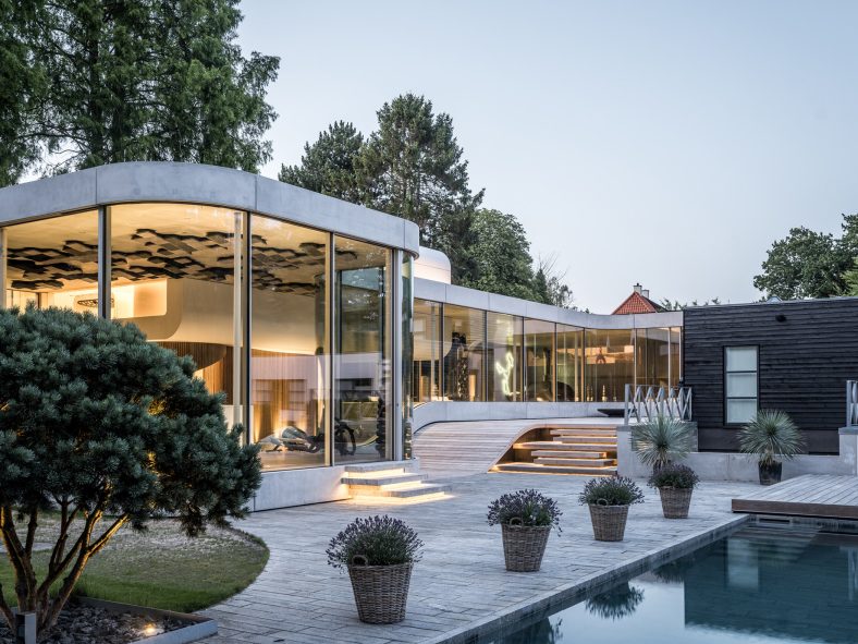 Villa Kirk, designed by SPOL Architects, redefines ultra-modern luxury with its futuristic extension in a Danish residence, just north of Copenhagen, blending influences from a ‘bat cave’ and a ‘man cave’ into a dynamic, surrealist-inspired structure reminiscent of a melted Salvador Dalรญ watch. The project, transformed a traditional residence into a statement piece that melds raw materials like concrete, steel, wood, and state-of-the-art glass walls structure into an expressive exhibition hall living space.