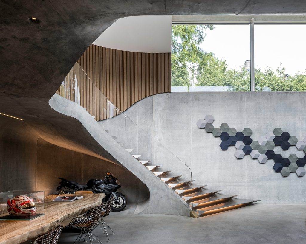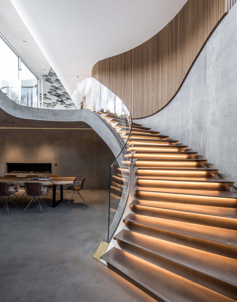 Beyond its structural and aesthetic appeal, Villa Kirk represents a cutting-edge approach to residential design. The home integrates advanced technology, allowing everything to be controlled via a smartphone and emphasizing convenience and modern living. Designed to serve as both a private retreat and a social hub, the extension features intimate spa areas, undulating oak walls, and a white spiral staircase leading to a multimedia room inspired by Kubrick’s ‘Space Odyssey.’ This bold project not only redefines domestic spaces but also sets a new benchmark for futuristic luxury living, promising to be a unique addition to Denmark’s ultra-modern architectural residences.