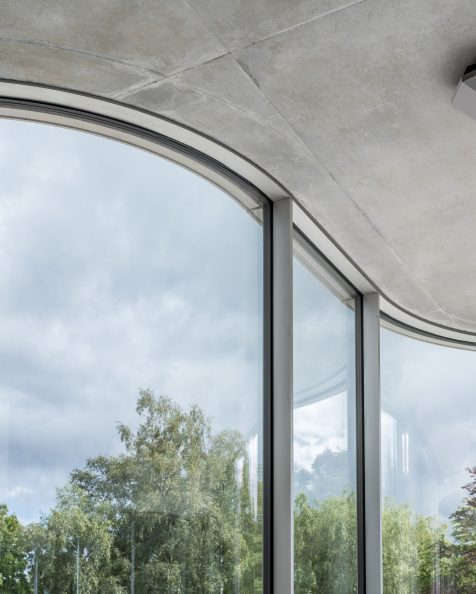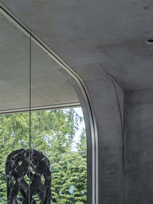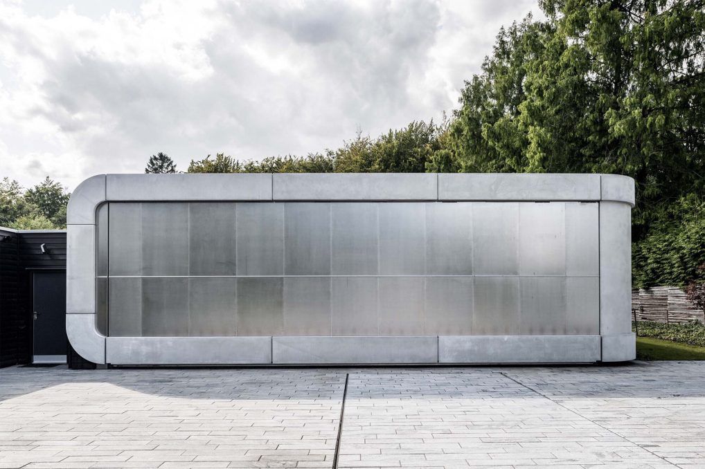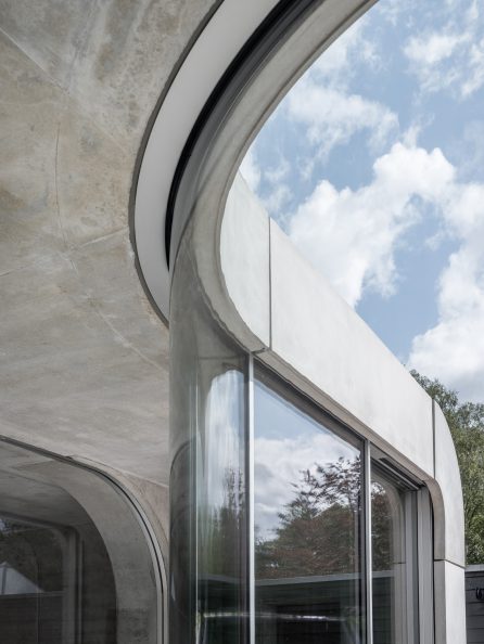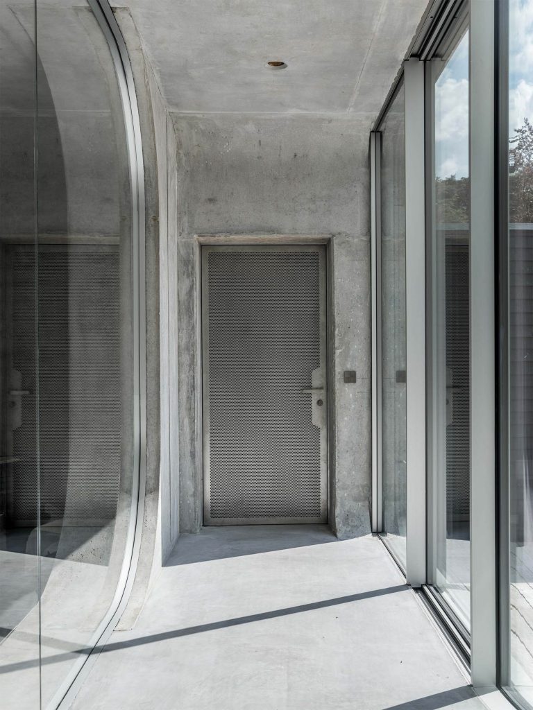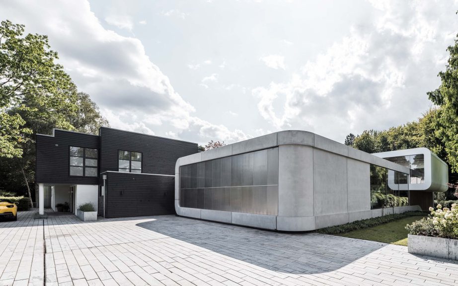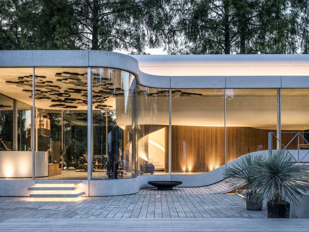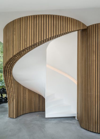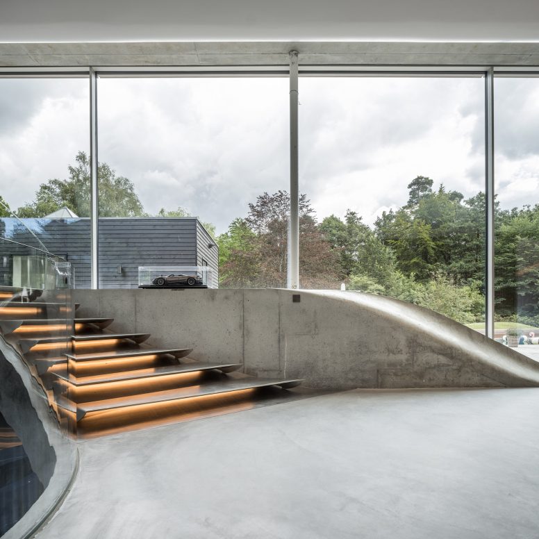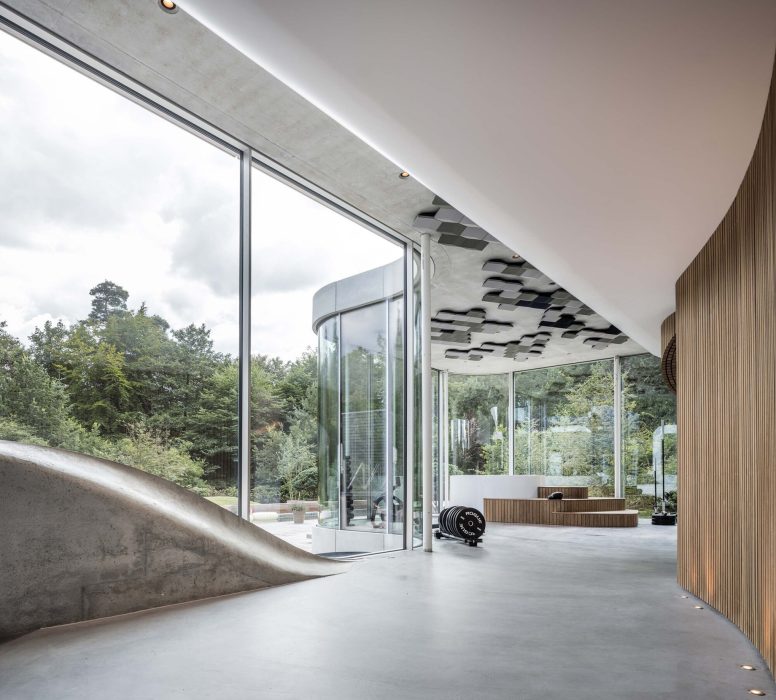 Villa Kirk, designed by Spol Architects, is a visionary home extension located just outside of Copenhagen, Denmark. This surrealist-inspired residence addition blends high-end leisure with dramatic architectural elements, featuring curves and futuristic designs throughout its three-level structure. Inside, a plethora of amenities such as a 300 sqm luxury gym, a private cinema, a bar, and an expansive exhibition area for classic cars cater to the ultimate hedonistic lifestyle. Crafted with a mix of raw concrete, steel, glass, and wood, the building stands out for its complex geometry and continuous forms, achieving a seamless integration with its suburban forest setting.