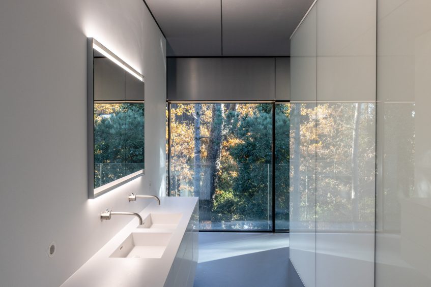 Internally, Villa Meijendel is crafted with a minimalist aesthetic, where each element, from glass balustrades to sleek cabinetry, is treated as individual pieces of ‘furniture’. This approach not only enhances the spacious feel but also supports the home’s modular nature, facilitating easy disassembly and reconfiguration. The main living spaces are bathed in natural light, pouring in through skylights and large sliding glass doors, which when opened, blur the lines between the interior and the picturesque external dune scenery. High-level detailing, such as glass handles secured by ultraviolet light and minimal visible fixtures, underscore the home’s clean, uncluttered ethos.