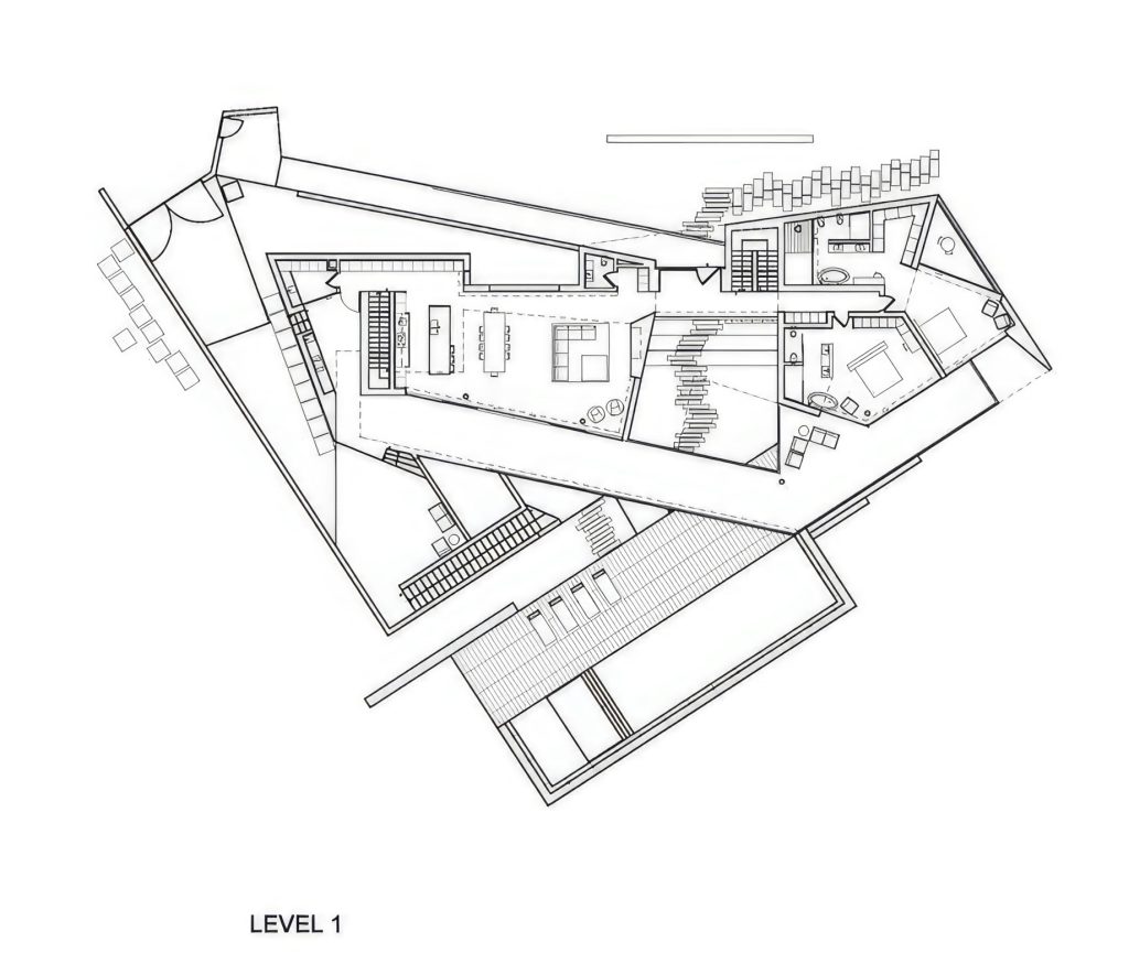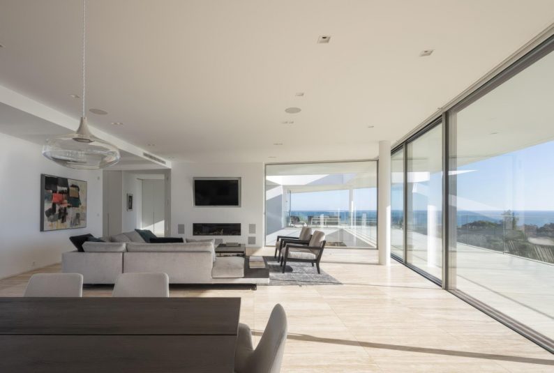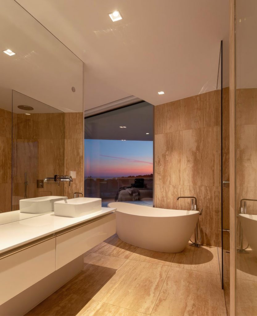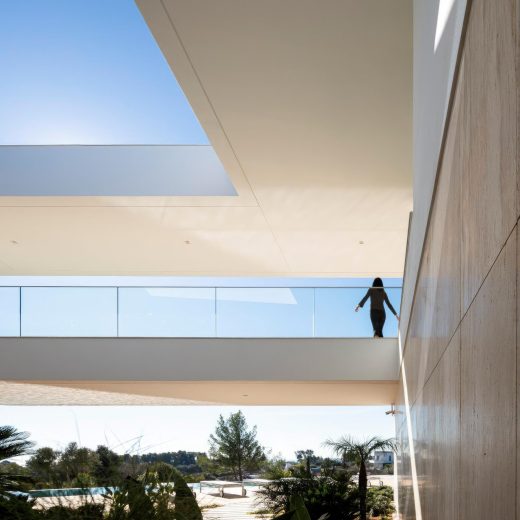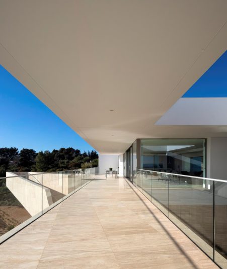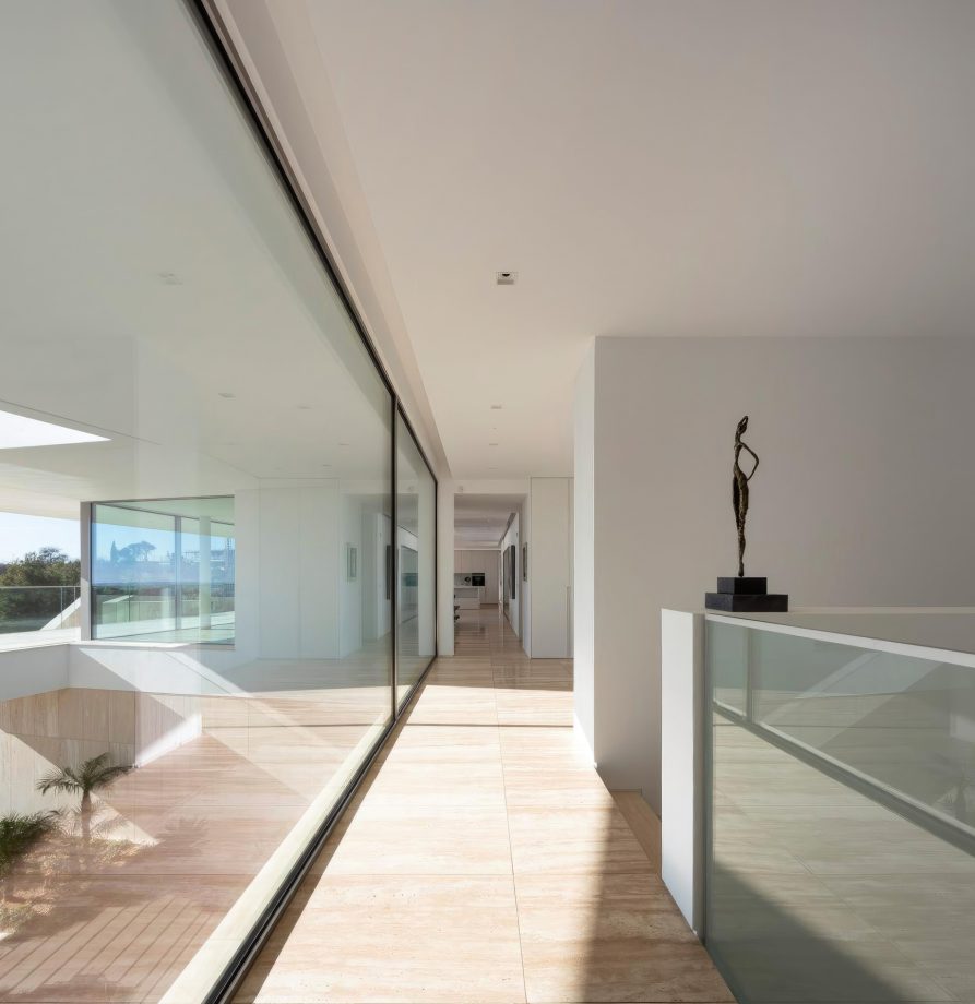 At the heart of the villa lies a garden patio, an intentional void that draws the landscape through the architecture, creating a central anchor for both views and circulation. Clean, angular lines extend from this space, harmonizing with the terrain’s natural rhythm. A defining material feature is the travertine limestone cladding on the lower level, grounding the structure and providing a visual contrast to the floating white upper floor. This thoughtful use of material reduces the building’s perceived mass and softens the transition between the home and its surroundings, while a suspended walkway offers direct access across the garden.