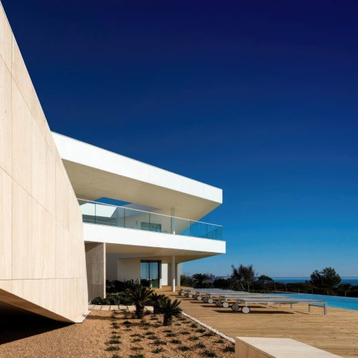 Positioned on an expansive, east- and south-facing plot in Lagos, Portugal, Villa Pernoi is a striking modernist residence designed by Mário Martins Atelier. Surrounded by lush greenery, the property offers panoramic views across the sweeping bay of Lagos and the ever-shifting tides of the Alvor estuary. The home’s design responds organically to its environment, integrating the client’s vision with the natural contours of the site. Every element of the build was considered to frame key viewpoints, balance scale, and establish a lasting connection between structure and landscape.