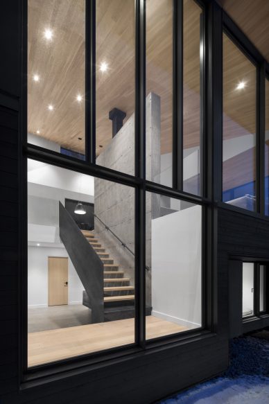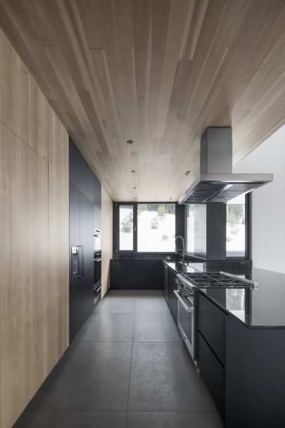 The living areas are designed to jut out and create distinctive, picture-like views. The abundant windows provide an unimpeded view of the mountainous landscape. The roof overhangs extend over the exterior decks. The access road below guarantees privacy for the living spaces despite the extensive windows. As we approach the house, we encounter the richness of the white cedar ceiling that covers the upper floor. This warm material extends under the roofs to emphasize the connection between the interior and exterior. The combination of volumes and materials creates a striking entrance. The sloping roof blends the project seamlessly into its surrounding environment in a respectful manner.