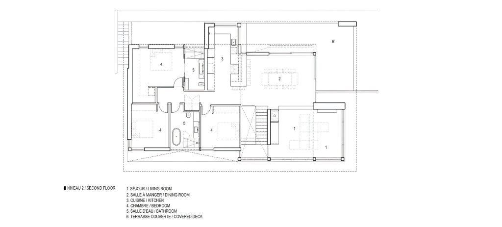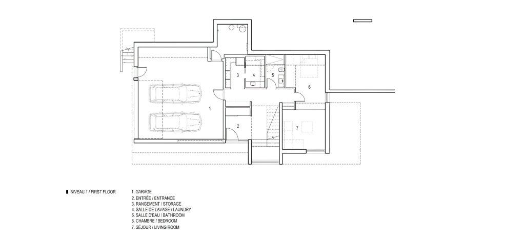 The Villa Vingt is situated on a sloping location near the Le Relais ski resort. The top level boasts a stunning view of the Laurentian hills and the neighborhood of Lac-Beauport. The design utilizes the existing foundation of the client’s previous home to retain certain rights. The owners, who have lived on the site for many years, are well-acquainted with its unique characteristics. The design takes inspiration from the natural surroundings, including the accentuated terrain. The first level serves as a base, with a close connection to the ground and full openness to the north. The upper floor appears to hover above the concrete lower level.