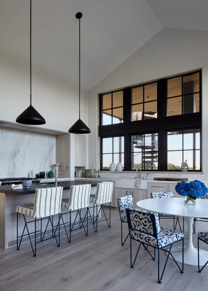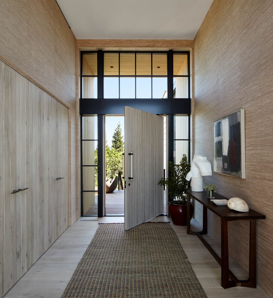The Water Mill Residence reflects the signature aesthetic of Sawyer Berson, blending architectural precision with the serene landscape of eastern Long Island. The homeโs architecture is a study in minimalism, with clean lines, expansive glass walls, and a focus on natural materials. The overall structure is a contemporary expression of the Hamptons’ shingle-style homes but with a modern twist. It is built with a low-slung profile, ensuring it harmonizes with the landscape rather than dominating it. The horizontal lines of the building echo the horizon, creating a subtle connection between the built environment and the surrounding nature.