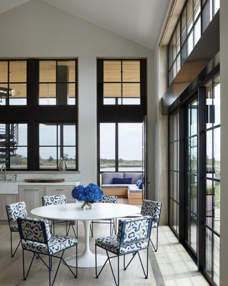 The Water Mill Residence, designed by Sawyer Berson, is a stunning example of modern architecture seamlessly blending with the natural beauty of its surroundings in Water Mill, New York. The homeโs minimalist design features clean lines, expansive glass walls, and natural wood materials, creating a harmonious connection between the built environment and the landscape. The outdoor deck serves as a focal point, bringing the outdoors into the heart of the home while maintaining a sense of openness. Inside, the open-plan layout, high ceilings, and soft neutral tones create an airy, sophisticated atmosphere, complemented by modern yet comfortable furnishings.