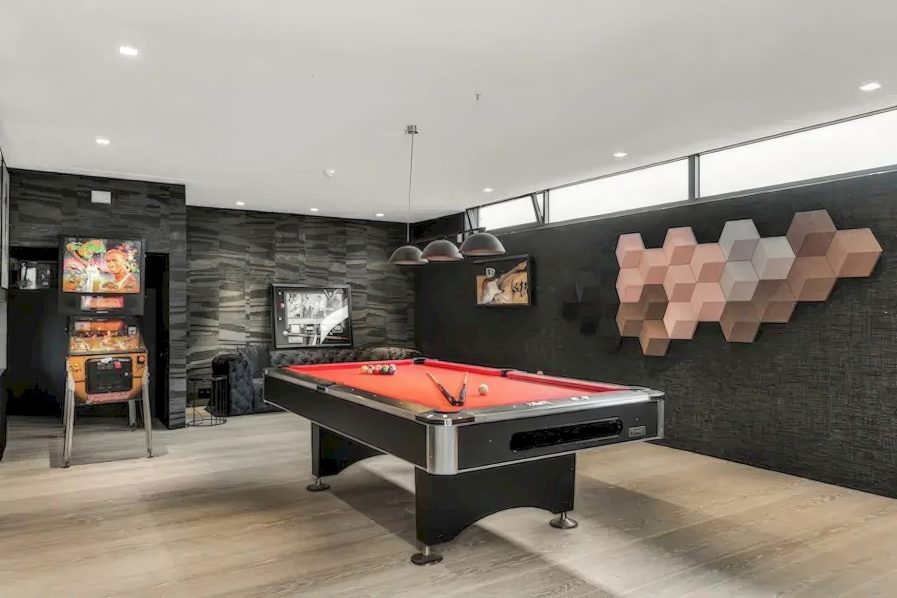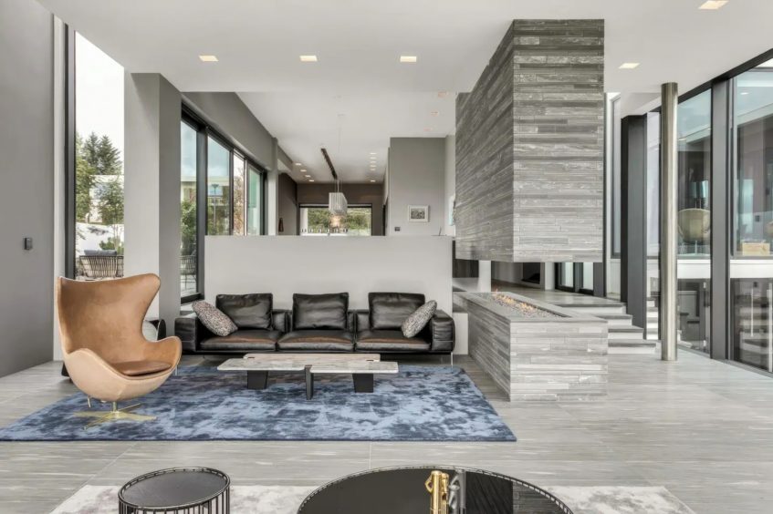 The White Villa’s architectural brilliance extends to its amenities, which are designed for both luxury and comfort. The gourmet kitchen is outfitted with Gaggenau appliances, complemented by a striking steel island, while the dining area, highlighted by a beautiful fireplace, flows effortlessly into the living room. Each space is adorned with high-end Italian furnishings from Minotti, Flexform, and Maxalto, alongside iconic pieces like leather-clad Swan and Egg chairs by Arne Jacobsen. The master suite on the upper floor boasts a Boffi bath and a private terrace, and the property includes a wine cellar, a large garage, and undeveloped basement space that offers endless possibilities for a spa, pool, and more.