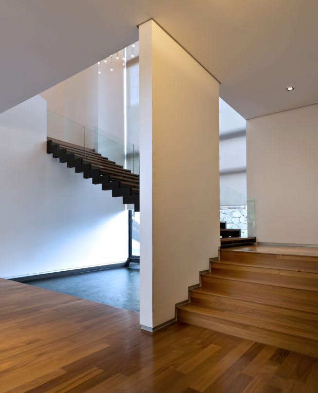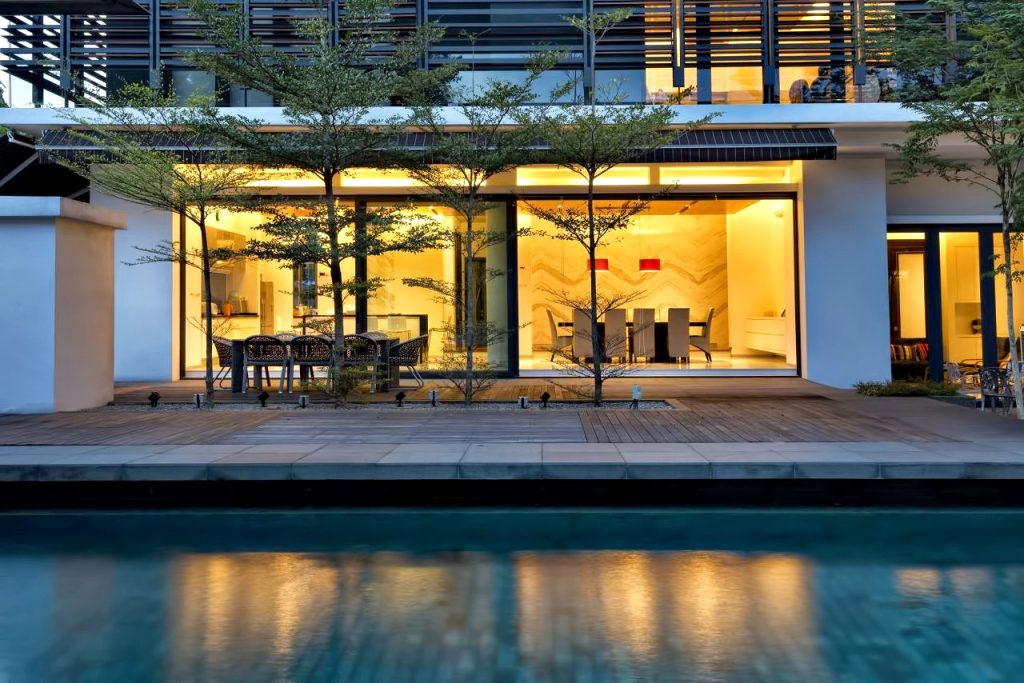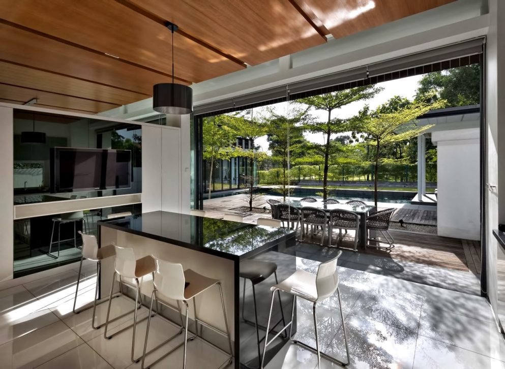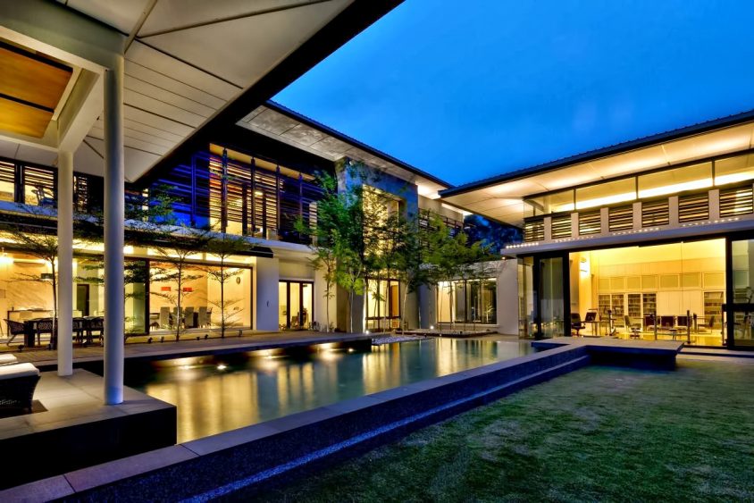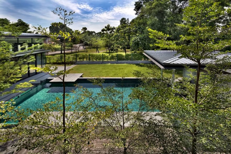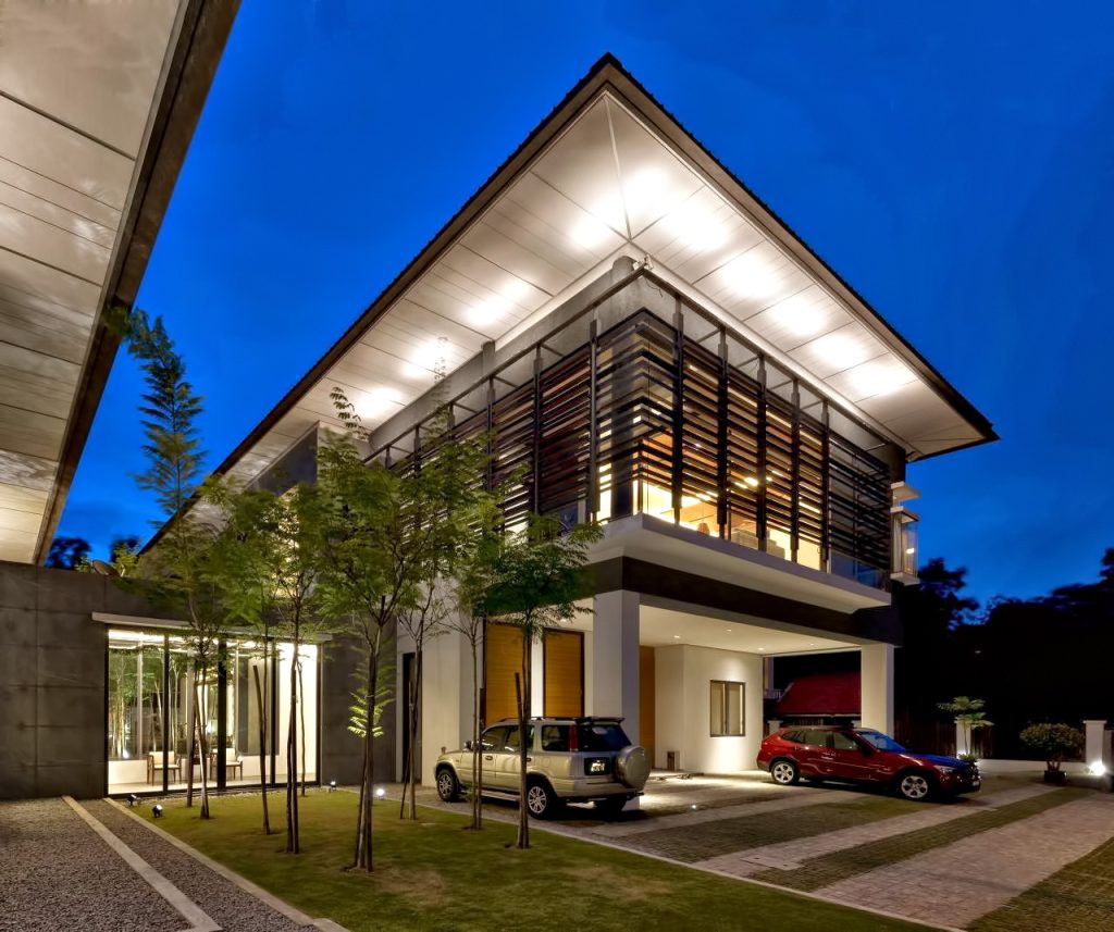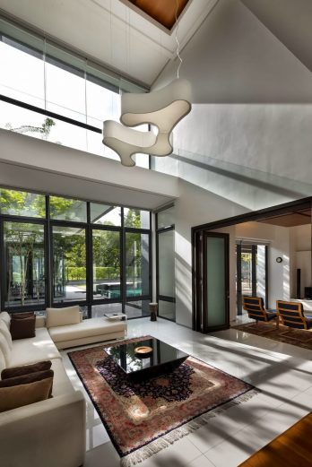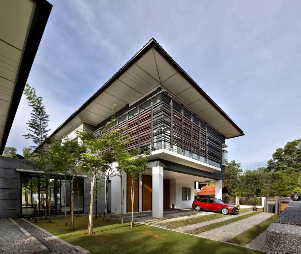 The Zeta House is a luxury residence situated in the outskirts of Kuala Lumpur and sits on a relatively large plot of land adjacent to a communal park, which visually extends the green area and makes it appear boundless. This expansion of space was the design directive that dominates the orientation and character of all major spaces striving to make the structure and domain breathe openness.