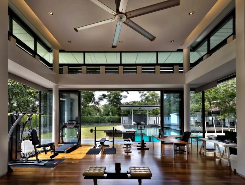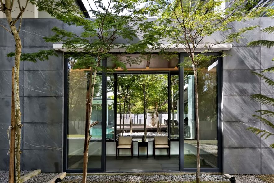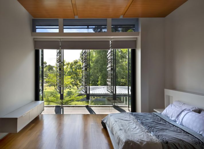 The ground floor of the house is mostly glass and can be entirely opened up to the tropical elements. The first-floor bedrooms have a layered façade, consisting of an open screen in front of deep terraces, and followed by full height glass. The entire structure has been sculpted to maximize green views and bring in light and air.