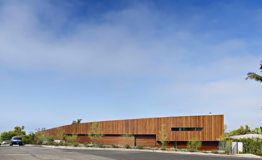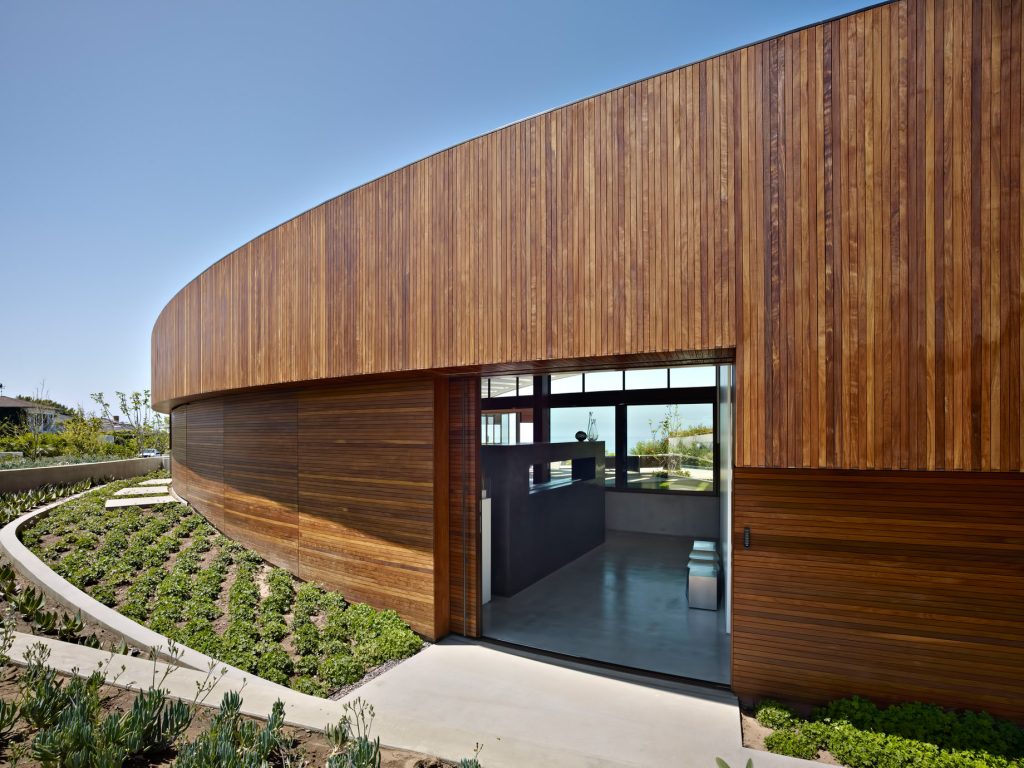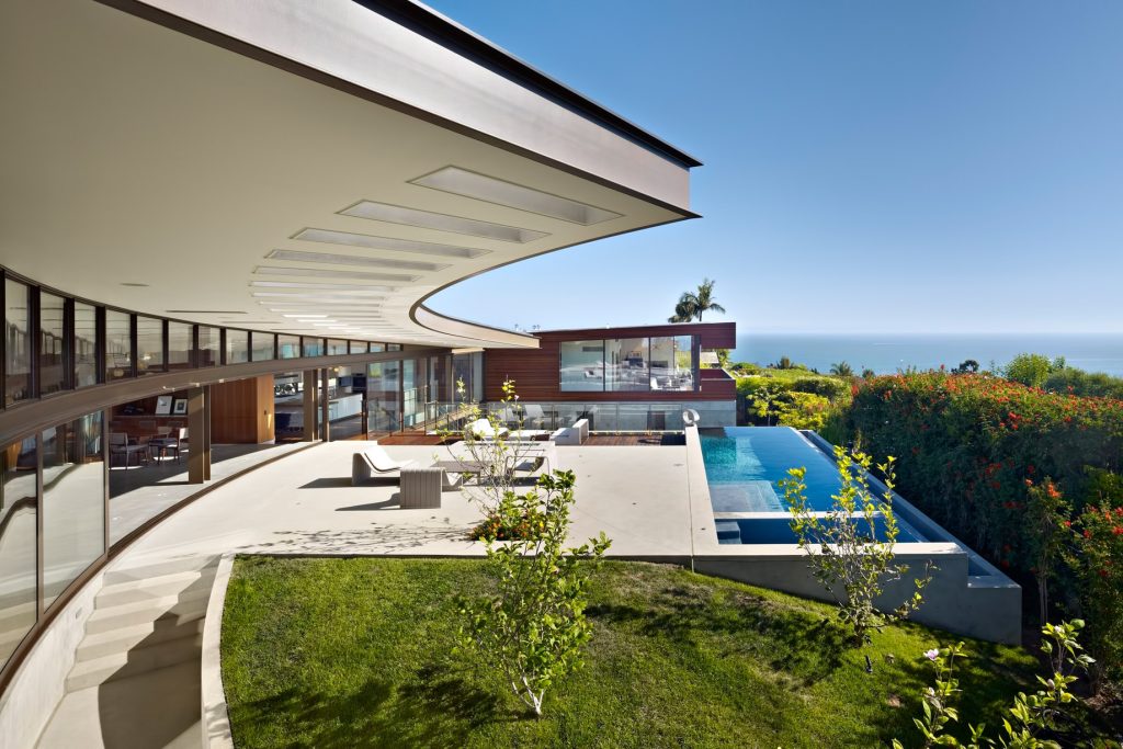 Situated in the shallow hills directly above the Pacific Coast Highway at both the near edge of the Pacific Ocean and the foot of the Santa Monica Mountains, the Ziering Residence is immediately surrounded by the foothills of the mountain range leading to Topanga State Park and a small grove of trees that give way to the iconic Getty Villa.