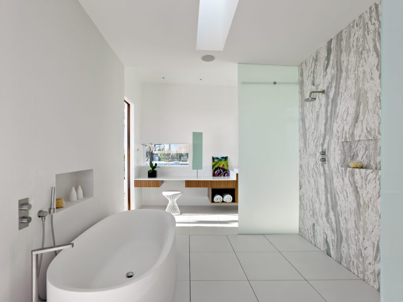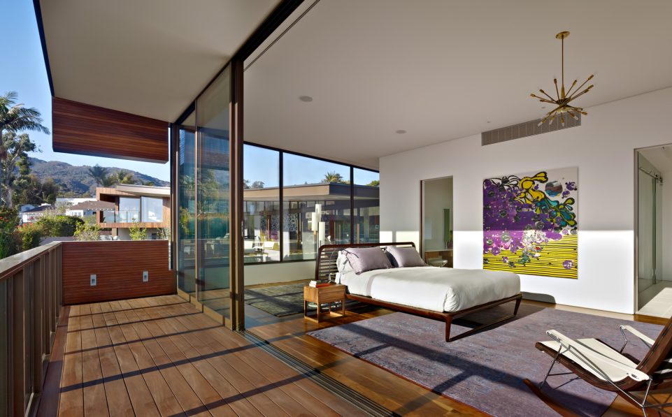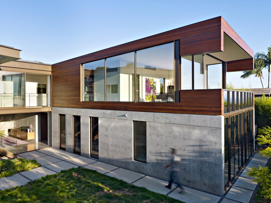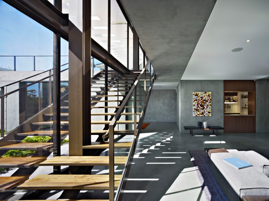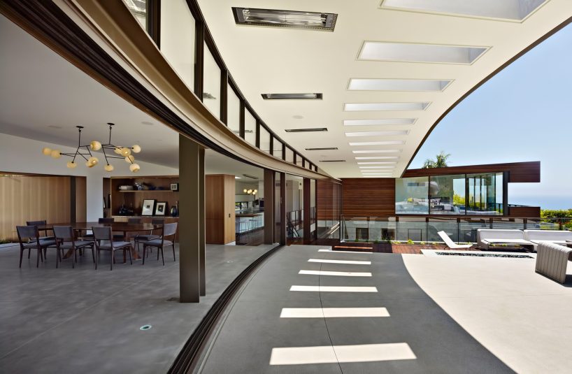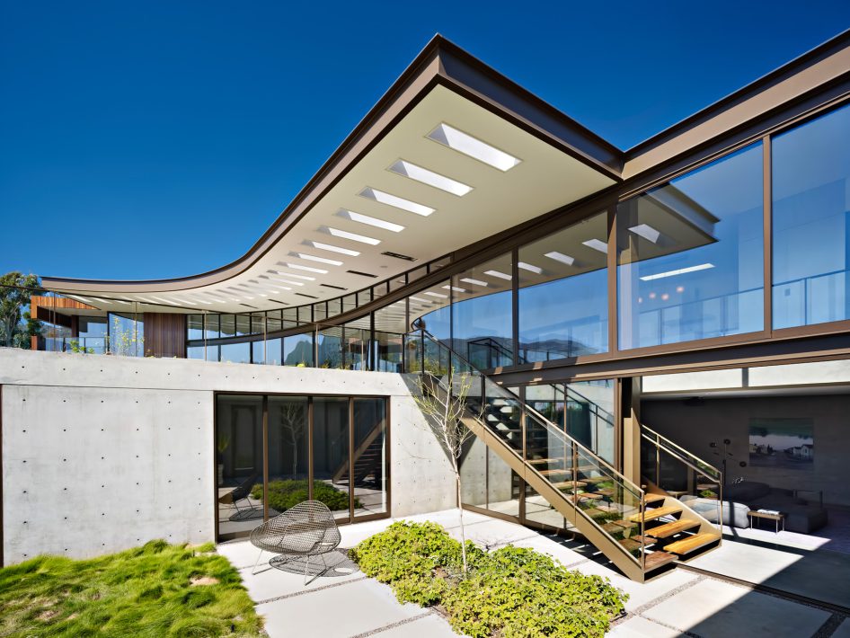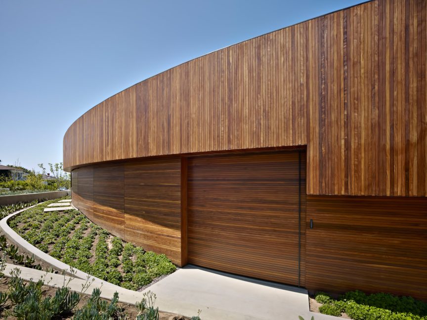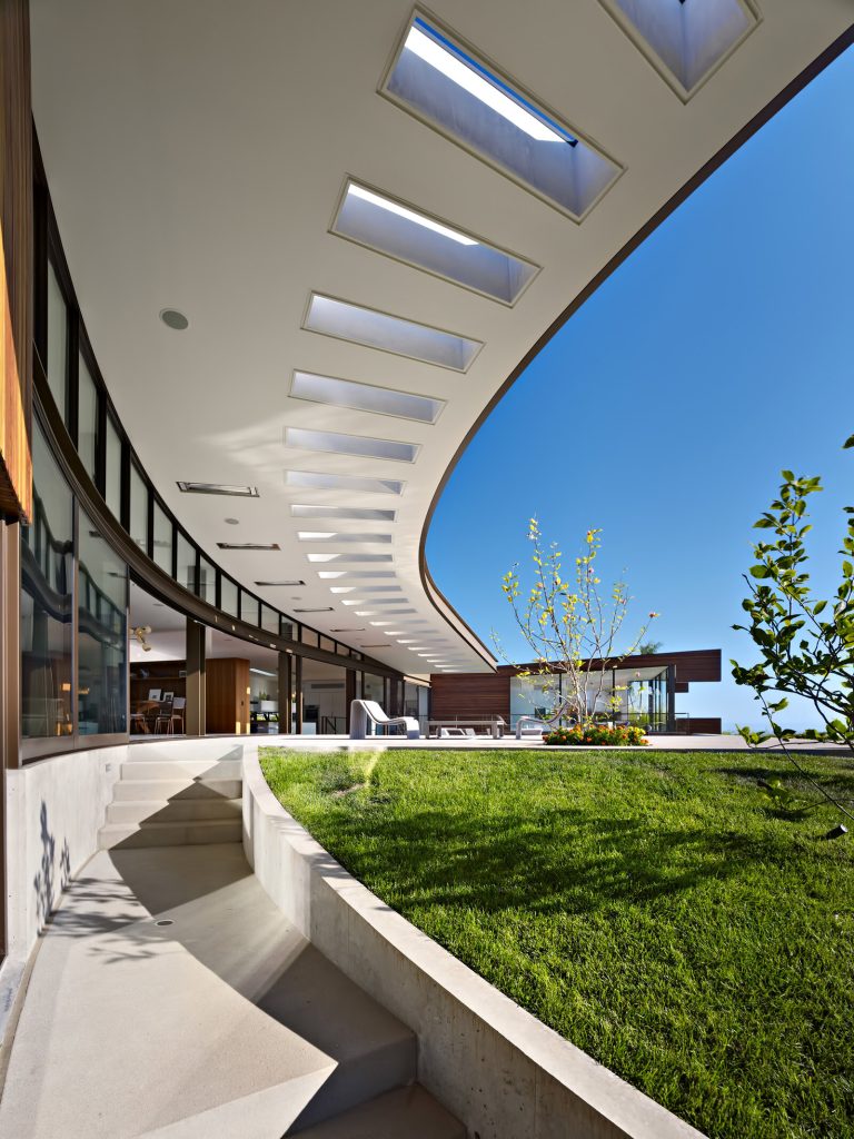 The Ziering Residence utilizes an open floor plan with the living, dining, parlor, and kitchens spread along a curve, giving way to a corner master suite and leading to a lower level with a pair of children’s bedrooms opening up onto a sunken courtyard. Unlike the front, the rear courtyard area is completely transparent, clad in sliding glass panels that open the entirety of the house to the outdoors. A deep overhang creates a covered area for al-fresco living, shaded by a fourteen-foot canopy linking a sequence of open living areas to a terraced garden and pool.