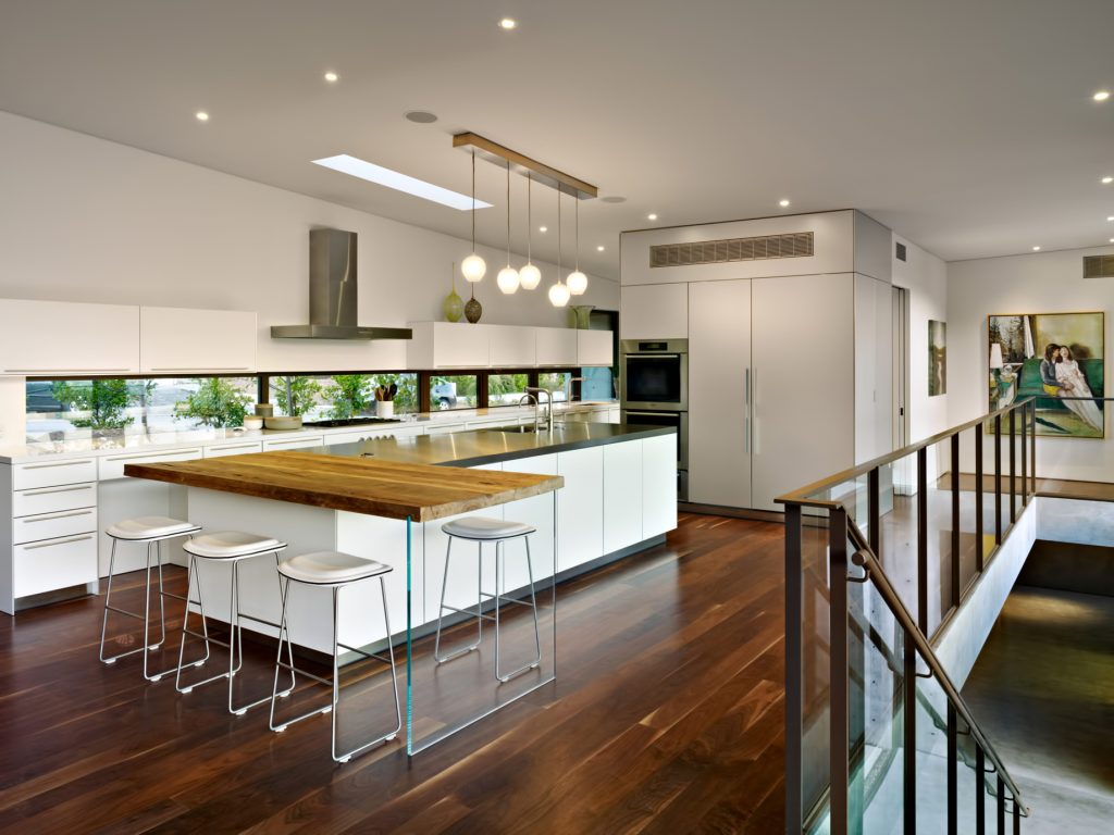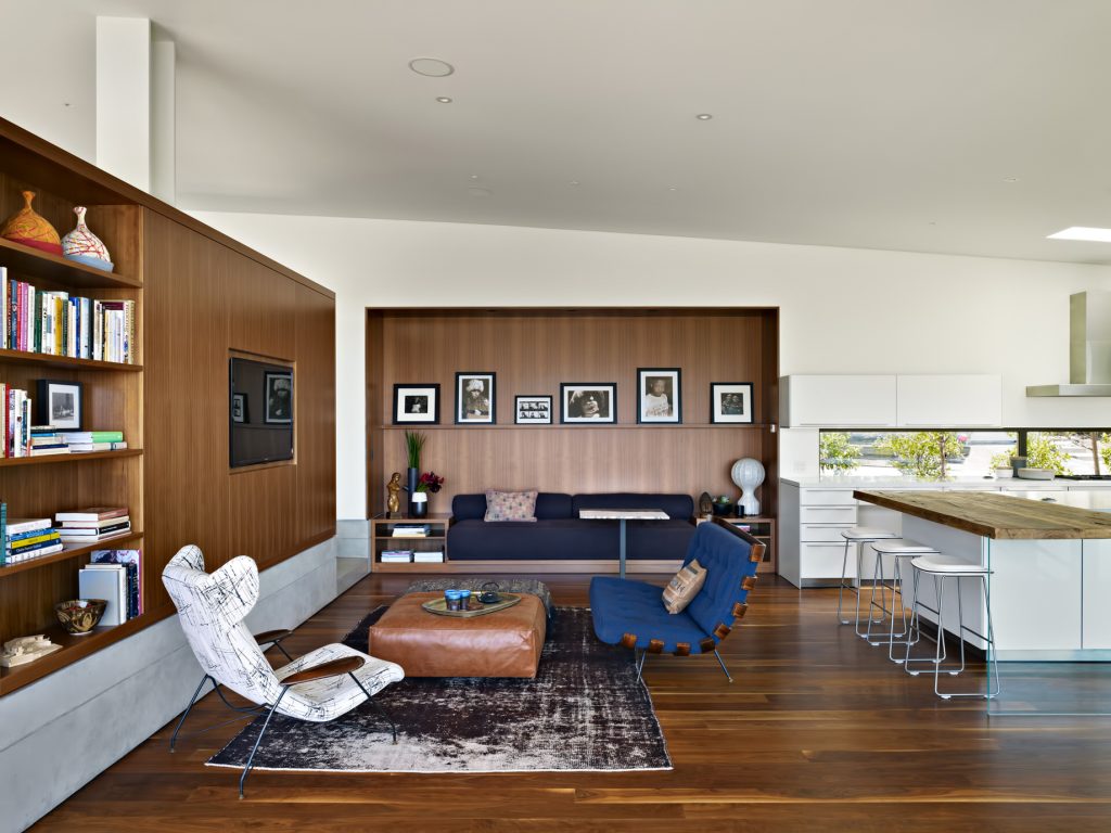 Following a minimalist design ethos emphasizing a small home feel devoid of anything that wasn’t strong, necessary, and beautiful, the aim was to make the exterior as inconspicuous as possible, in order to create the illusion that the home wasn’t built but simply emerged. The resulting street-view is unassuming with a low-slung structural profile and front façade that harmoniously integrates into the surrounding homes and landscape. A gently curved exterior that follows the natural arch of the street, and the use of 1×2 Ipe wood battens that conceal the entry, garage doors, and the majority of the interior’s whole reinforces the seamless and unobtrusive quality of the home.