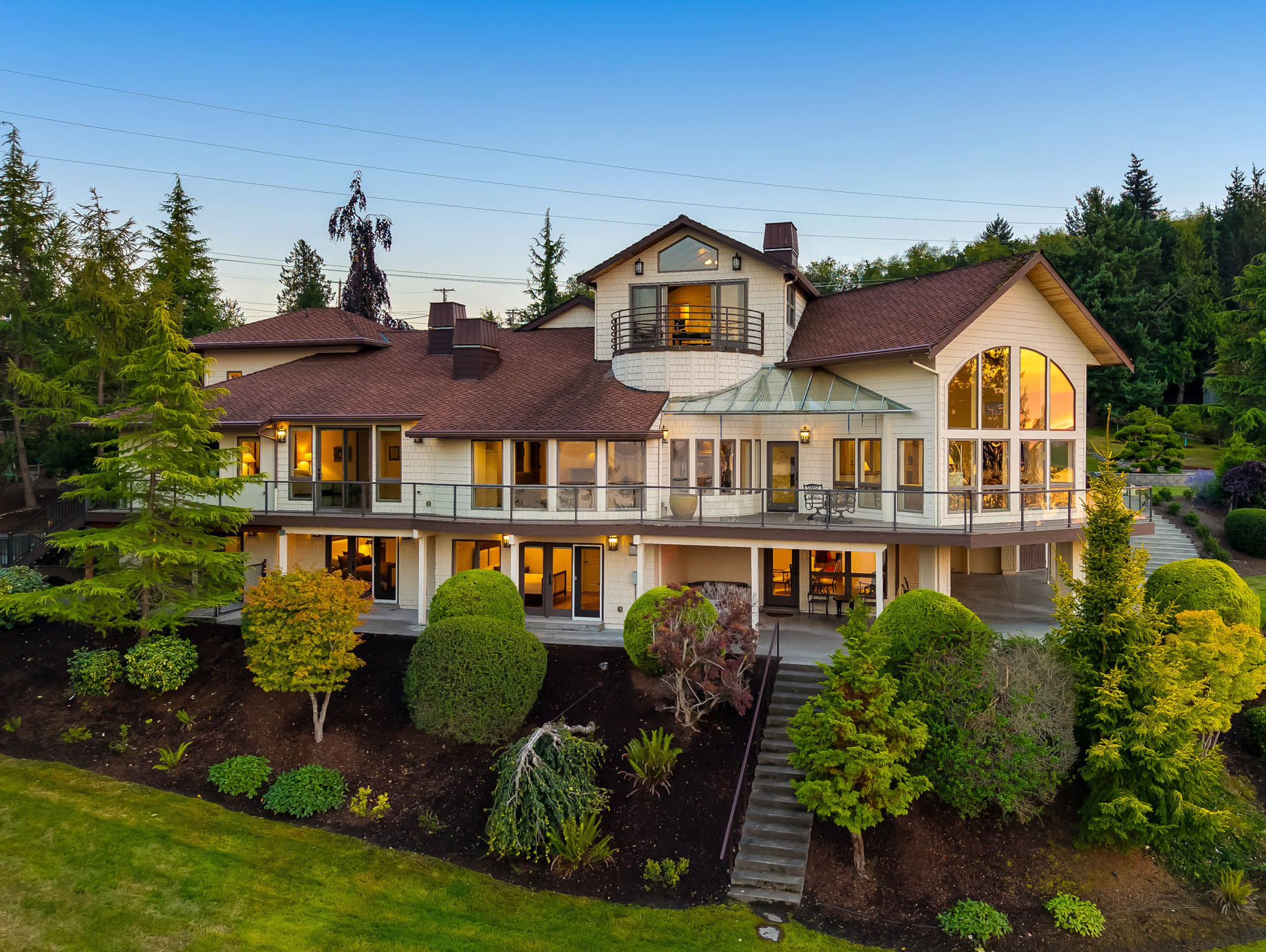 Immerse yourself in luxury with breathtaking views in this rare 2-acre waterside estate in Anacortes, a masterpiece of design where every room frames spectacular 220-degree views of eight islands, the Canadian Coast Mountains, and ferries gliding through unforgettable Thatcher Pass sunsets. Exceptional craftsmanship defines the home, featuring rare tumbled travertine marble, reclaimed European Oak beams, and eight gas fireplaces elegantly accented with custom imported Italian stone. Designed for both lavish entertaining and intimate comfort, an elevator seamlessly connects the extensive layout. From the magnificent main-level primary suite with its solarium and English copper soaking tub, up to a private balcony office, and down to an opulent lower level boasting guest quarters, a sauna, wine storage, a media room, and a hot tub patio, this home has it all. Complete with a seven-car heated garage and a workshop, this extraordinary sanctuary offers an exclusive front-row seat to the most remarkable evening colors imaginable.