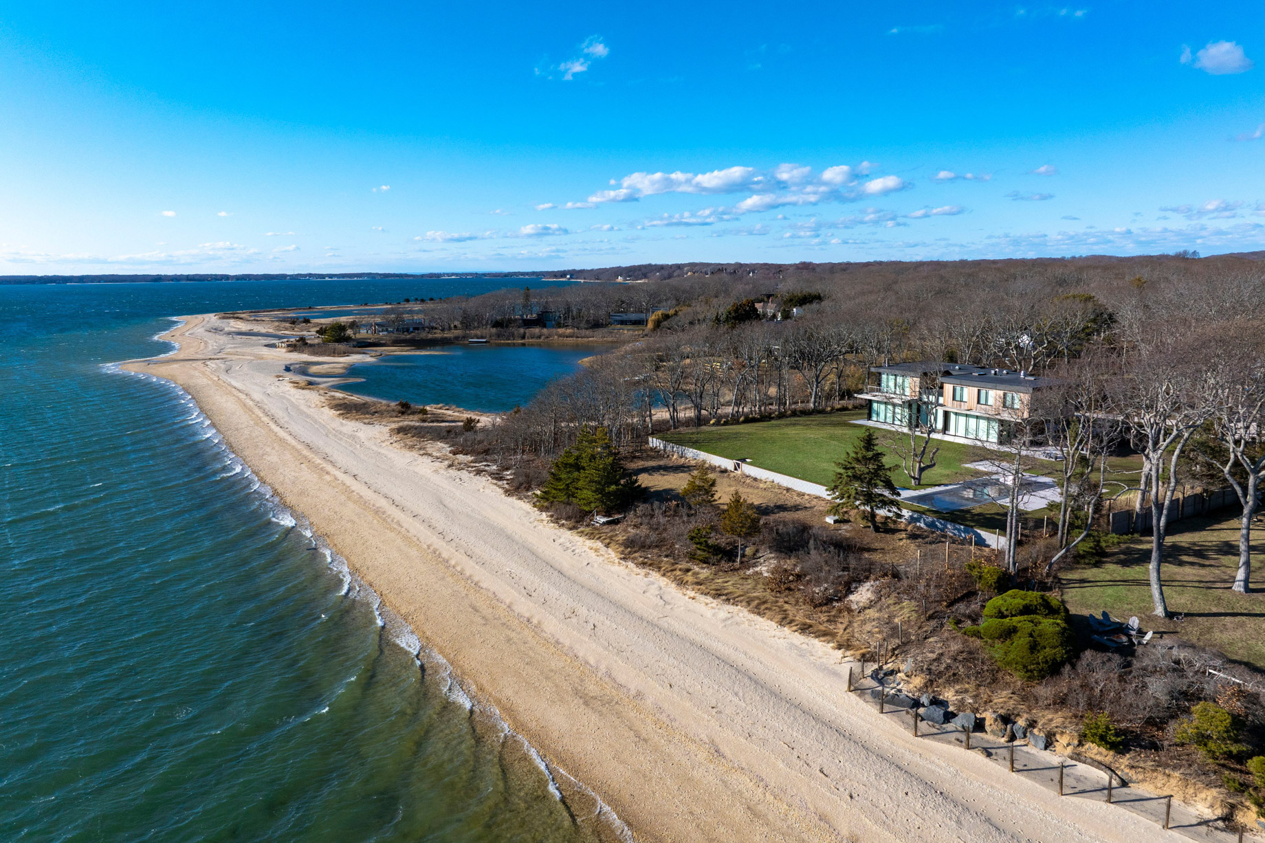This modern waterfront residence, constructed in 2024 by Fountainhead Construction Inc., spans 5,800 square feet and offers 250 feet of sandy beach and extraordinary panoramic water views. It features 180 degrees of sweeping water views from Crab Creek to North Haven Point and across Great Peconic Bay, with 250 feet of sandy beach along the shoreline. Walls of glass in the kitchen, dining area, living room, and select bedrooms frame the remarkable water views and glowing sunsets, creating a seamless connection between indoors and out. Step onto the waterfront patio or terrace to experience the setting even more fully. The sleek five-bedroom home includes six full baths and two half baths, with sophisticated finishes and amenities throughout, including 10-foot doors, a kitchen with custom Italian cabinetry and natural stone countertops, a fireplace, media room, and heated waterside pool. Set on 2.12 secluded acres, this exceptional property offers a rare opportunity for refined waterfront living.
