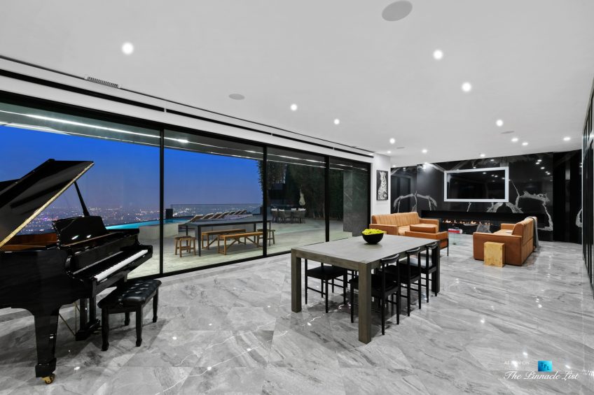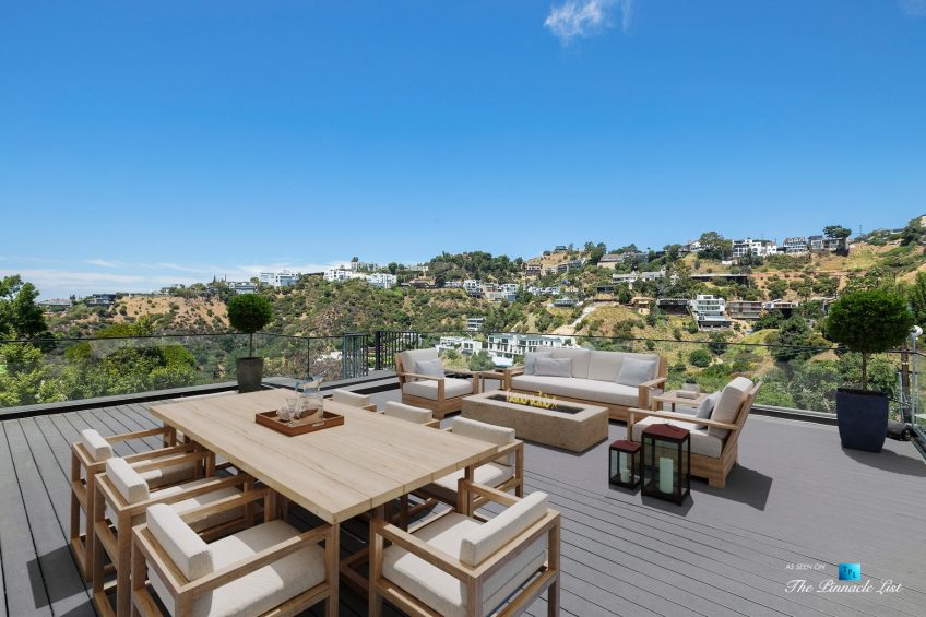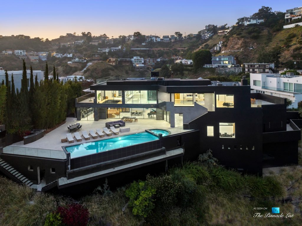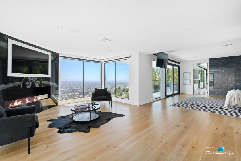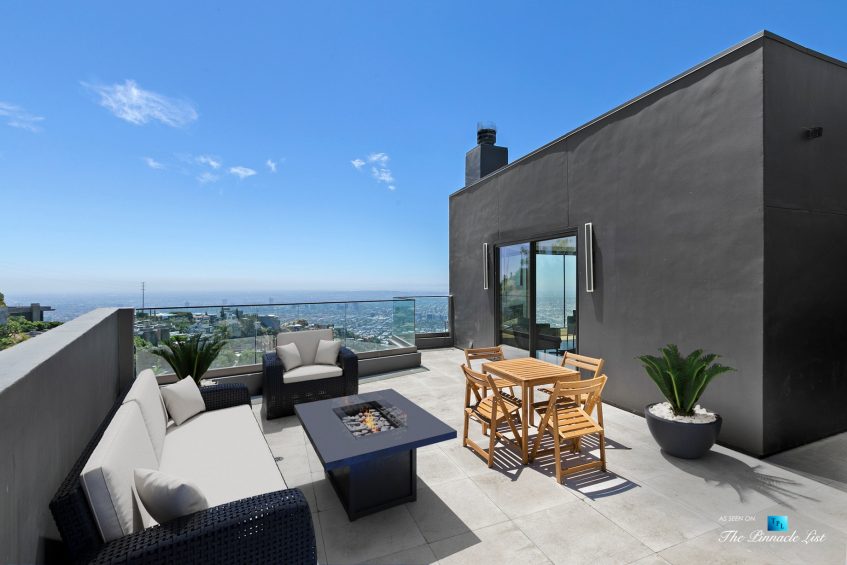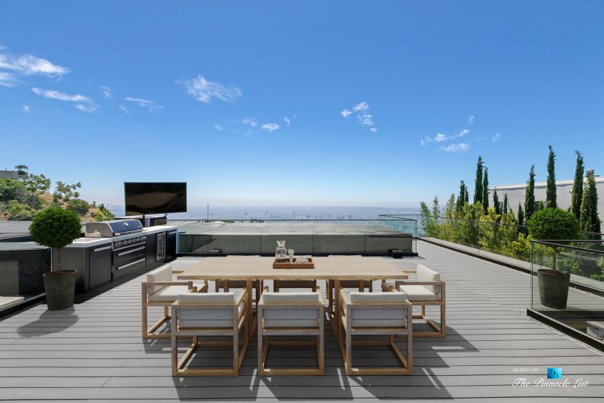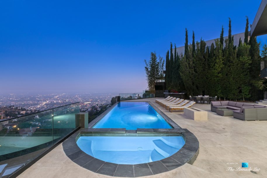 Impeccable Sunset Strip modern with unobstructed views minutes from storied LA nightlife and tucked away on a four home private drive directly off of Sunset Plaza. Enter to a grand main level with sliding walls of glass and a family room with wall length fireplace and a glass wine cabinet. Fully remodeled from the ground up with imported stone, custom appliances, and fixtures, this is an entertainer’s paradise. Four en suite bedrooms with high ceilings, five bathrooms, a chef’s kitchen, a home theater and so much more. Ascend the spiral staircase to the 1000 square foot rooftop deck with a luxurious outdoor kitchen and take in the lights of LA. A sprawling outdoor area anchors this residence complete with an oversized infinity pool and spa as well as a wet bar and outdoor TV all backdropped by jetliner views stretching from downtown LA to Catalina Island.