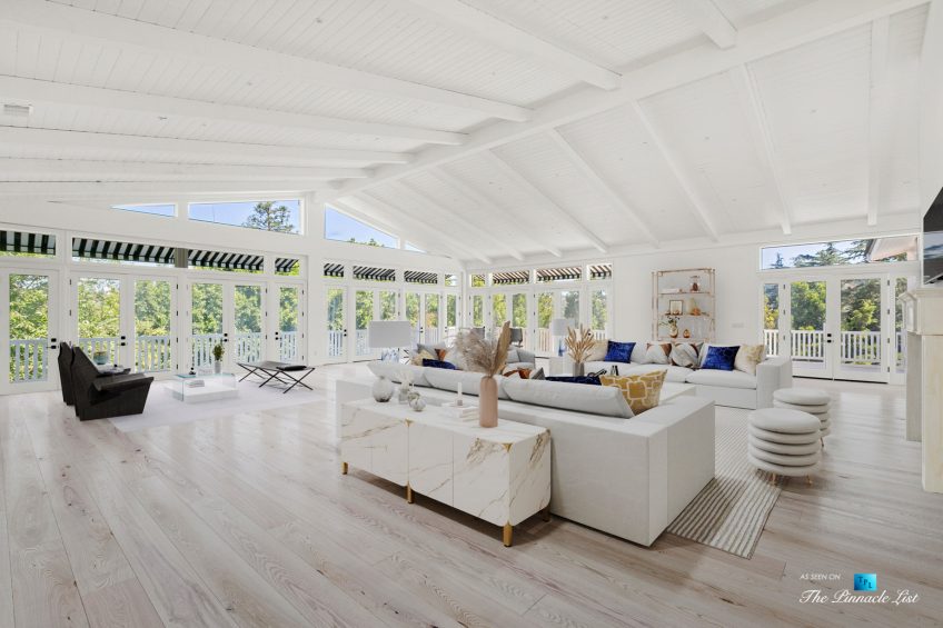 Gated and secure, this absolutely unique compound on gated Oak Pass Road is surrounded by mature trees and mountain views. Like you are living in the countryside. Multiple entrances and consisting of the following structures on approximately 2 acres. Breakdown: Brand New approximately 10,000 to 11,000 sq. ft. Cape Cod+ 2,000 sq. ft. Guest House + Plus 400 sq ft Guest House + 2,500 sq. ft. Additional House + 1,000 sq. ft. Guest House. 4 Lots. Huge Open Spaces. Room For Tennis Court/Pickle Ball Court. Multiple garages. Square footage of structures is approximate: 1. Newly constructed Cape Cod estate to be finished in 4 to 8 weeks. Estimate is 10,000 to 11,000 square feet. However, the ceilings are literally soaring everywhere, and the volume is way beyond a standard house of this size. Massive living room and family room off the gourmet kitchen as well as an enormous office/library/game room. Walls of glass and natural light everywhere. Spectacular primary suite with his and hers baths and adjacent nursery/sitting room. 5 additional spacious bedrooms en suite with the option for additional bedrooms downstairs in an immense and flexible space presently designed as a remarkable entertainment retreat, ideal for theater, lounge, game room and the like. Additional structure descriptions: 3 Bedroom 3 bath approximate 2,500 square foot house with separate entrance 2 Car Garage Pool and Large Yard. Guest House #1: 1 bedroom 1 Bath. approx 2,000 sq. ft. Guest House #2. approx 400 SQ FT. Guest House #3. 1 Bath. approx 1,000 sq. ft. Interior photos of main house include virtual renderings of furniture.