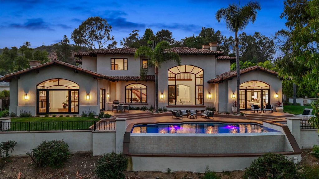 Welcome to a thoughtfully refreshed estate in the prestigious Del Mar Country Club, reimagined by the acclaimed builder Danny Hampel. Tucked away on the 8th hole, this luxurious residence spans approximately 8,200 square feet and offers a perfect blend of sophistication and comfort, featuring 5 generously sized bedrooms, an optional 6th, and 6.5 meticulously detailed bathrooms. Designed for the discerning homeowner, this estate features a downstairs primary bedroom, offering convenience and privacy. The impressive new landscape design complements the style and architecture of this exceptionally crafted home, enhancing the seamless indoor-outdoor living experience. The property offers breathtaking views of the championship golf course, making it a serene retreat for those who appreciate both luxury and tranquility. With entertainment at the heart of this home, the generous media room with a wet bar promises cinematic experiences in the comfort of your own home. For those who require a private retreat, the black walnut paneled executive office provides an elegant and inspiring workspace. Refreshed to perfection, every detail of this estate exudes elegance and timeless appeal, making it a rare find in one of Southern California’s most sought-after guard gated communities.