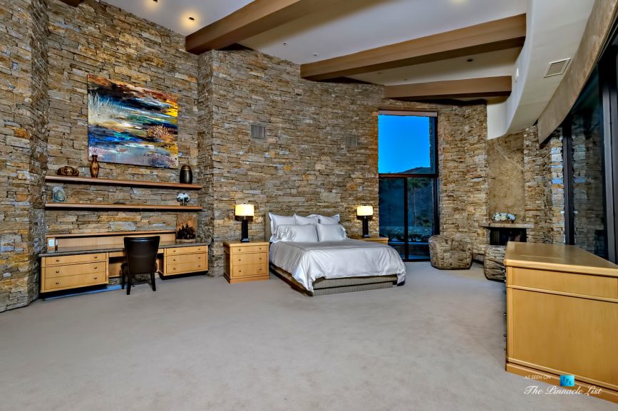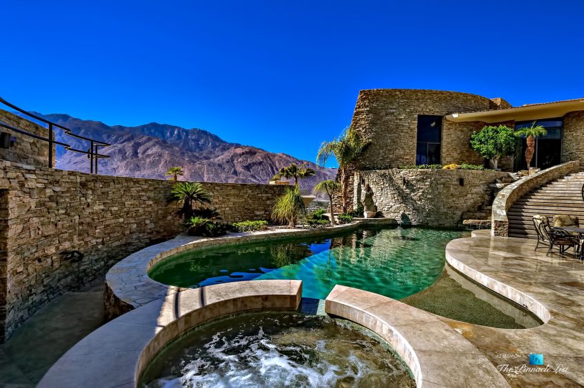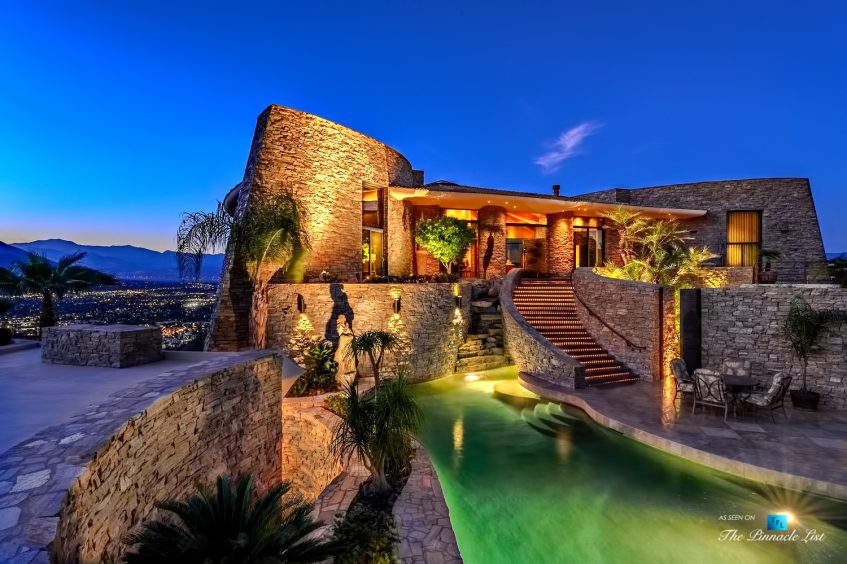 This Palm Springs architectural masterpiece has the most commanding views of any estate in the Desert, perched high above Palm Canyon Drive, in the famous, star-studded enclave of “Southridge” situated at the pinnacle point of the Palm Springs Hills. Traveling minutes to El Paseo, Indian Wells Tennis Garden, & the legendary Palm Canyon Drive. Situated behind regal security gates guarded 24 hours a day. Floor to ceiling walls of glass. 360-degree views of Downtown Palm Springs to LaQuinta and everything in between. Close the doors behind you to enter serenity; this is its own private island high above Palm Canyon Drive, an entertainer’s first choice to impress their guests. The Stone House is built with the finest stone, marble, wood, & state of the art technology. Store exotic cars in the gorgeous stone lined garage. Entertain guests at the private bar, full outdoor kitchen, putting green, travertine shuffleboard, fire pit, & private resort style pool and spa against the Desert city lights.