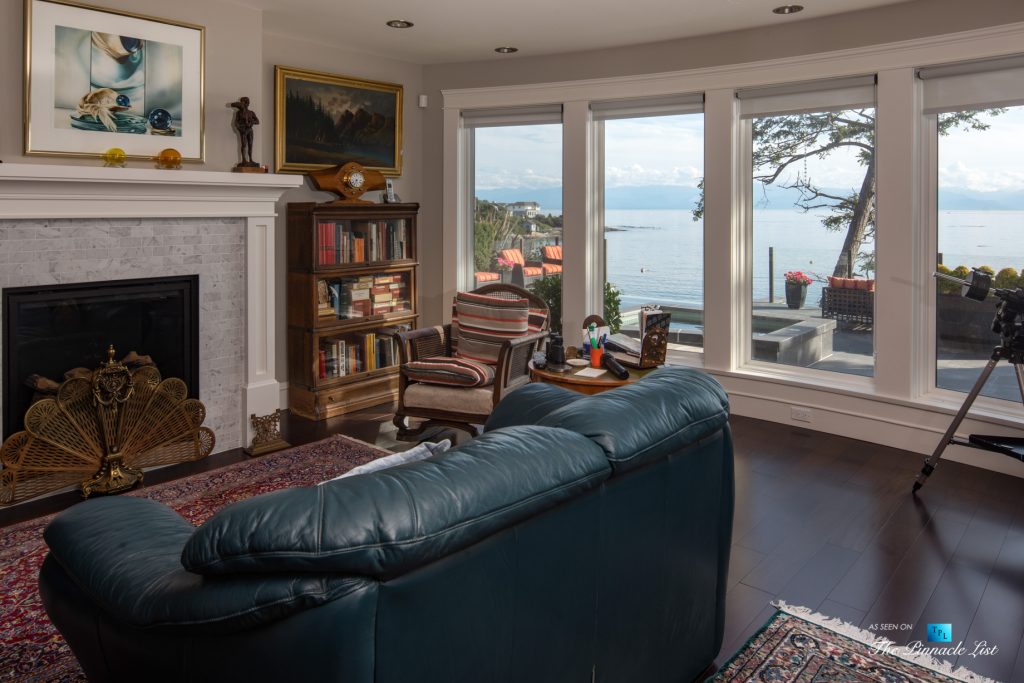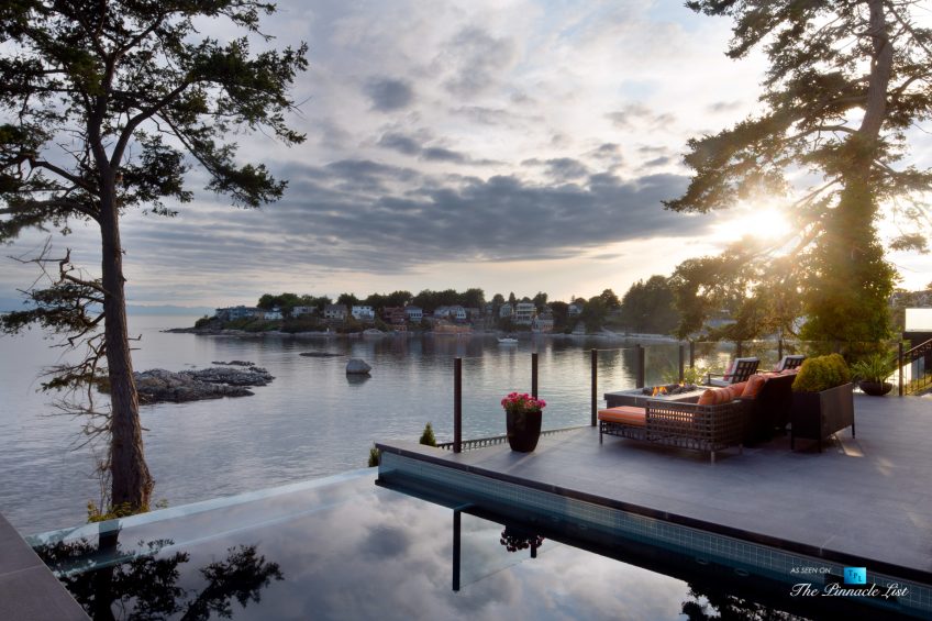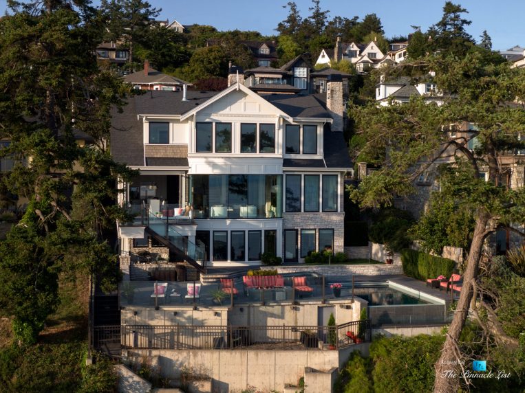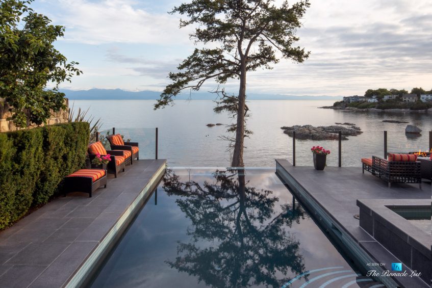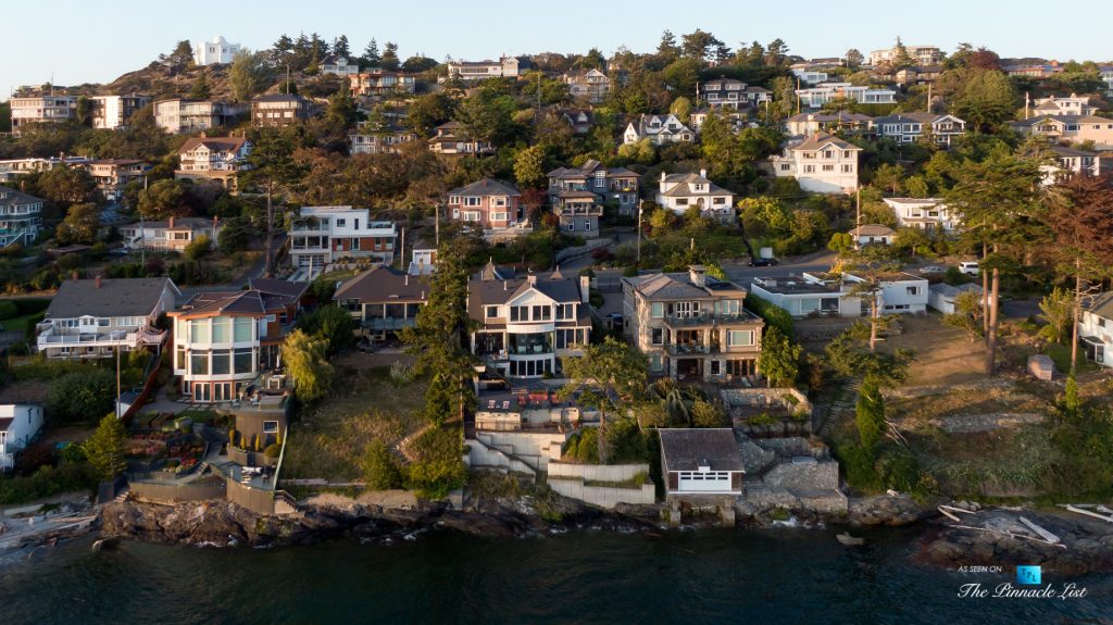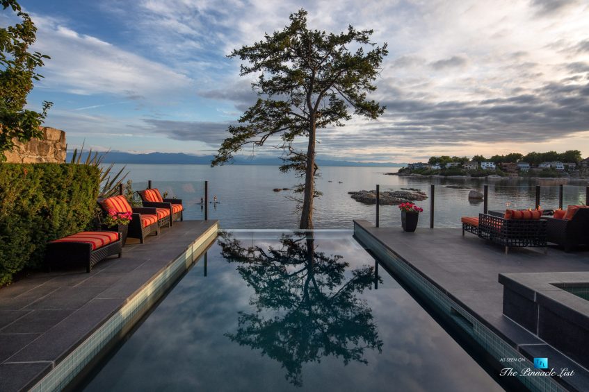 Prestigious Gonzales Bay waterfront. This custom Zebra Designs beachfront residence surpasses all expectations! With over 5,000 square feet of living space extending over three architecturally stunning levels. Exquisite upon arrival with beautifully landscaped gardens and sparkling water views. Formal entry exposes the grandeur within, sweeping ocean and mountain vistas framed by walls of glass. The Interior is visually captivating with soaring coffered ceilings, elegant pillars, superior craftsmanship and artistic detailing. The three levels are connected via stairs and an elevator for convenience. Perfectly suited for entertaining, the main is open and inviting. The well-appointed Chef’s kitchen has gleaming granite, top of the line appliances – including a gas range, and a central island with bar seating for casual meals. The chic kitchen continues onto the refined dining room, which shares a statement fireplace with the dramatic living room. A family room and study each enjoy a fireplace. A mud room, two-piece bath and garage access completes the main. Above, a regal master suite with a cozy fireplace, lavish five-piece ensuite with his and hers sinks, deep soaker tub and walk-in shower and a massive walk-in closet with quality wood cabinetry. Additionally, two more bedrooms, both with an ensuite and one with a walk-in closet. Laundry and plenty of storage finish the level. Below, welcome in-laws or guests with a full one-bedroom suite – complete with a kitchen, living/dining area, fireplace, 3-piece bath & separate entry. Lower also provides another bedroom, den/media room, and a superb wine cellar! Outside living at its best! Rest and rejuvenate in your amazing infinity pool, and hot tub. Spend cool evening by your outdoor fireplace overlooking dynamic views with active marine vessels and vibrant skies. A putting green and tons of patio and deck space encourage outdoor living! Possibly the highlight of the home is the private beach access it affords, beachcomb at your leisure. Affluent area amenities – just minutes from Oak Bay Village, Downtown and the Inner Harbour.