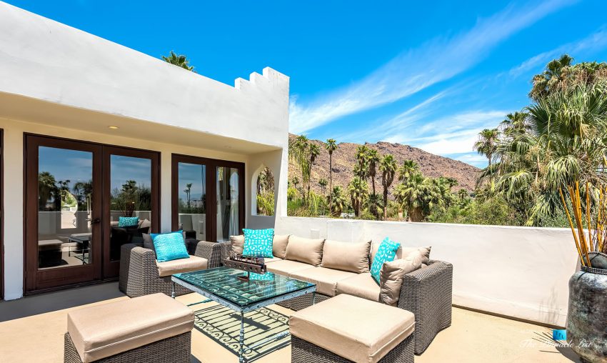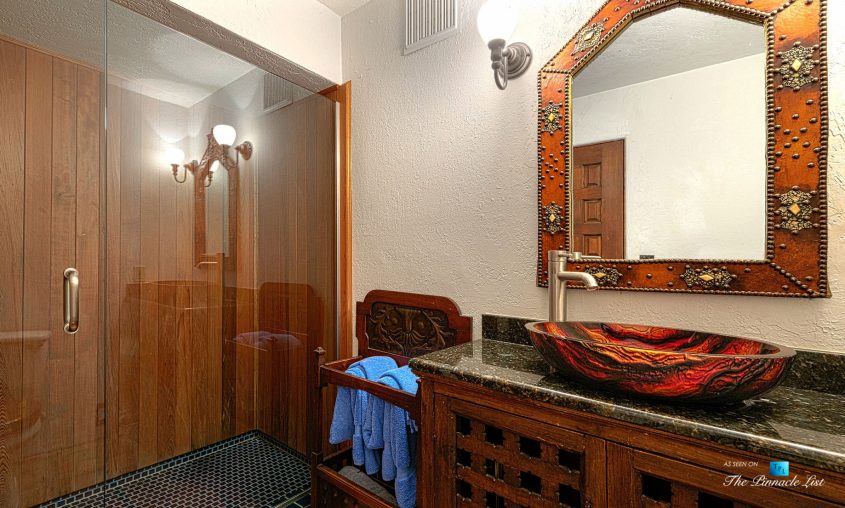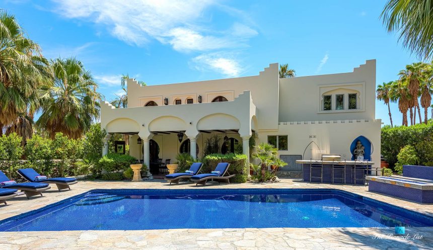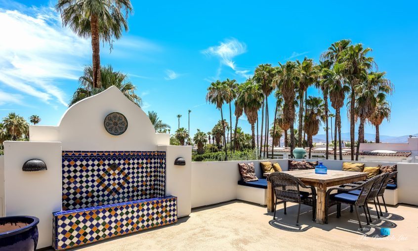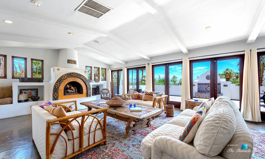 This Moorish Style Villa was originally part of a forty-acre ranch compound belonging to a prominent US manufacturing family. The villa has been updated and brought into the new millennium with every convenience. The vaulted great room has a grand custom tiled fireplace and French doors. A chef’s kitchen has custom tile, stainless steel appliances, Viking six burner cook top and Bosch double ovens. The second entertainment kitchen on the pool level adjoins the media room and dining area. This unique property boasts custom Moorish tile, arches, authentic Moroccan fixtures, custom ironwork, paneled wood doors, and hand troweled Old-World plaster. Stunning views are enhanced by 1250 sq. ft. of balconies for outdoor living, one with a tiled fountain and dining banquette that seat twelve. The studio suite has a separate entrance, patio, bath, fireplace, and 12′ ceiling. This unique architectural gem sits in a river rock walled and gated compound.
