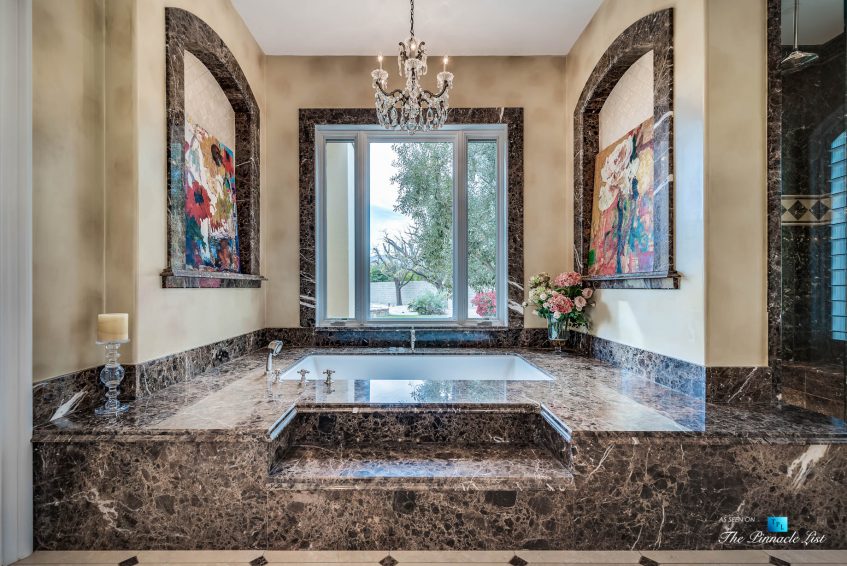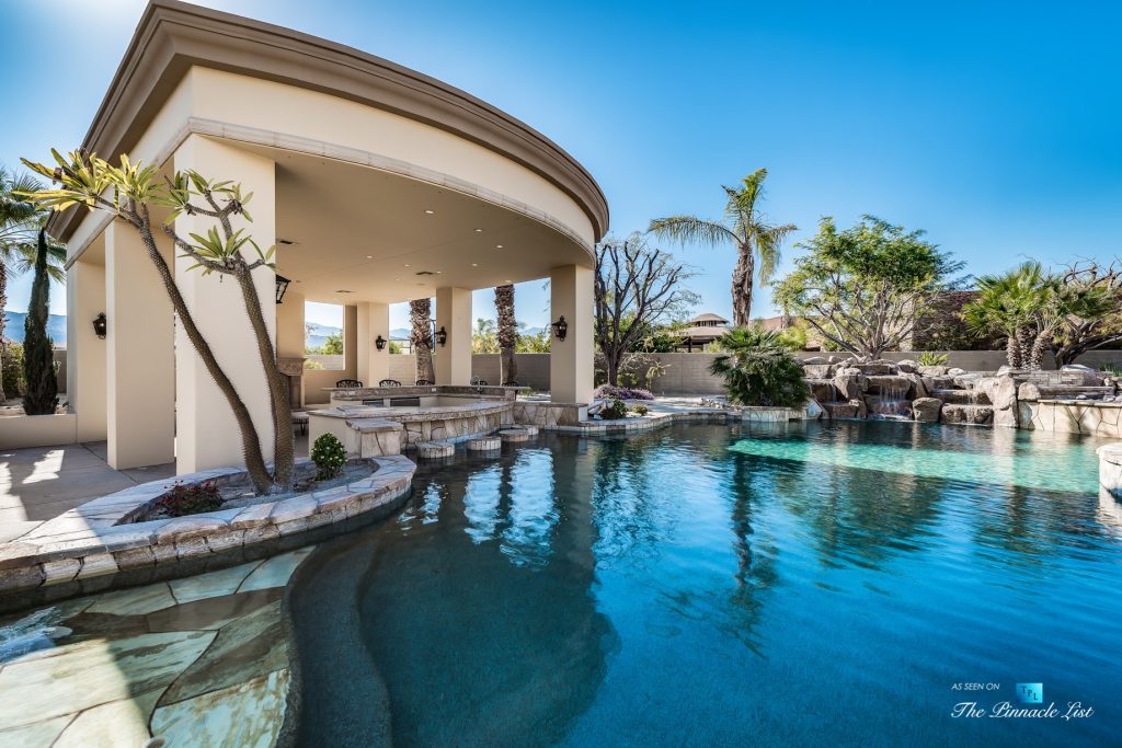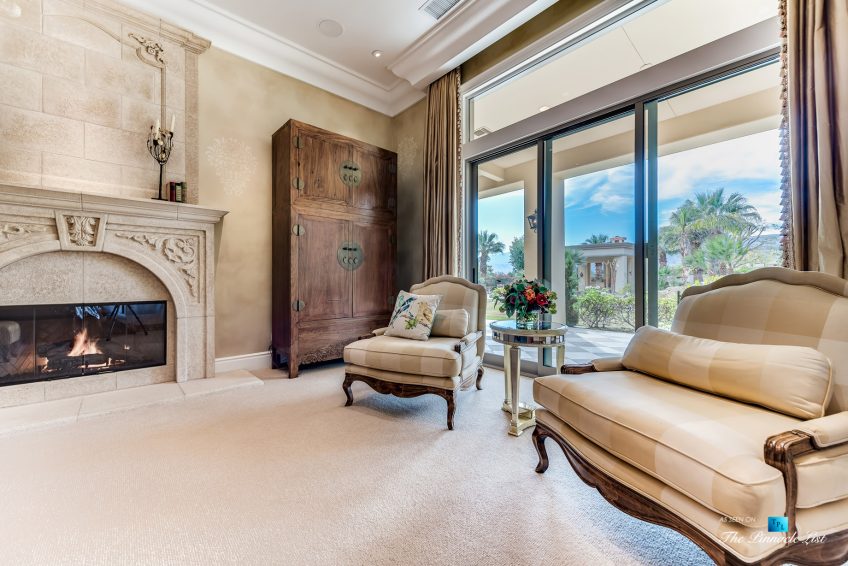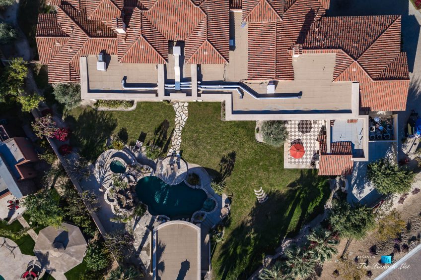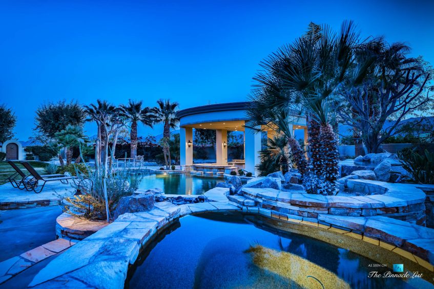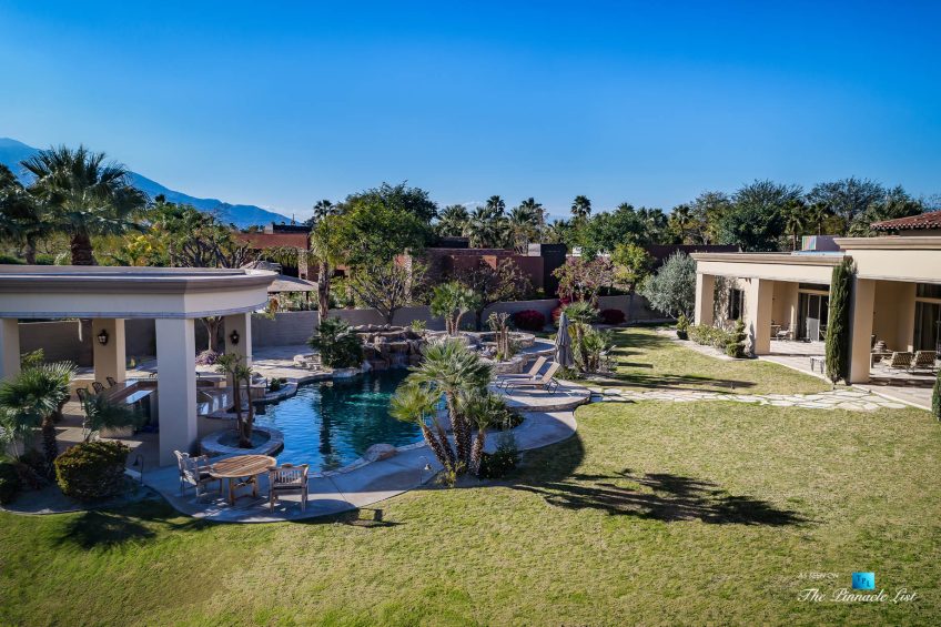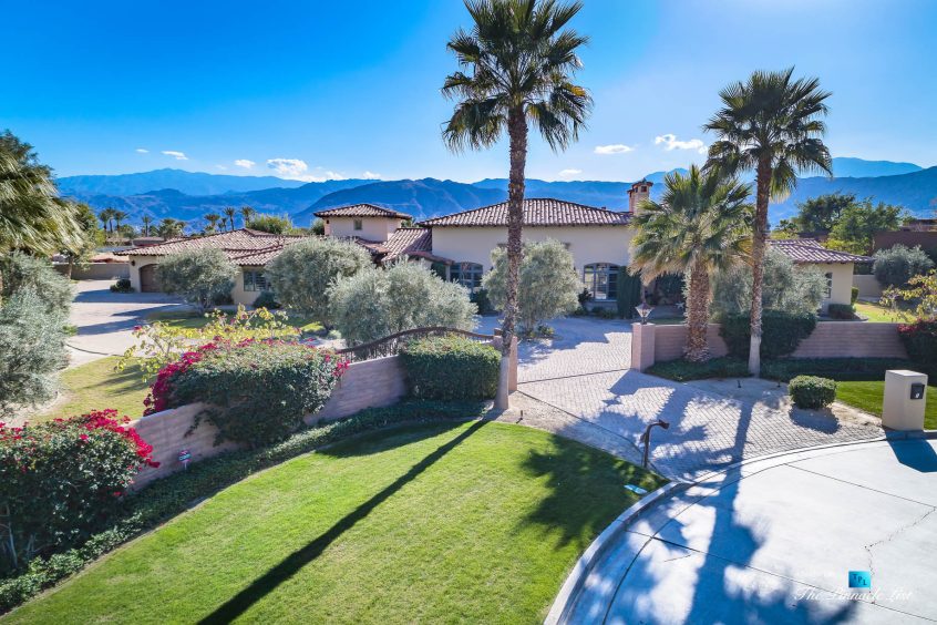 Private gated estate in Rancho Mirage on over an acre of land. Mediterranean style estate with sensational sunny south facing views. Rotunda entry with room for a grand piano, formal living room with grand fireplace, formal dining room. Intimate library with a carved stone fireplace. Theater with projection system and tiered seating, surround sound, padded walls, popcorn machine. Luxurious master suite with another carved stone fireplace, spa like double master baths and walk-in closets. Casita with a sitting room and spa like bath. All other bedrooms are en-suite. Expansive grounds and Wynn Las Vegas style pool with swim up bar, covered outdoor kitchen/entertainment pavilion with outside air conditionings and 5 car garage.