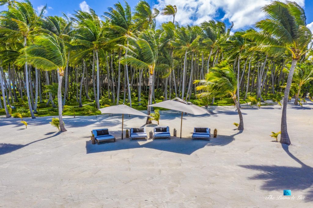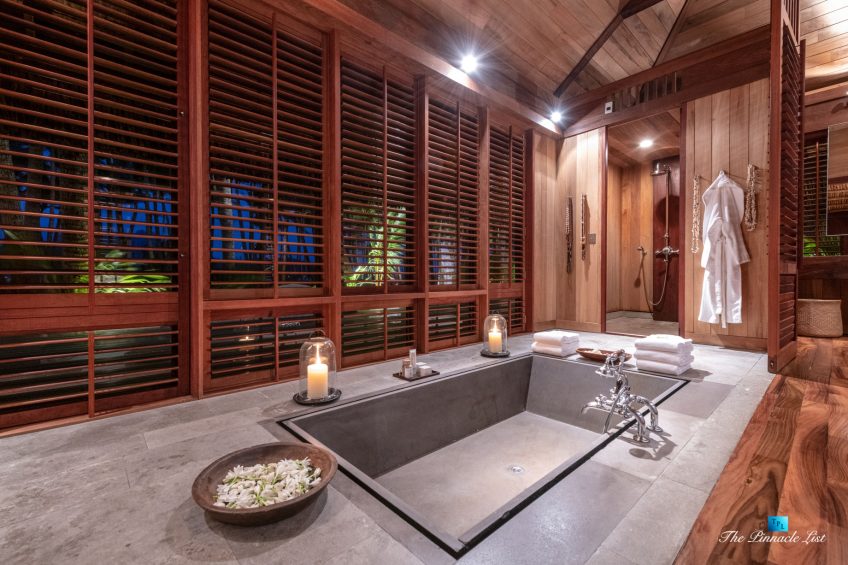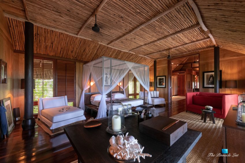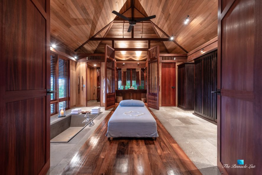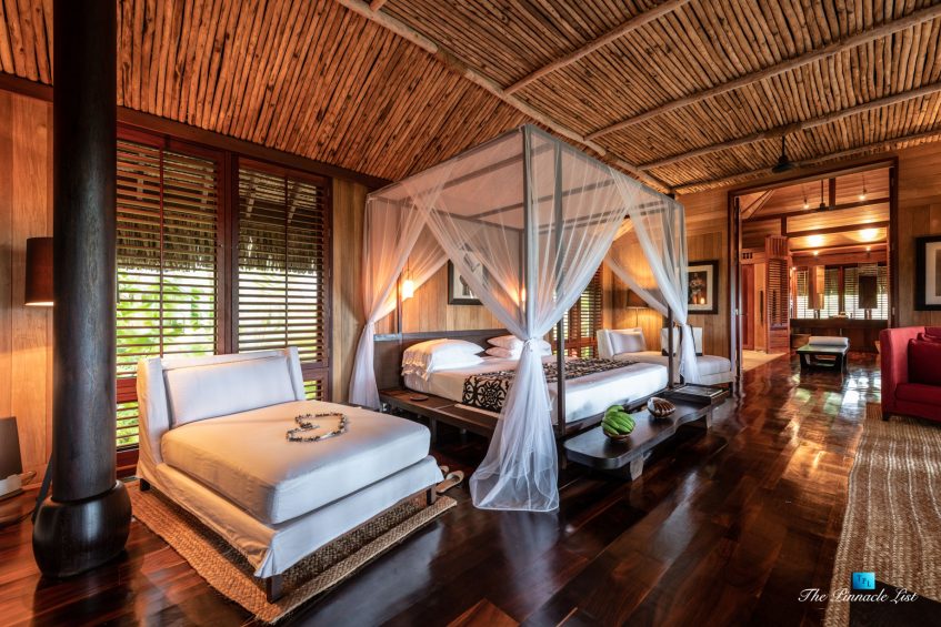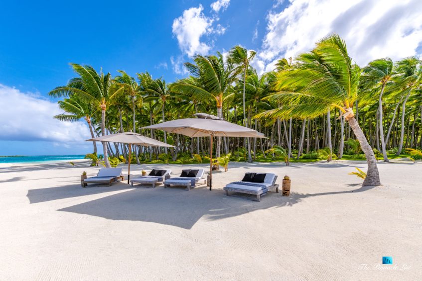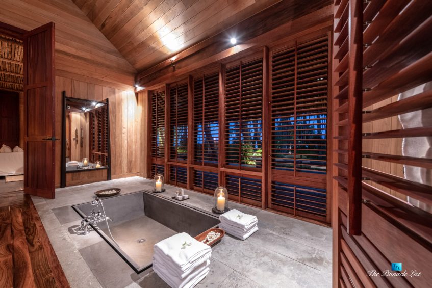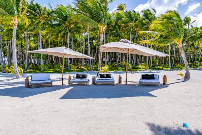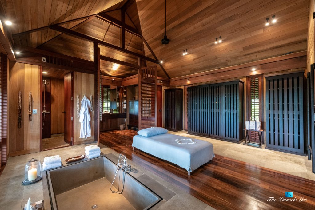 The estate’s crown jewels are two master suites, each sprawling over 2,500 square feet of meticulously designed space. These sanctuaries boast lavish sunken lava stone bathtubs, expansive showers, and bespoke dressing areas, with each window framing the breathtaking views of the lush gardens, pristine beaches, and the majestic main island beyond. The island accommodates guests in unparalleled luxury with 9 exquisite beach bungalows and 2 additional suites, designed to host up to 20 guests in sumptuous comfort.