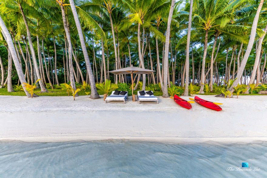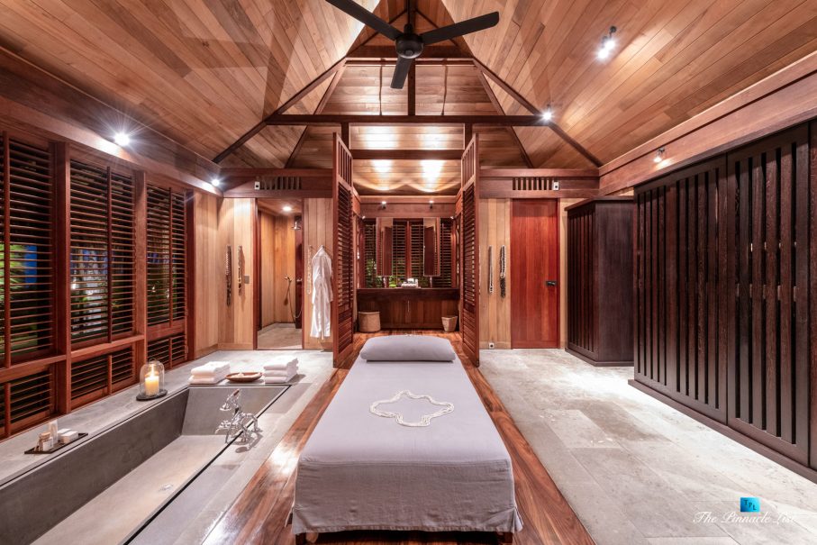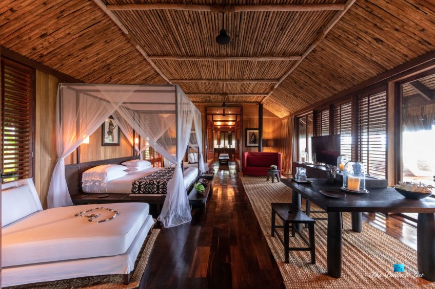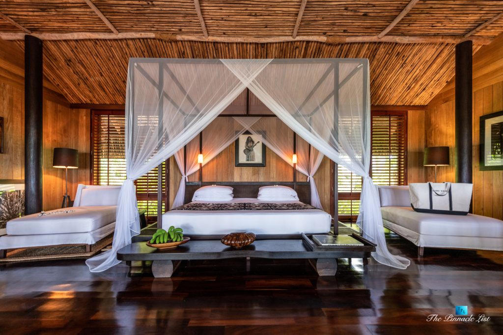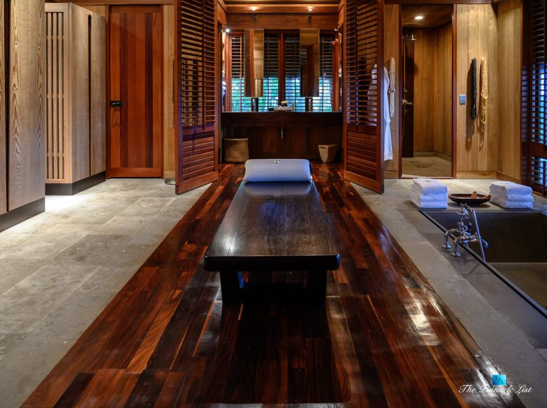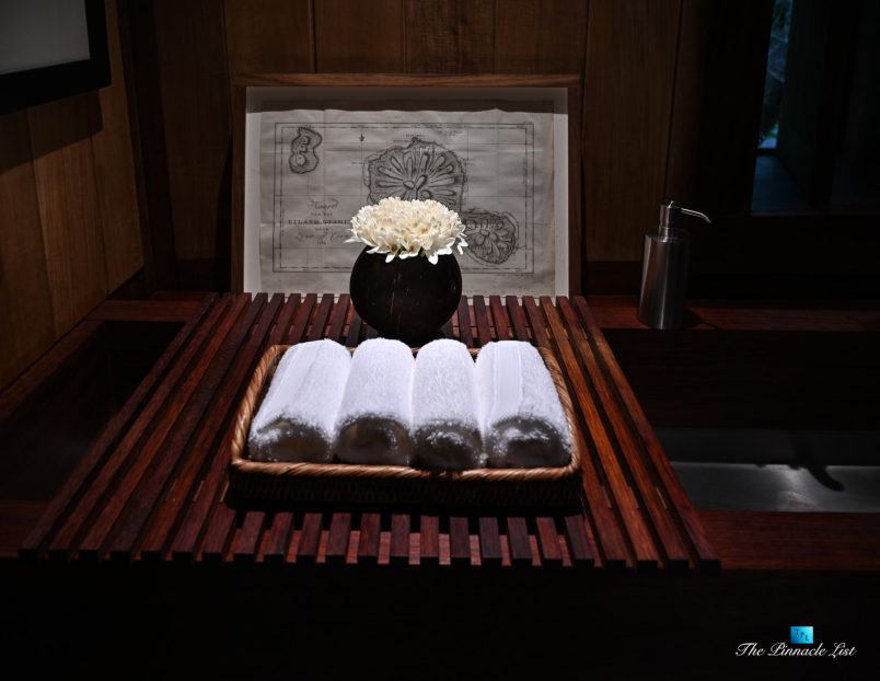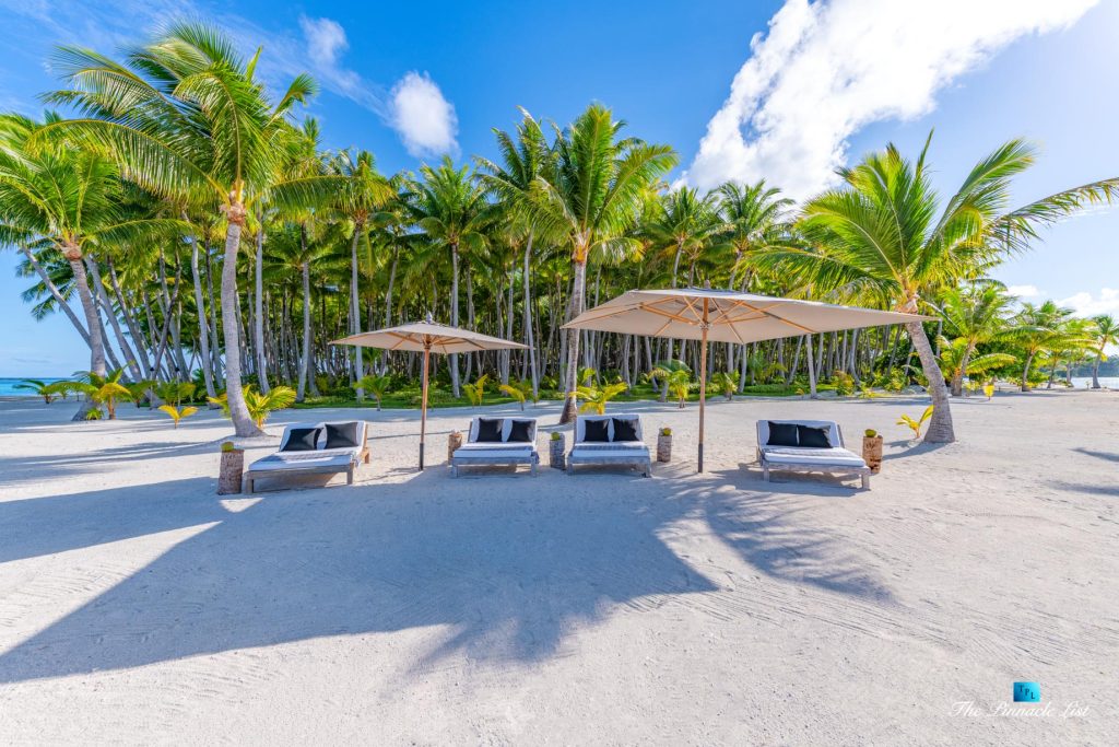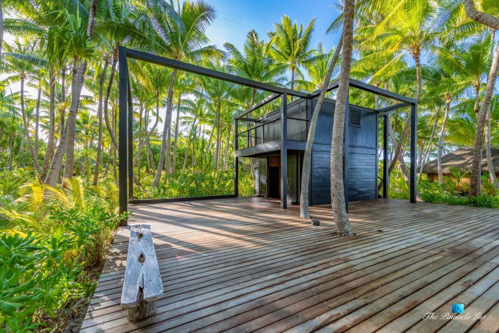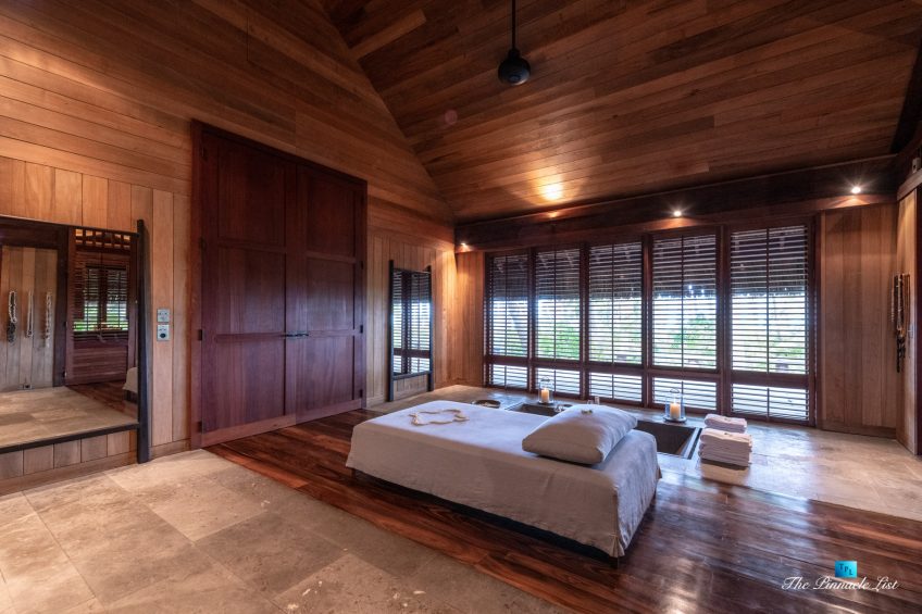 The estate’s crown jewels are two master suites, each sprawling over 2,500 square feet of meticulously designed space. These sanctuaries boast lavish sunken lava stone bathtubs, expansive showers, and bespoke dressing areas, with each window framing the breathtaking views of the lush gardens, pristine beaches, and the majestic main island beyond. The island accommodates guests in unparalleled luxury with 9 exquisite beach bungalows and 2 additional suites, designed to host up to 20 guests in sumptuous comfort.