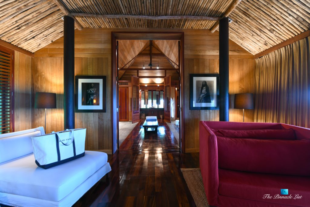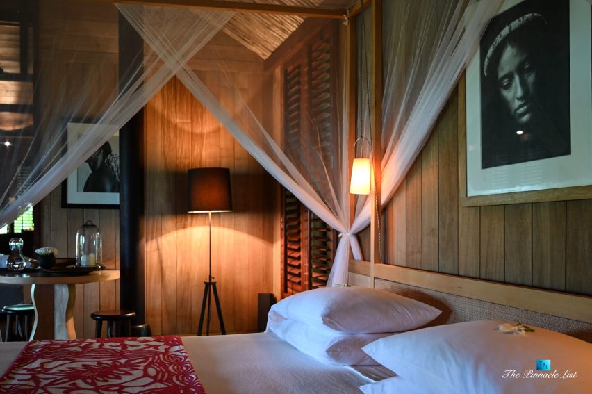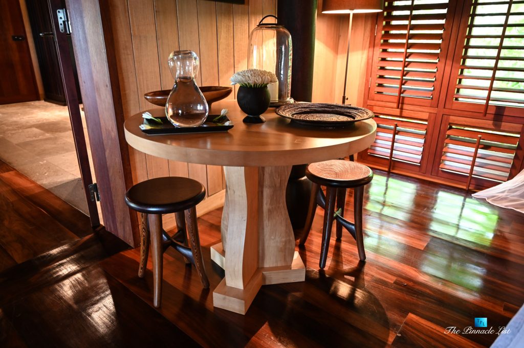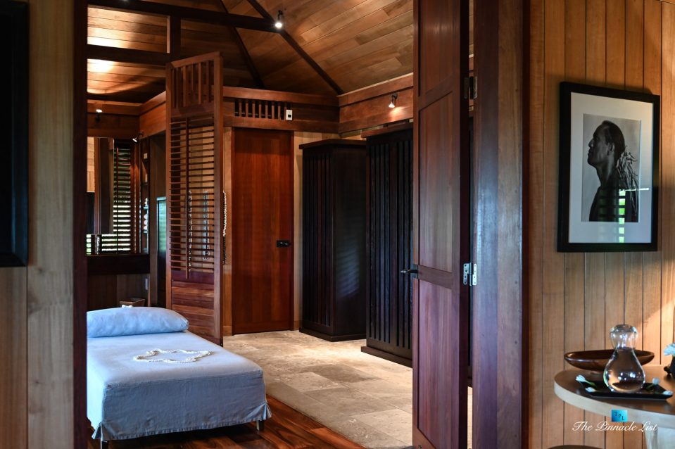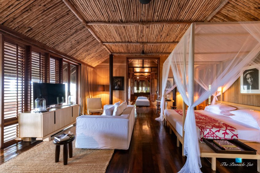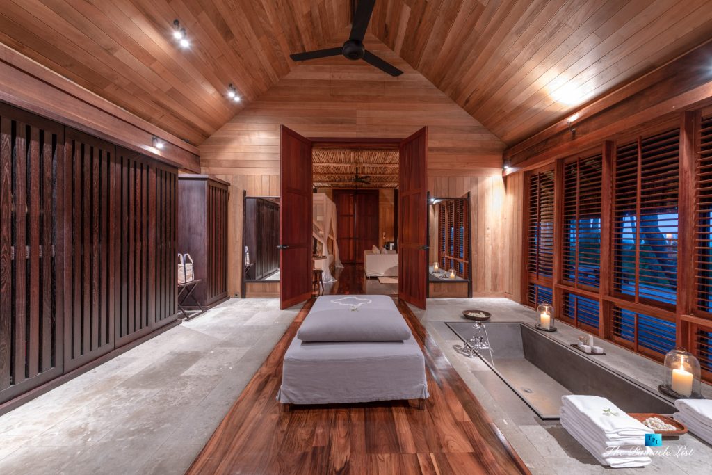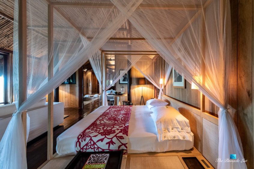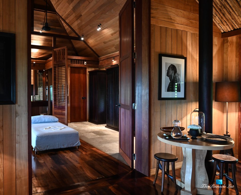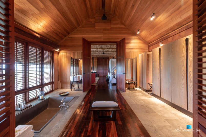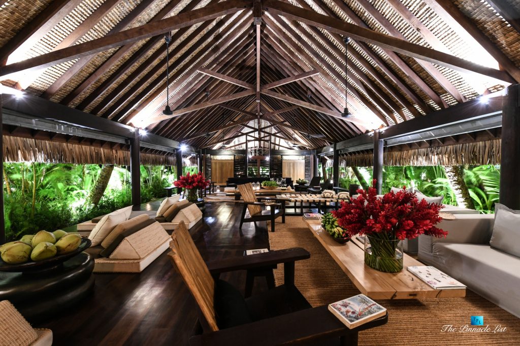 The grand room, an expansive space designed for both elegant gatherings and intimate soirées, is accompanied by a dining area equipped with a discreet wet bar and two large, custom-made tables capable of welcoming up to 36 guests in a setting of unparalleled grace and sophistication. Designed by the world-renowned Christian Liaigre, the interiors are a symphony of exclusive craftsmanship, with furniture custom-made from rare tropical woods and natural fabrics, enhancing the connection between luxury and the serenity of island life. Motorized screens in most bungalows offer the versatility to merge indoor opulence with the natural allure of the outdoors, providing a unique shelter against the elements when necessary.