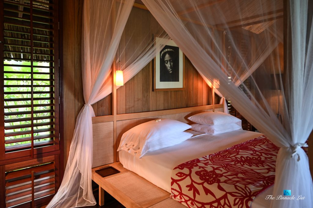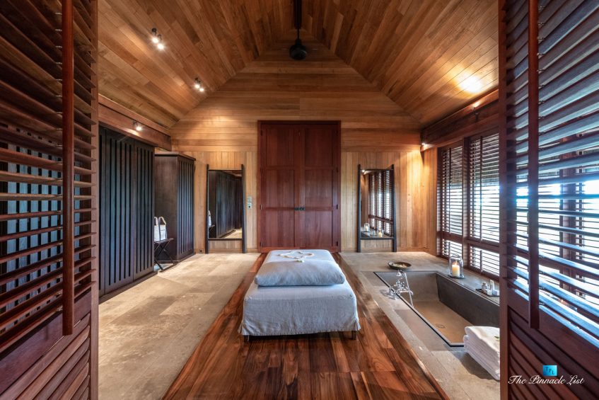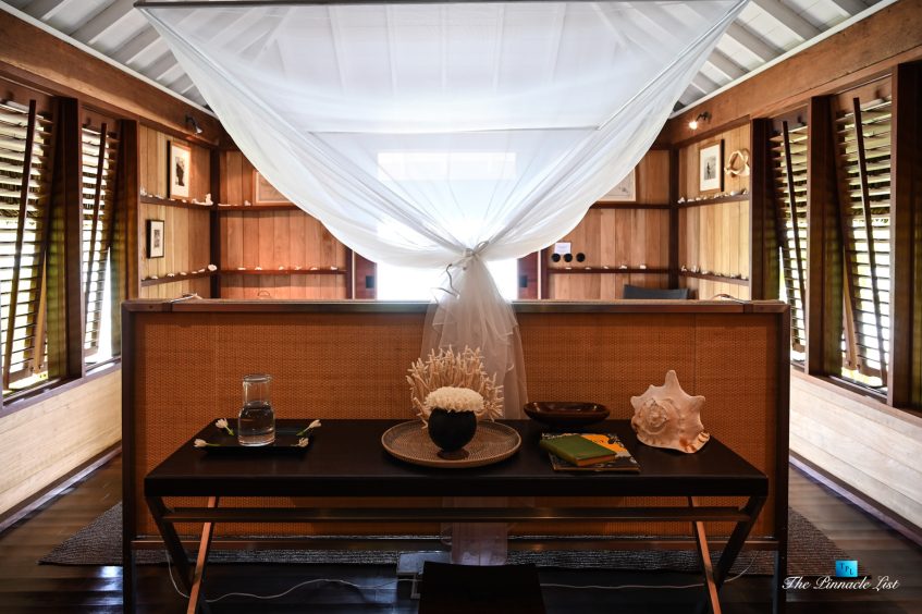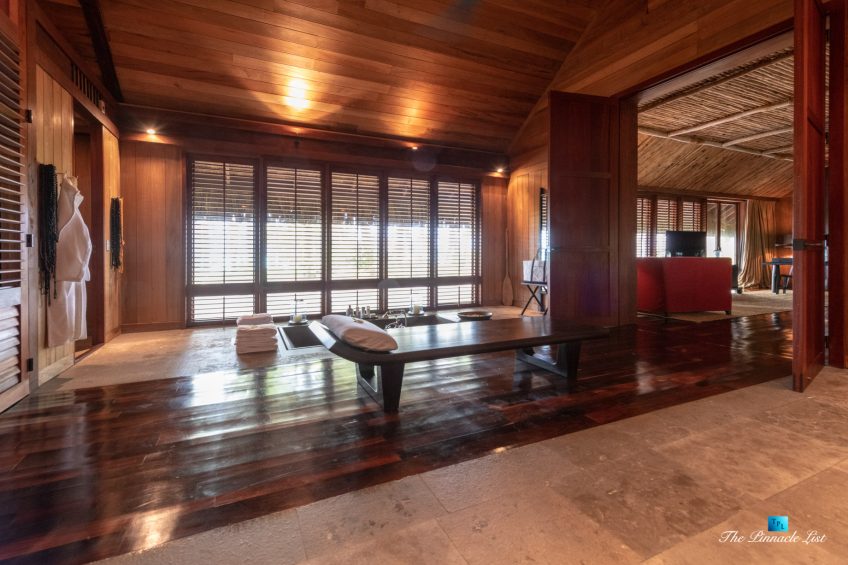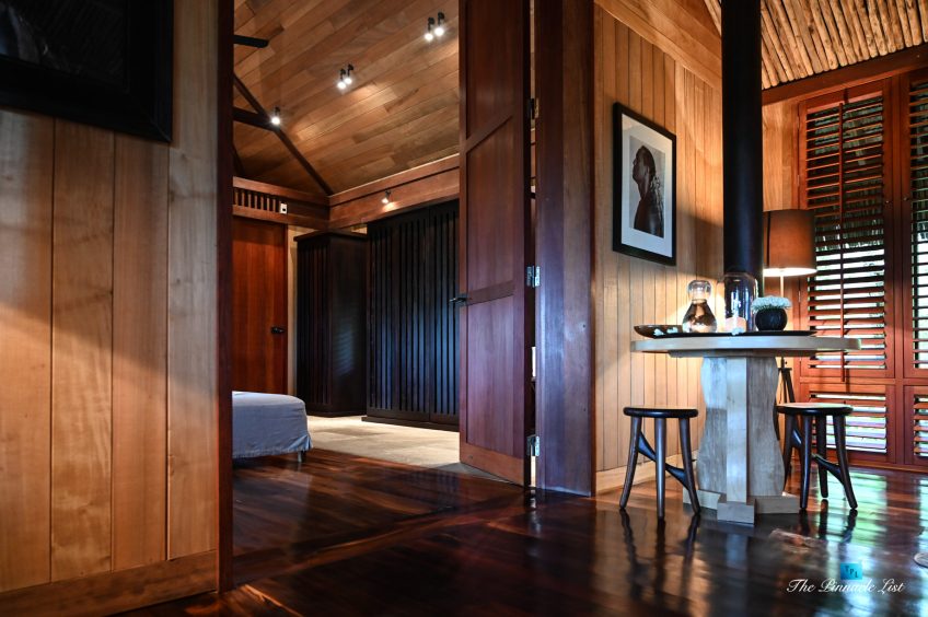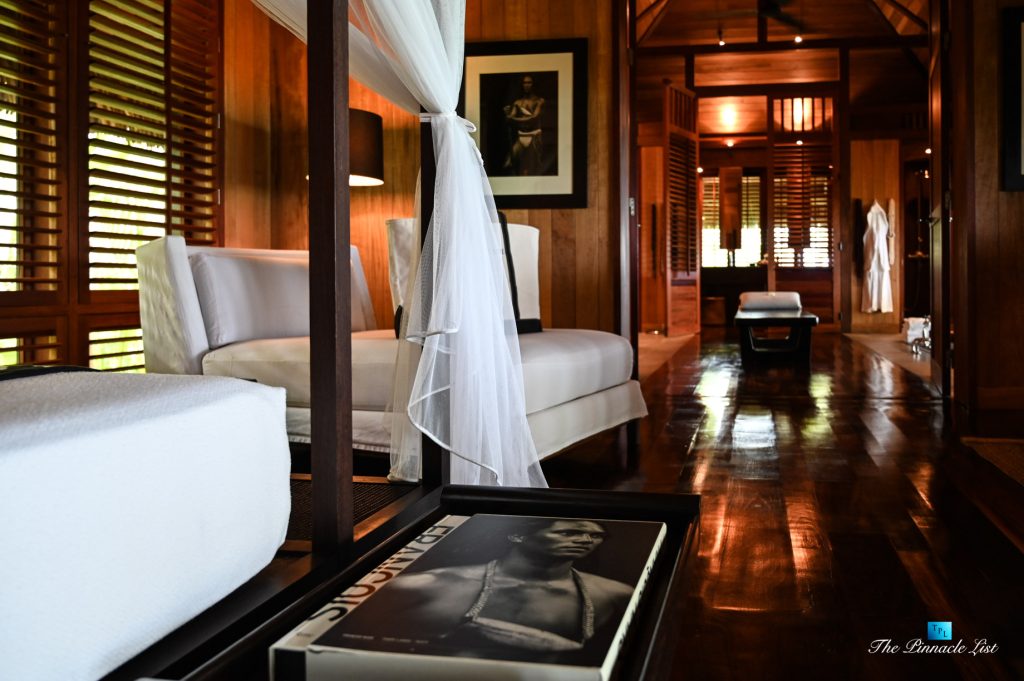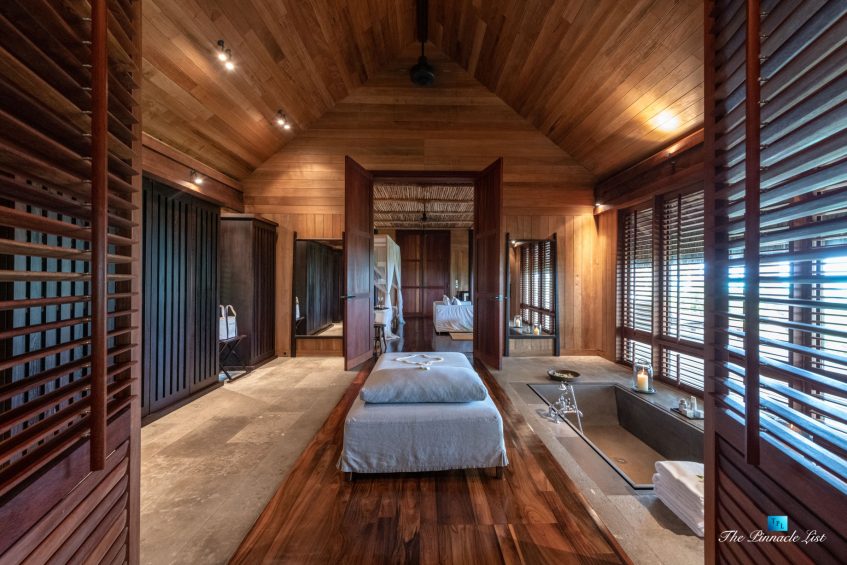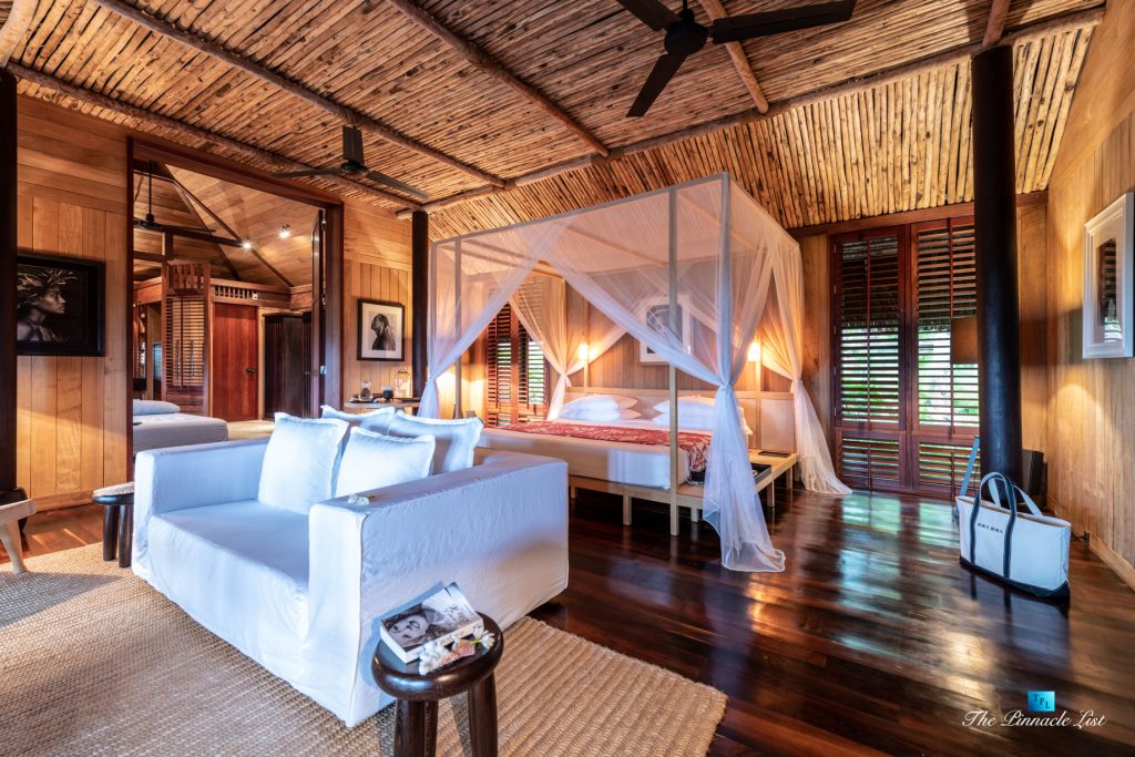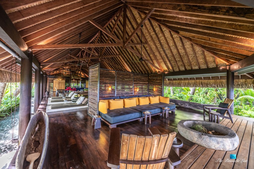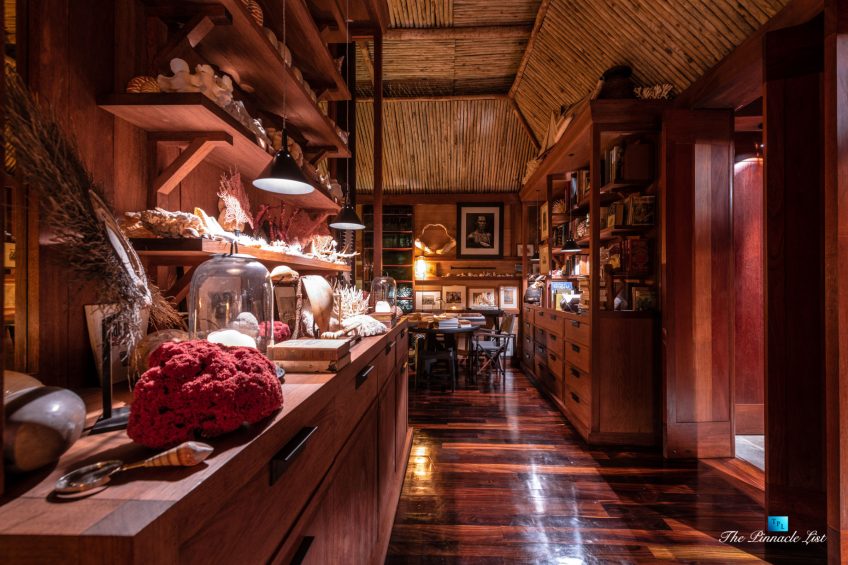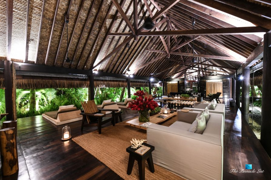 The grand room, an expansive space designed for both elegant gatherings and intimate soirées, is accompanied by a dining area equipped with a discreet wet bar and two large, custom-made tables capable of welcoming up to 36 guests in a setting of unparalleled grace and sophistication. Designed by the world-renowned Christian Liaigre, the interiors are a symphony of exclusive craftsmanship, with furniture custom-made from rare tropical woods and natural fabrics, enhancing the connection between luxury and the serenity of island life. Motorized screens in most bungalows offer the versatility to merge indoor opulence with the natural allure of the outdoors, providing a unique shelter against the elements when necessary.
