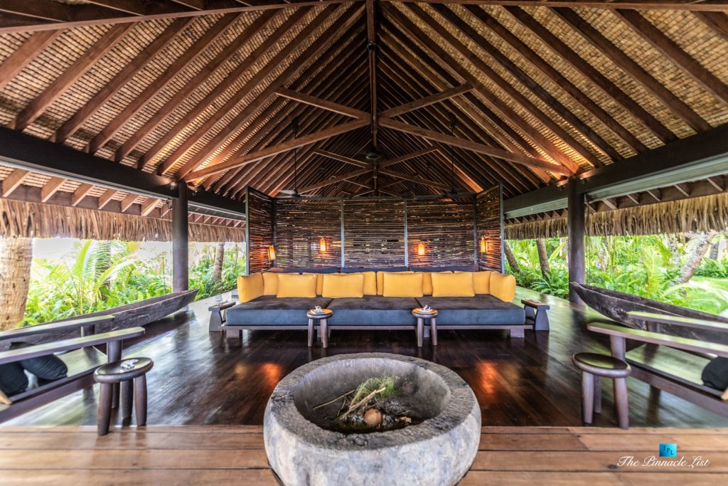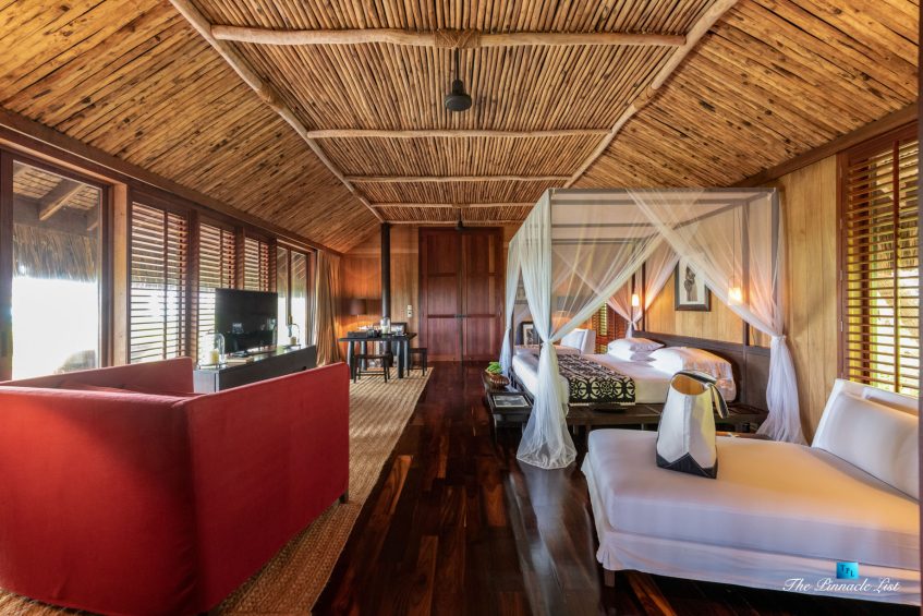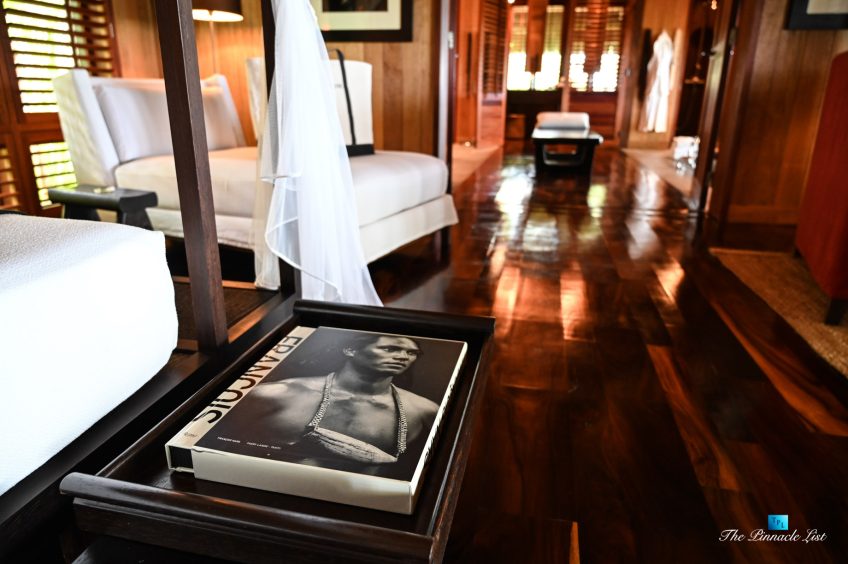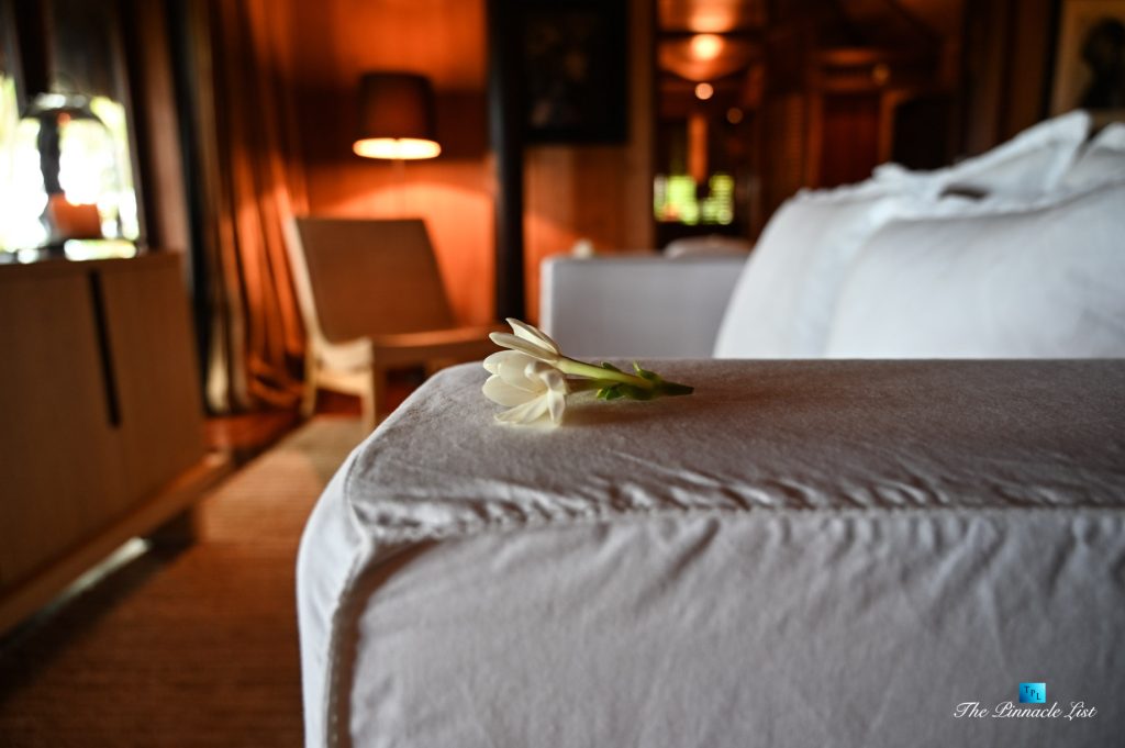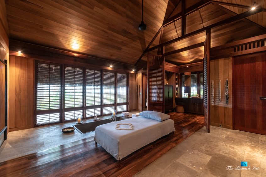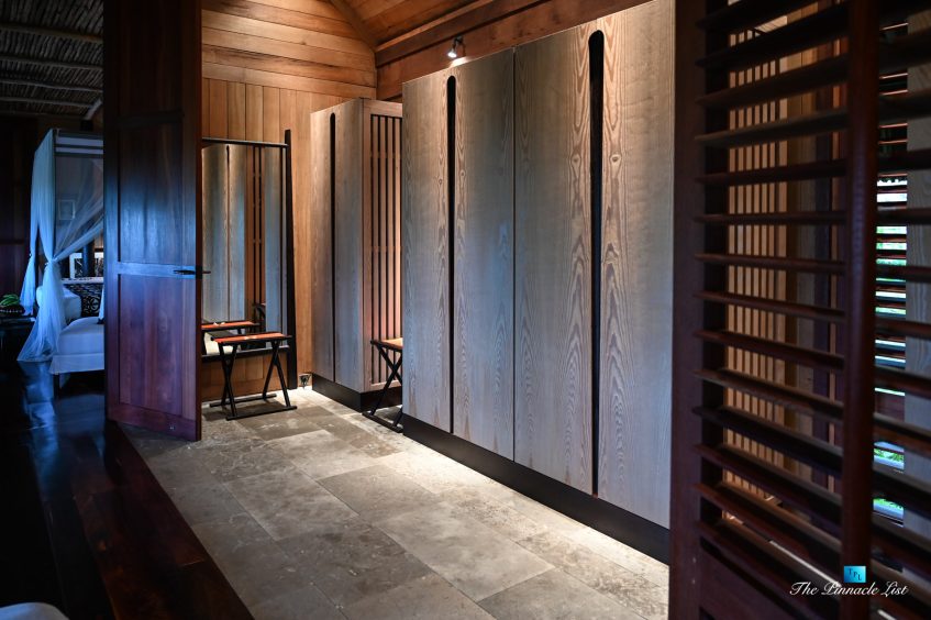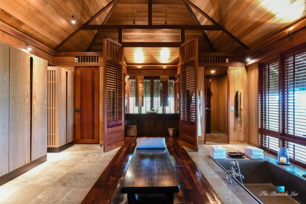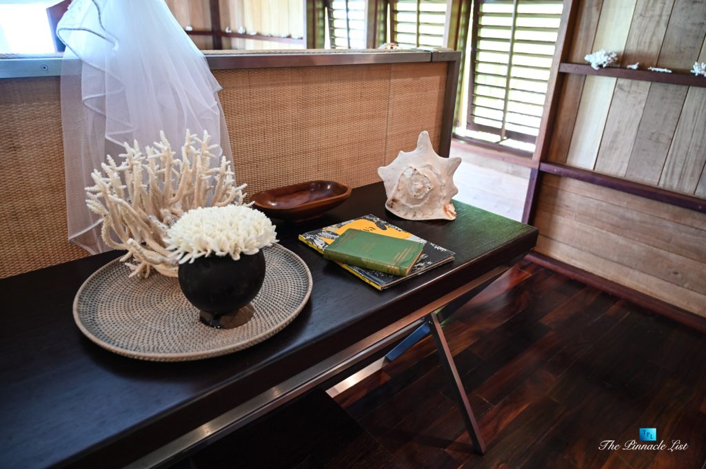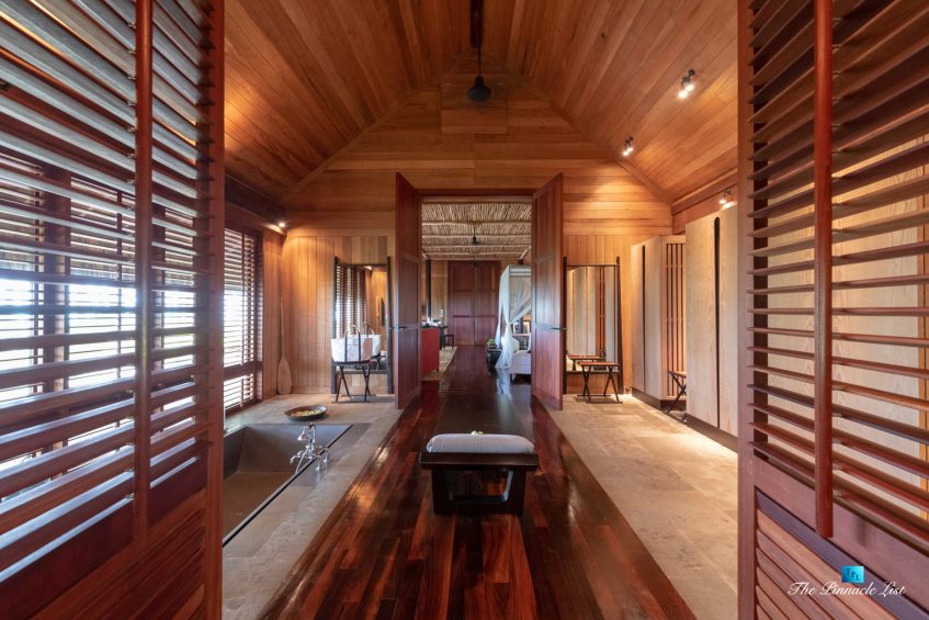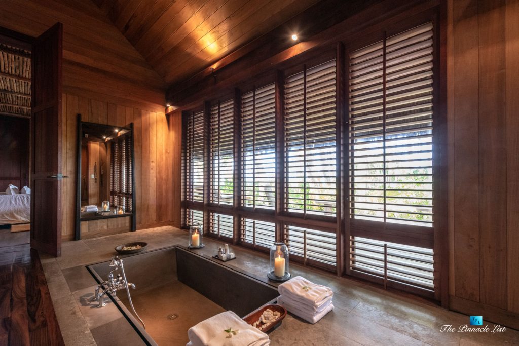 The grand room, an expansive space designed for both elegant gatherings and intimate soirées, is accompanied by a dining area equipped with a discreet wet bar and two large, custom-made tables capable of welcoming up to 36 guests in a setting of unparalleled grace and sophistication. Designed by the world-renowned Christian Liaigre, the interiors are a symphony of exclusive craftsmanship, with furniture custom-made from rare tropical woods and natural fabrics, enhancing the connection between luxury and the serenity of island life. Motorized screens in most bungalows offer the versatility to merge indoor opulence with the natural allure of the outdoors, providing a unique shelter against the elements when necessary.